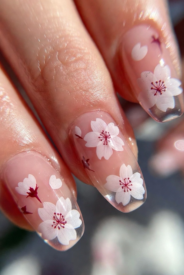 For a dreamy, airy vibe, choose a clear or milky base and scatter cherry blossoms across the nails. This gives the illusion that the flowers are gently drifting, creating a lightweight and ethereal design that never feels overwhelming.