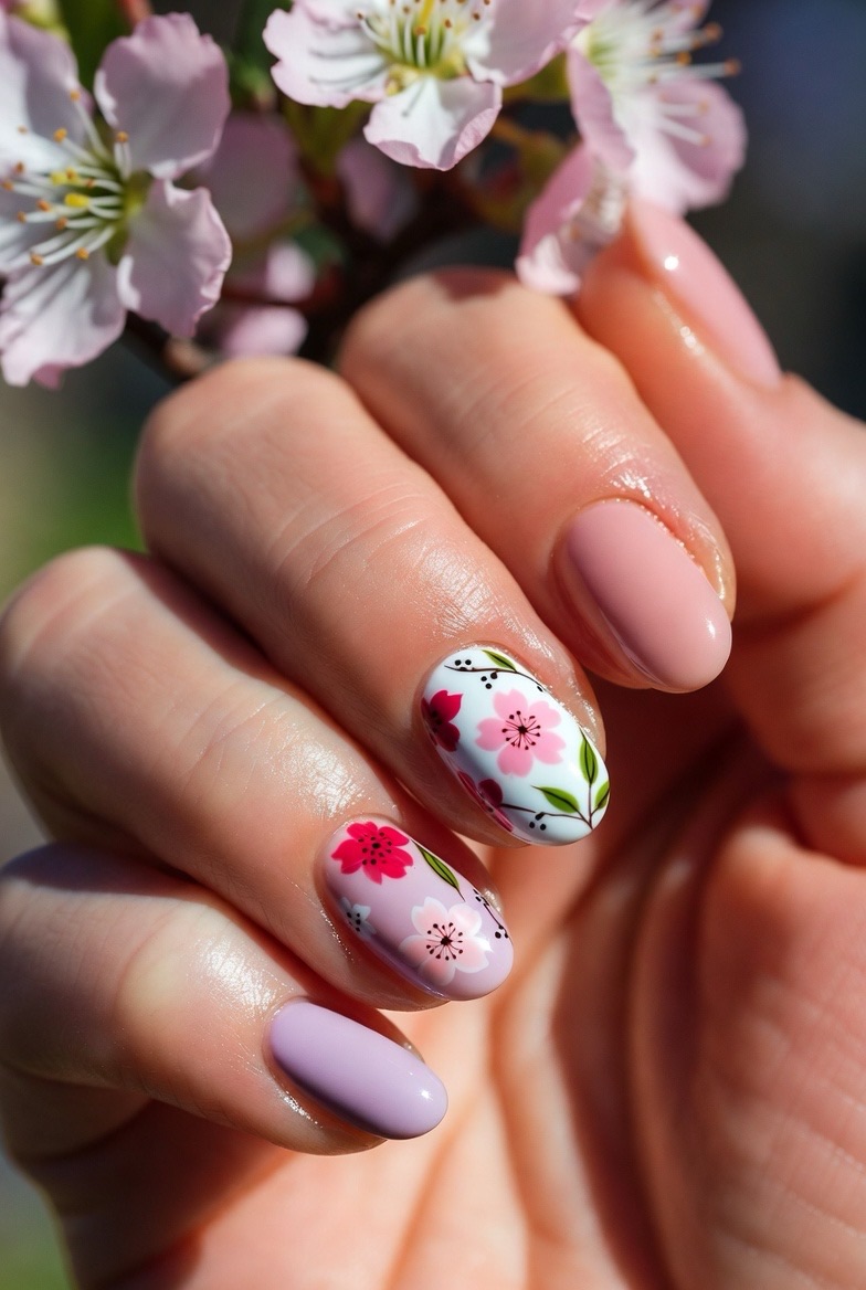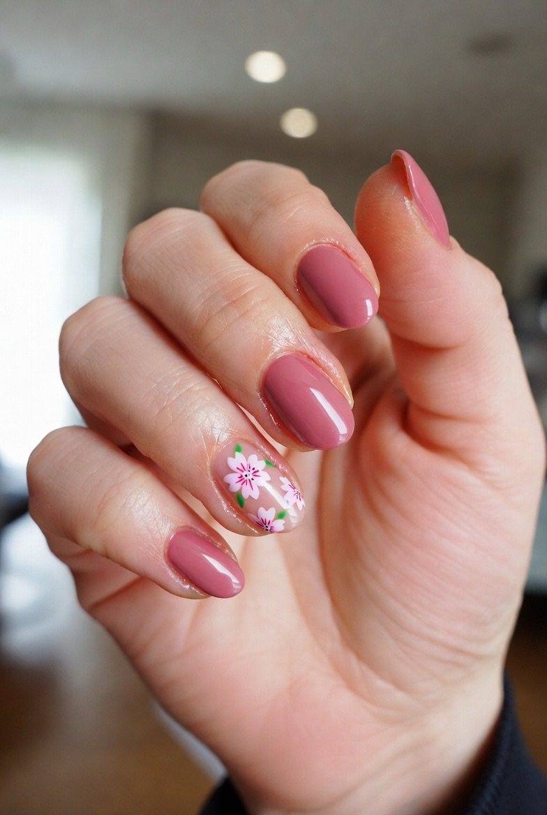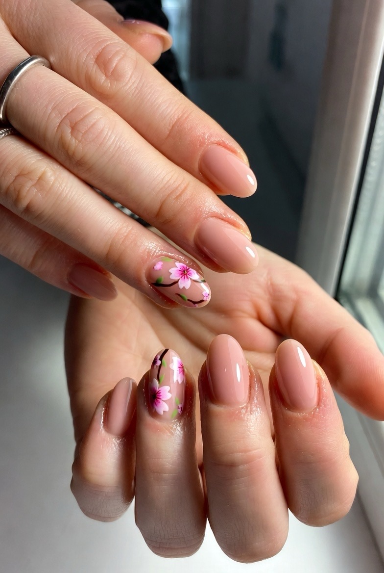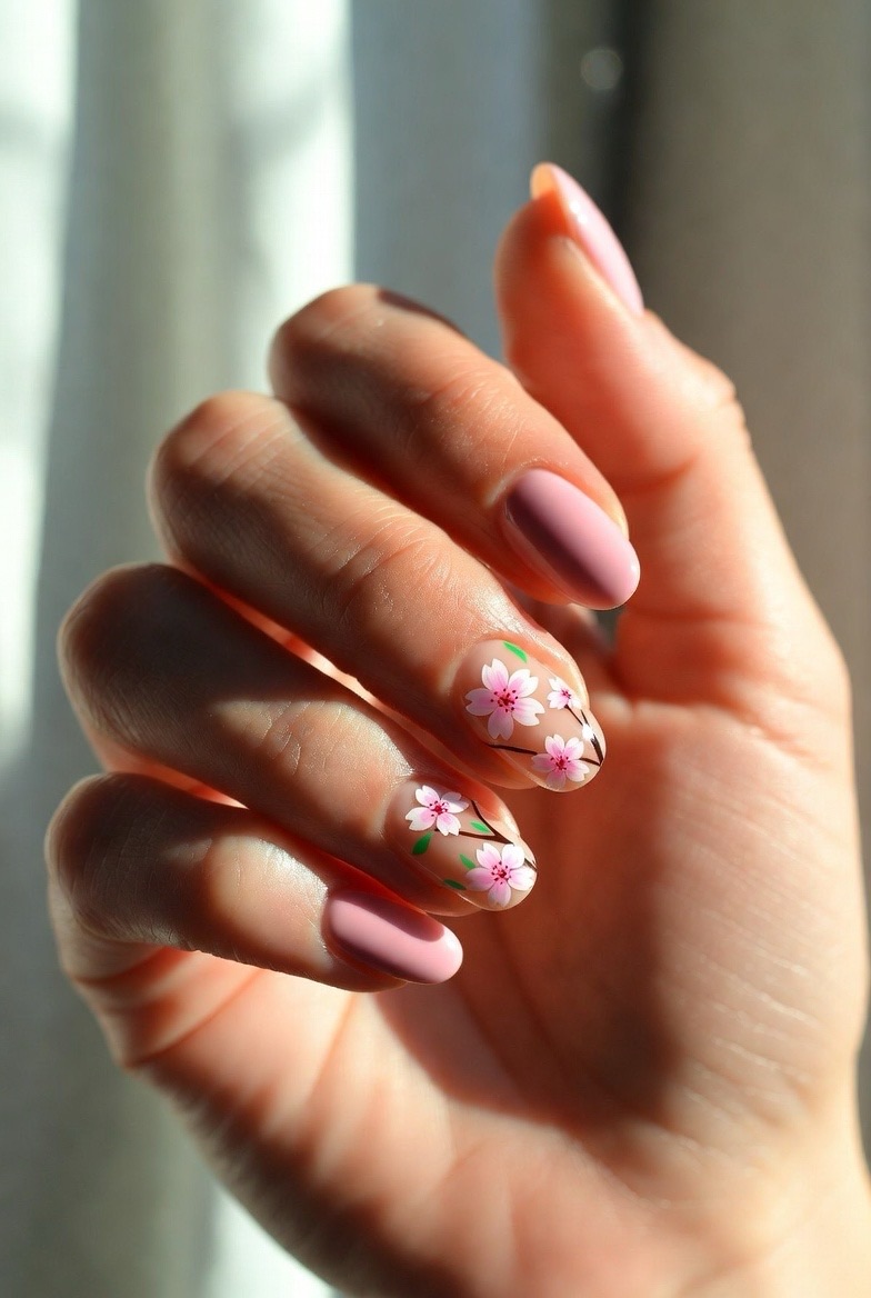 If you prefer minimal designs, try a solid color manicure paired with one detailed cherry blossom accent nail. It packs visual interest without feeling busy, and you can choose any complementary base shade, nude, blush, or even soft lavender.