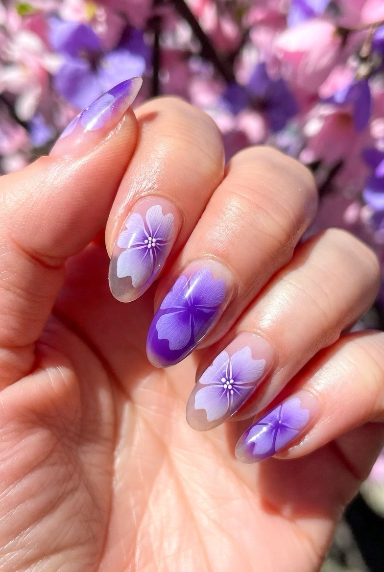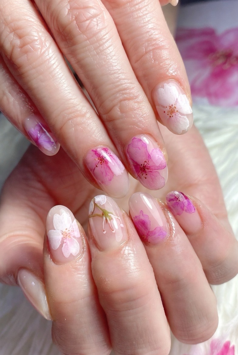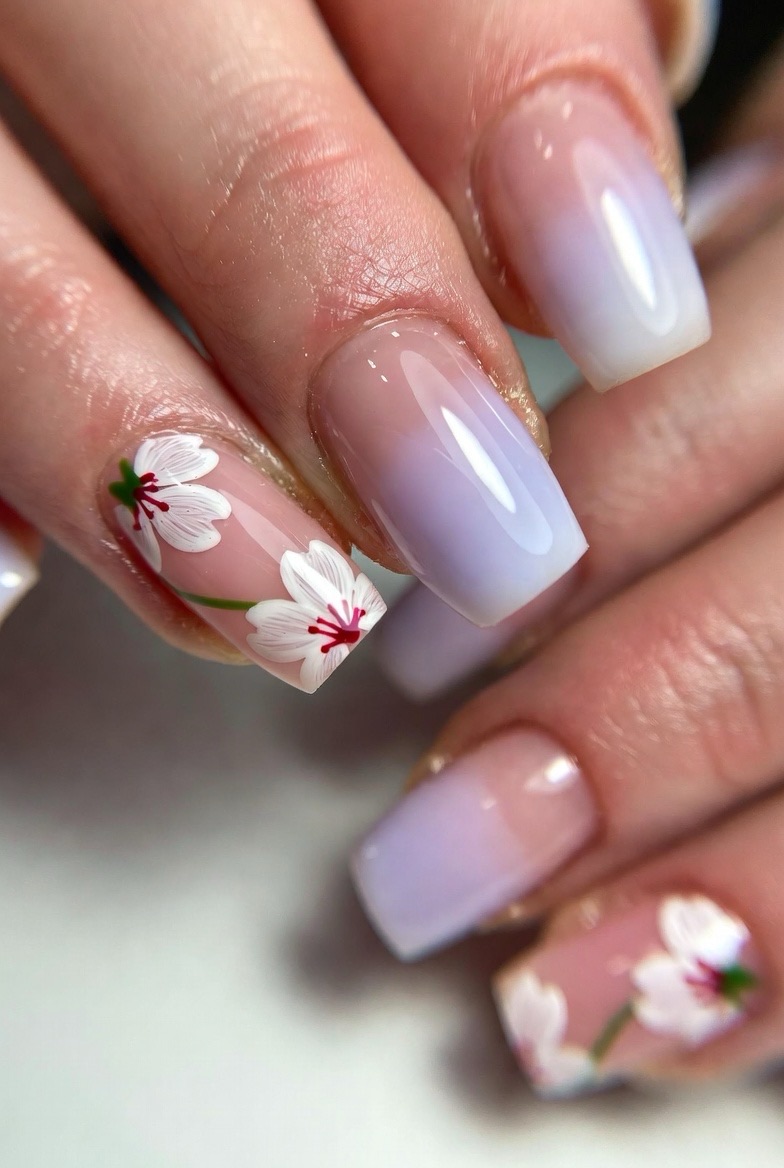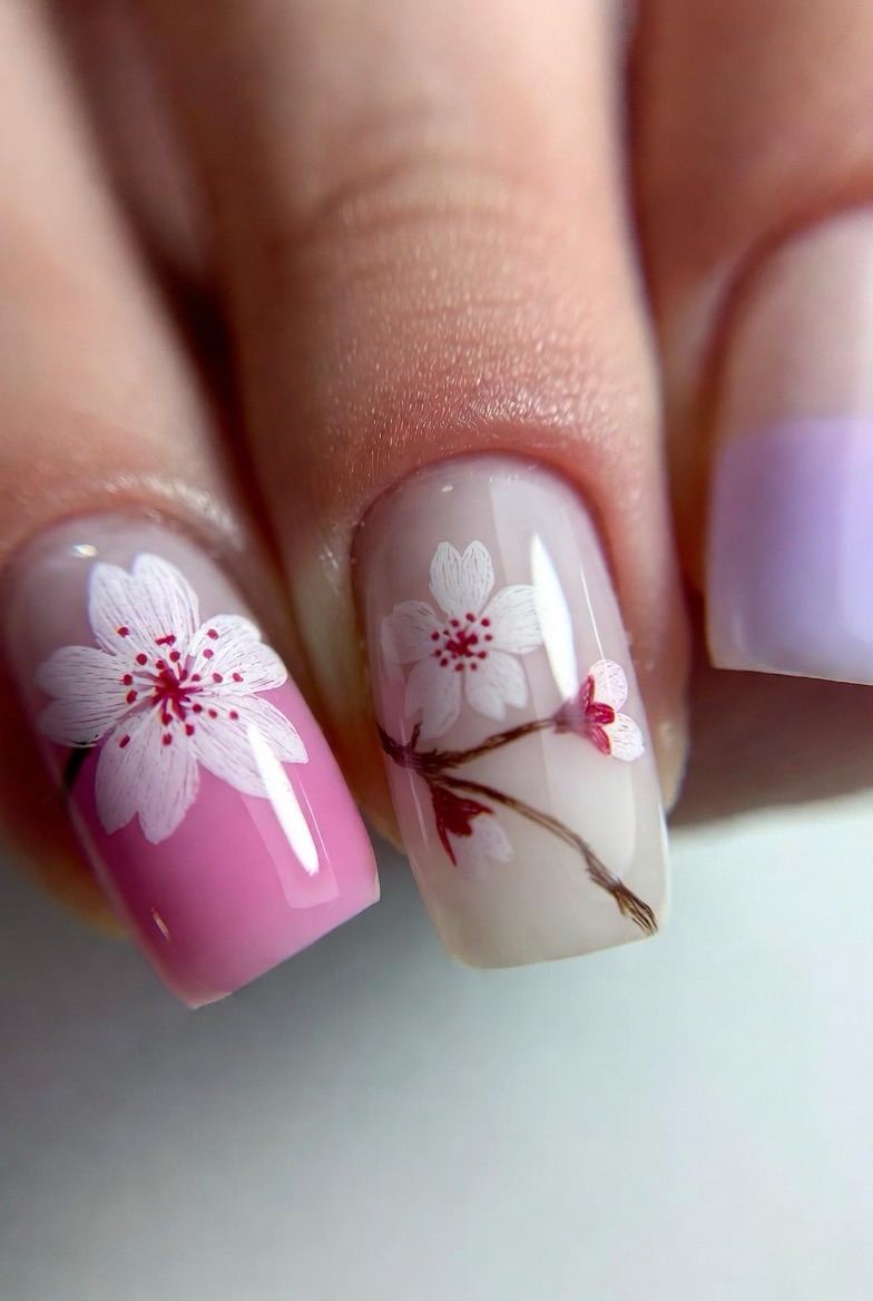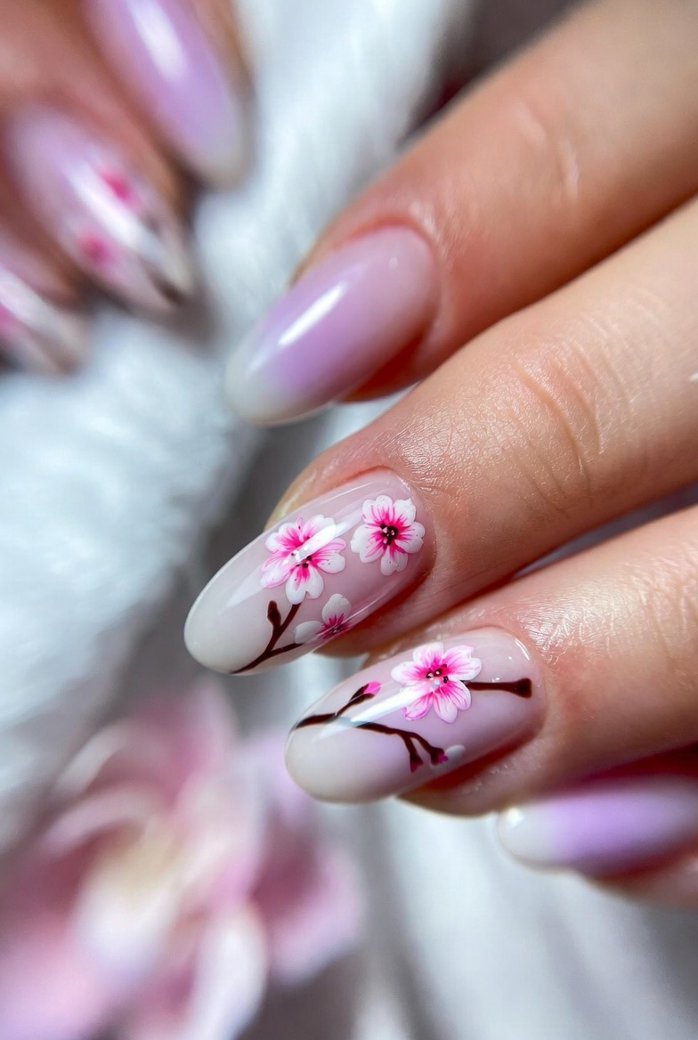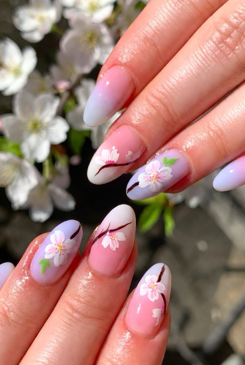 Soft ombre bases, pinks, whites, and purples, create the perfect canvas for cherry blossom details. This gradient effect adds depth and dimension, while the blossoms elevate the look with gentle floral elegance.