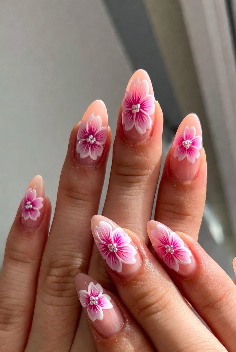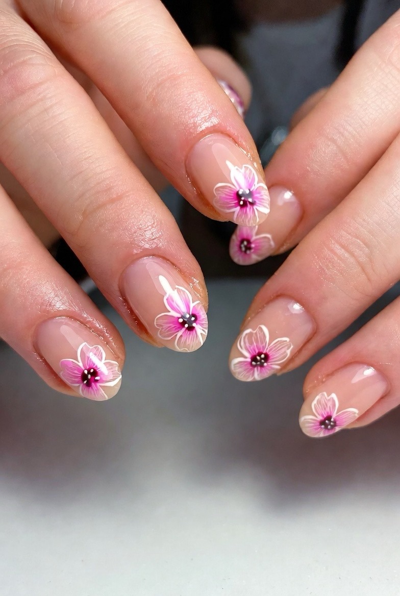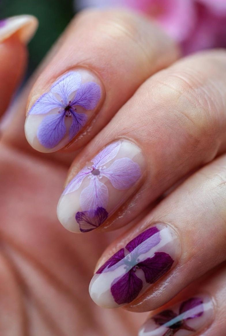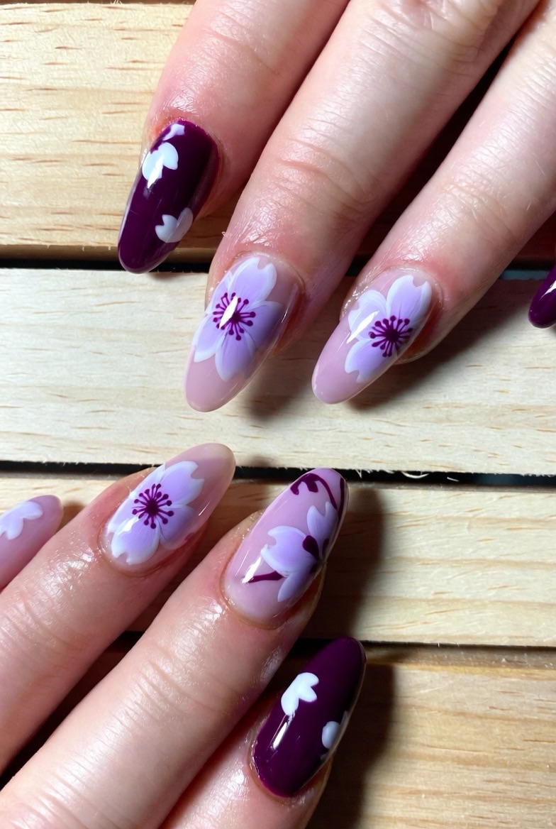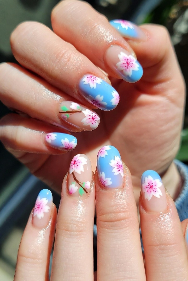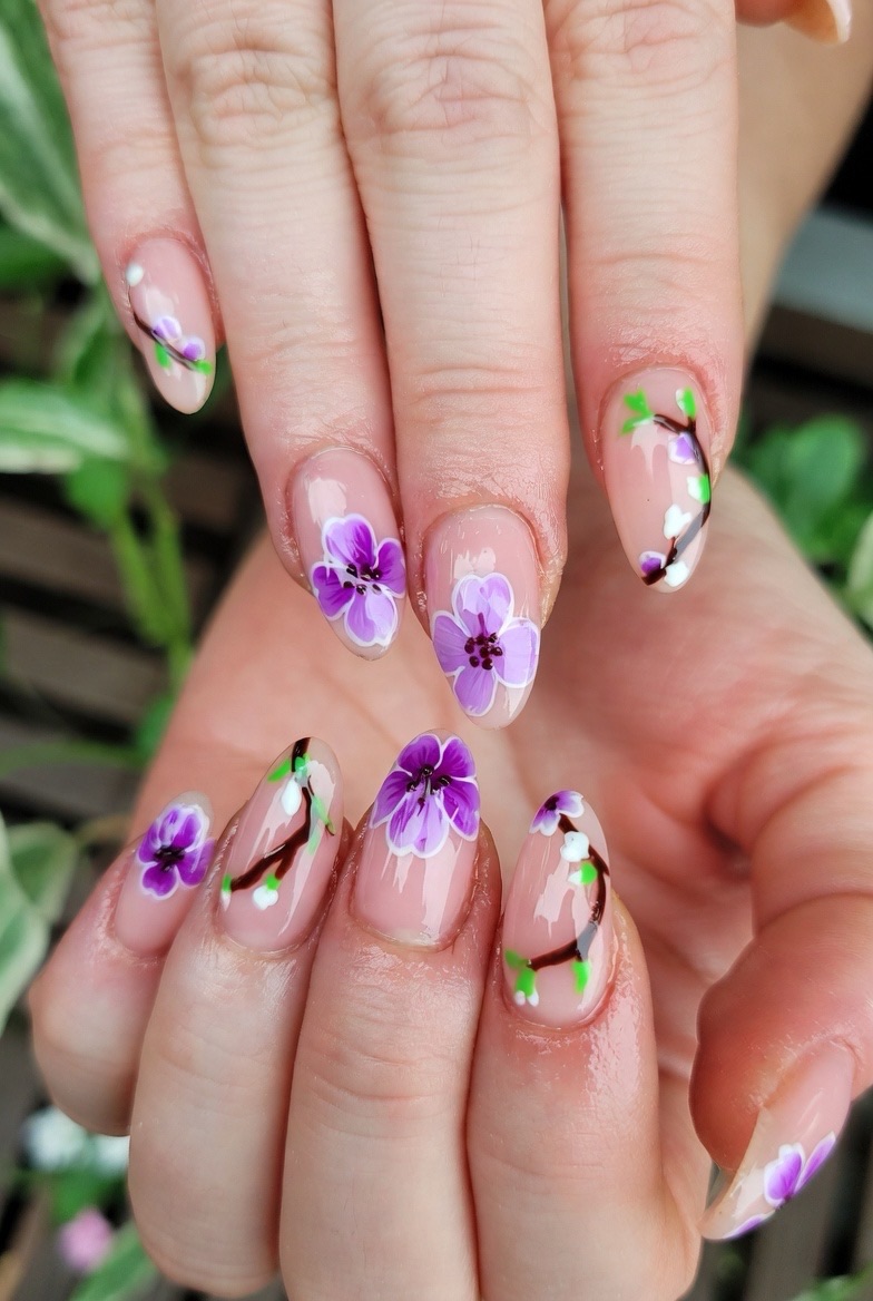 Soft ombre bases, pinks, whites, and purples, create the perfect canvas for cherry blossom details. This gradient effect adds depth and dimension, while the blossoms elevate the look with gentle floral elegance.