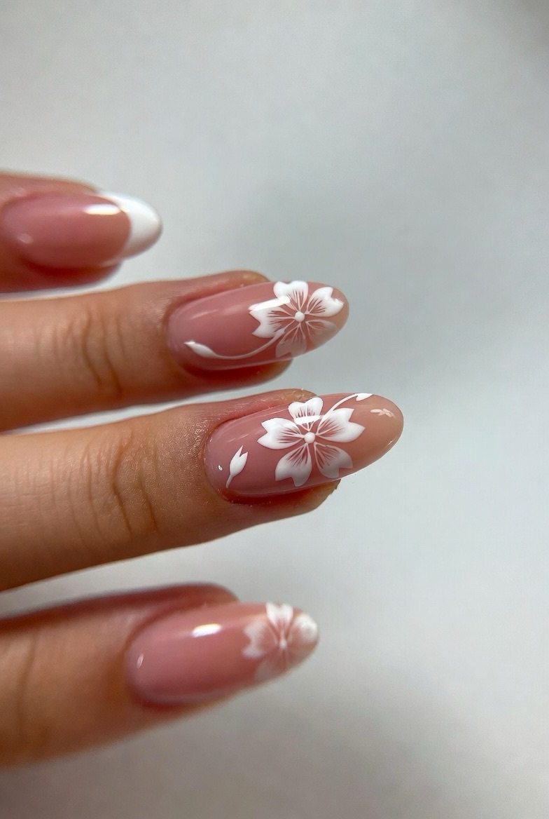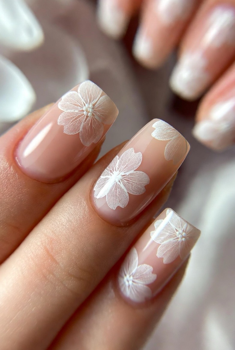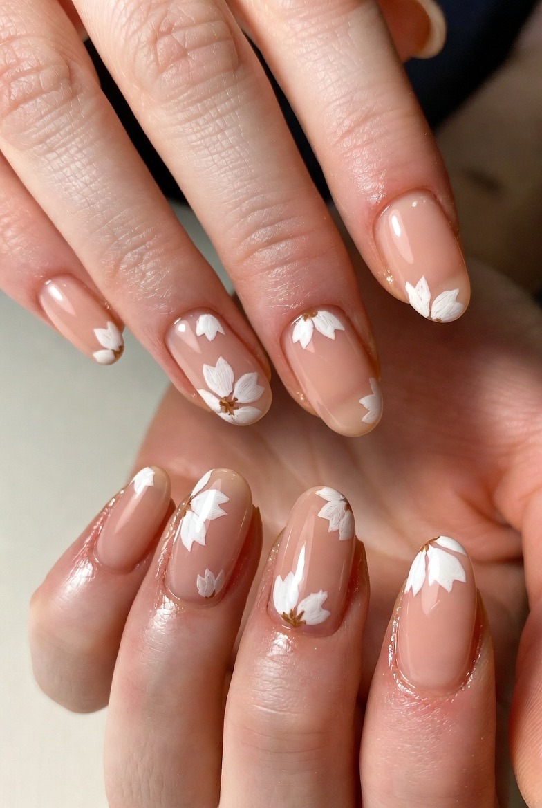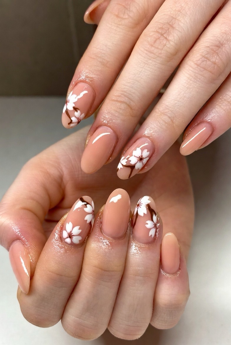 For a classy, minimalist aesthetic, choose nude nails decorated with white cherry blossom petals. The neutral palette keeps things chic, clean, and timeless, making this the ideal choice for weddings, work settings, or everyday sophistication.