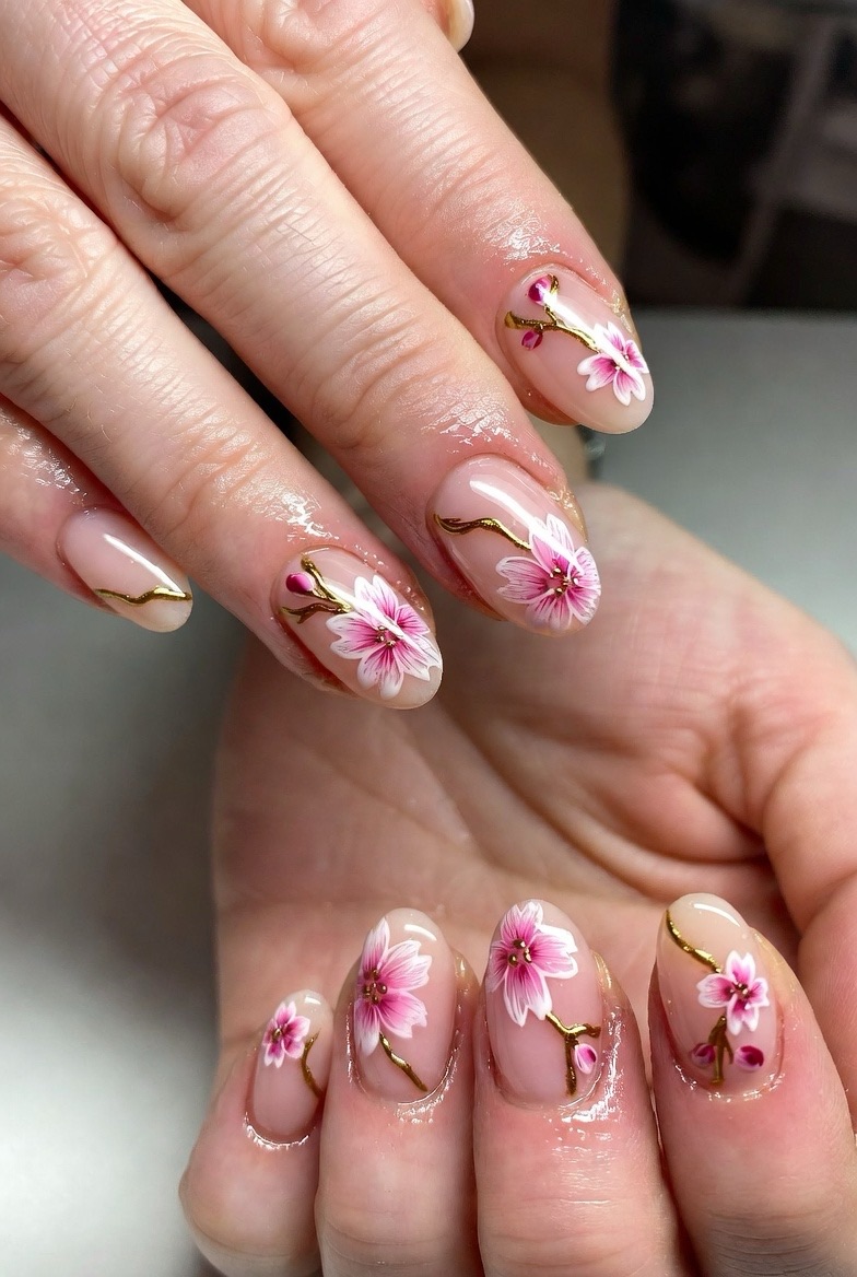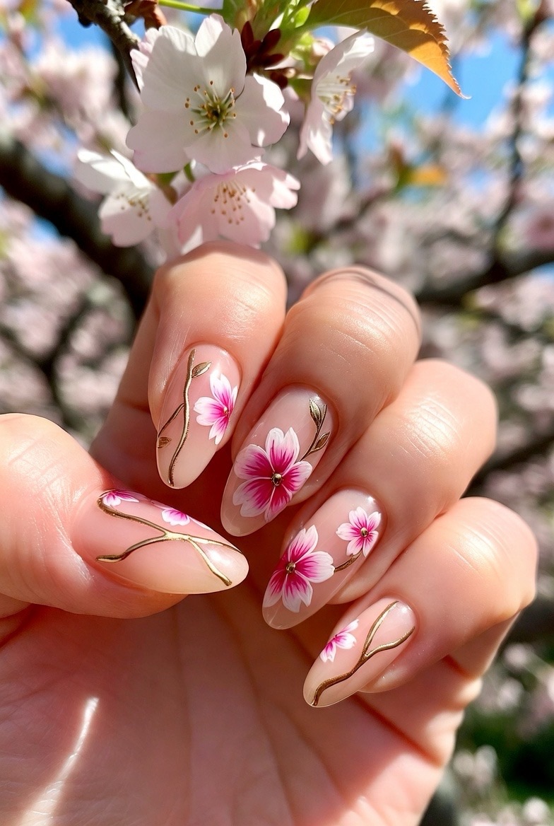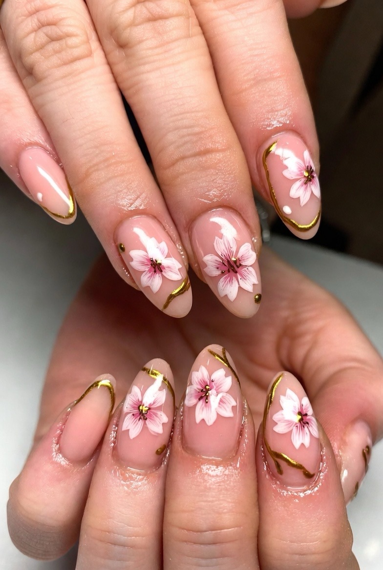 Upgrade traditional cherry blossom nails with gold-lined branches. The metallic details add a luxurious touch, making the floral artwork feel more glamorous, great for special events or when you want a bit of sparkle.