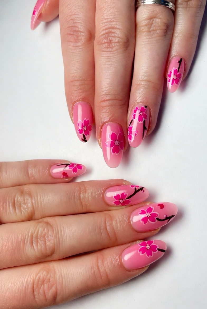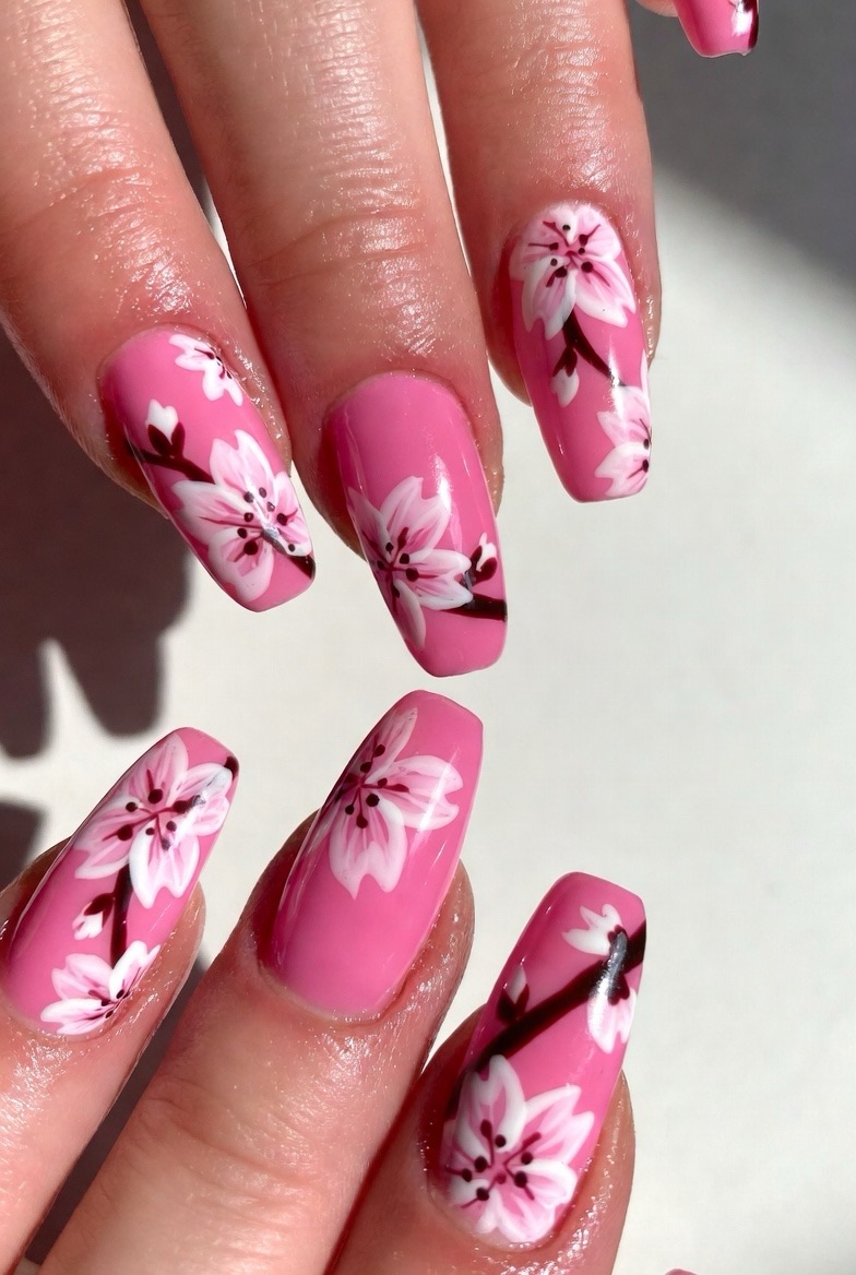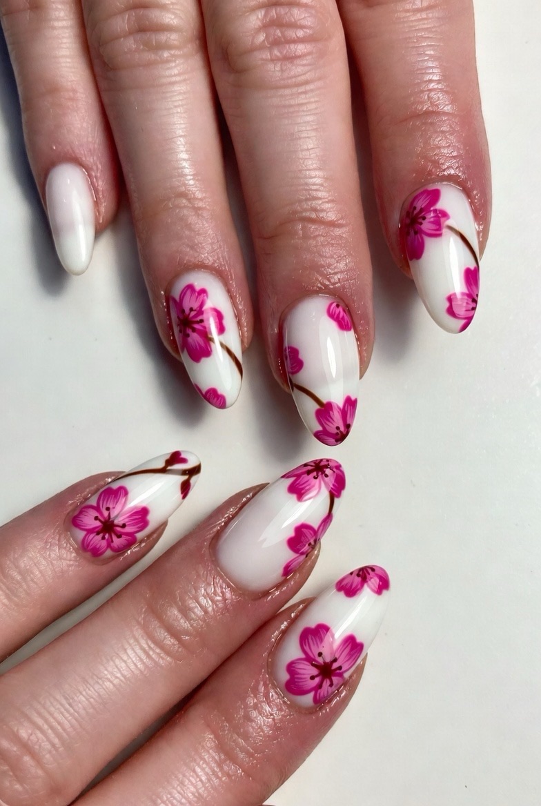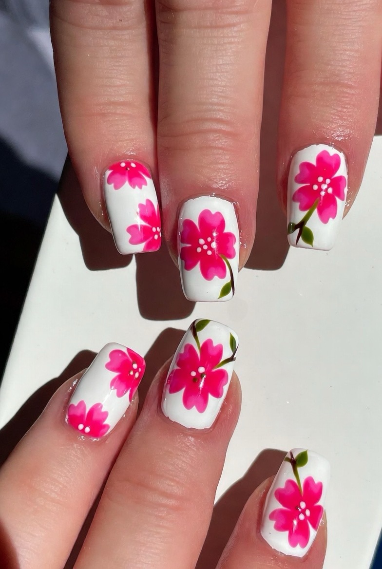 For striking contrast, pair bright pink blossoms with a crisp white background. This design stands out beautifully and gives your nails a fresh, vibrant spring look that catches the eye.