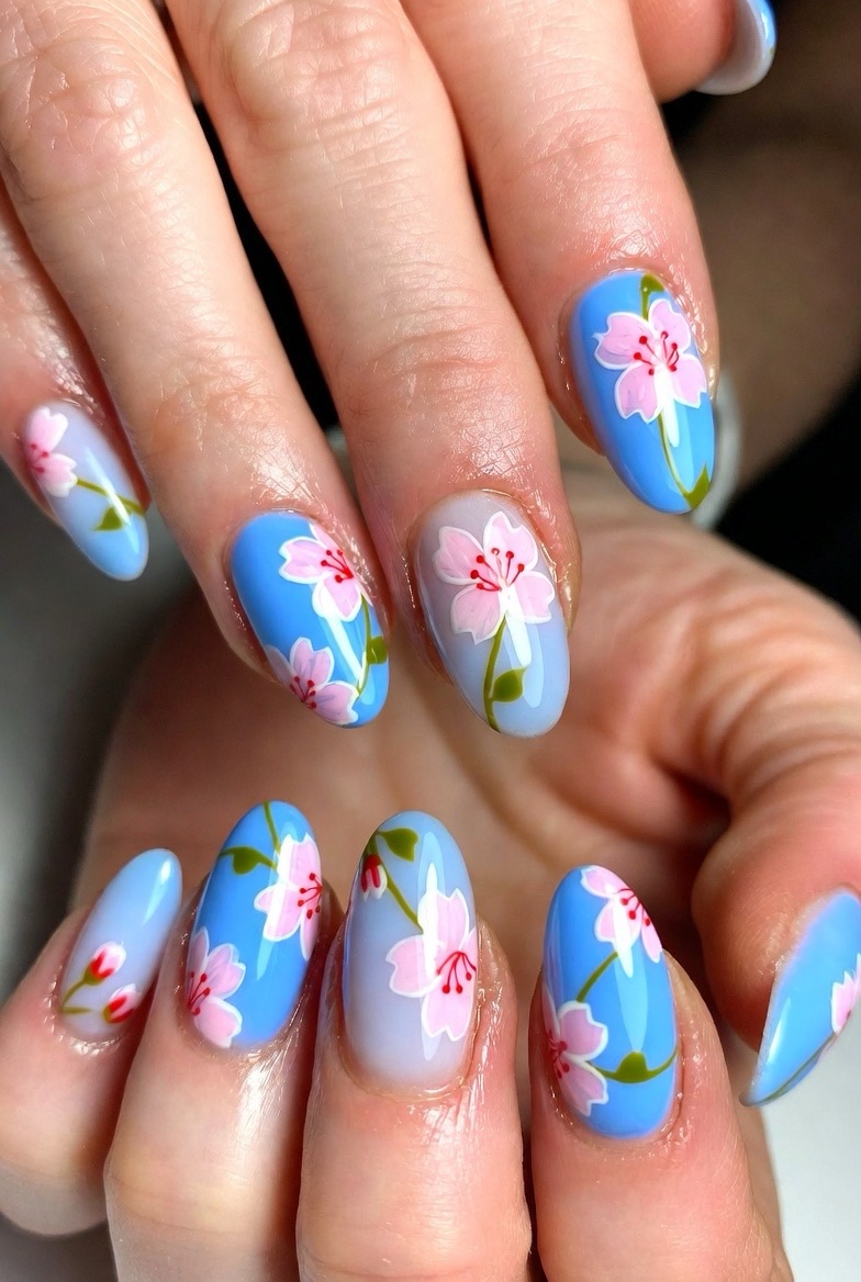 Blue backgrounds, especially sky-blue or icy pastels, create a serene, calming canvas for the blossoms. The color pairing feels uplifting and perfect for spring or summer transformations.