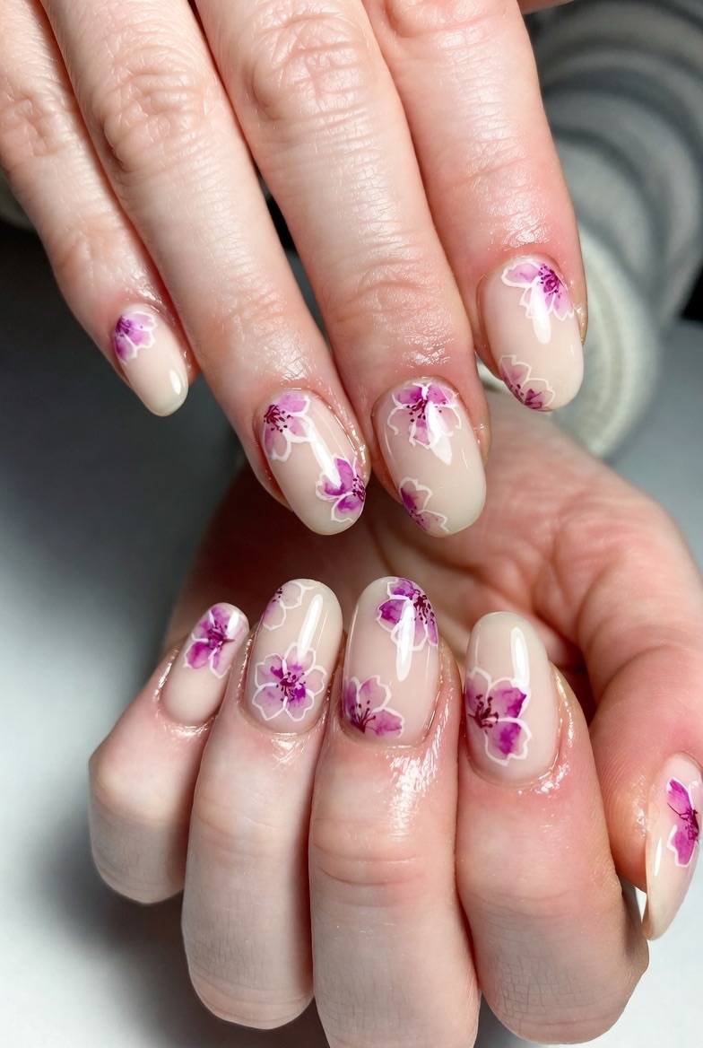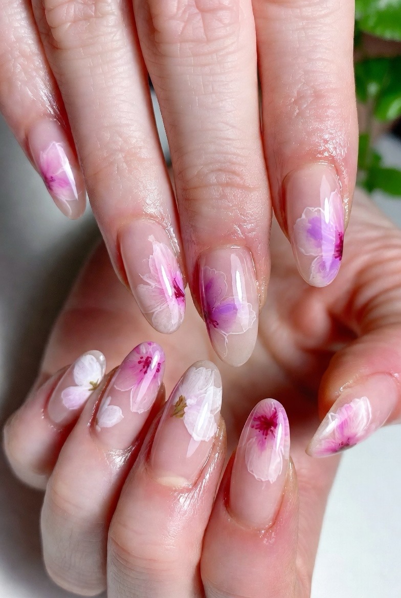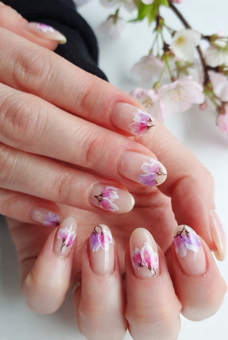 Watercolor designs offer a soft, painted look that’s perfect for cherry blossoms. Light washes of pinks, whites, and purples blend seamlessly, giving the nails a dreamy, artistic finish.