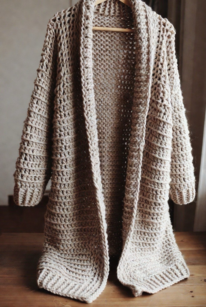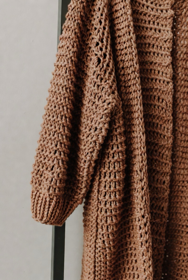 Thick yarn and bold stitches make this style ultra-cozy. Perfect for cold days and layering over jeans and boots.