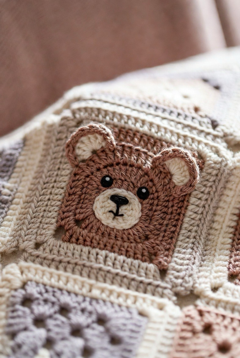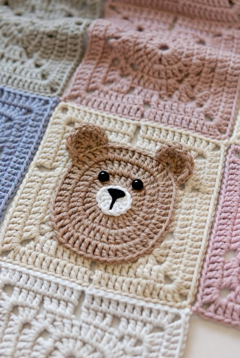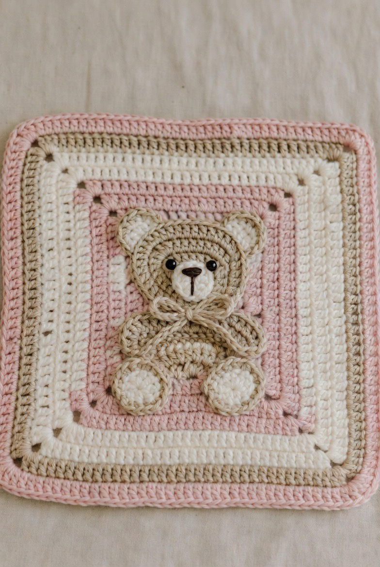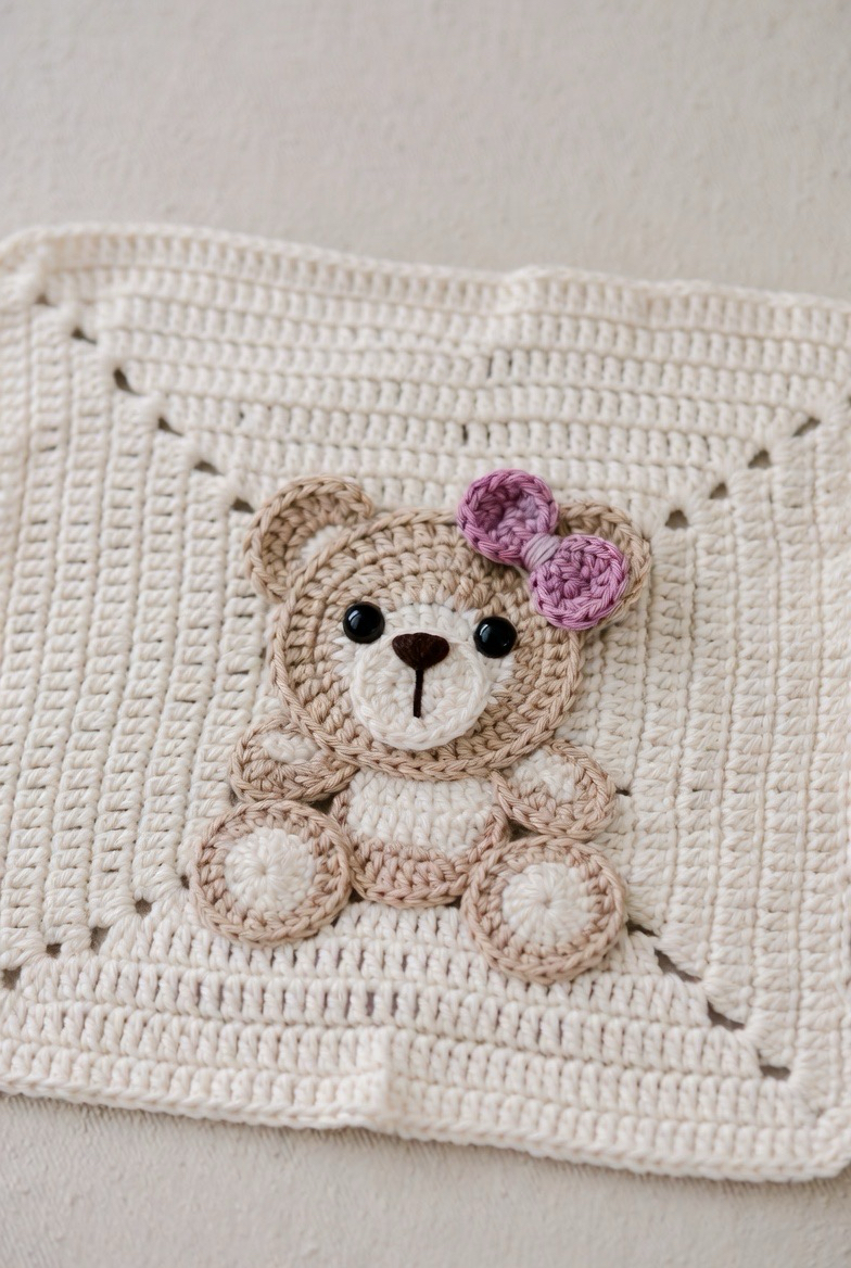 A bear with a little bow detail adds elegance and sweetness. The bow gives the square a dressed-up, special look. It’s perfect for baby girl blankets or soft pastel themes. The added detail makes the square feel handcrafted and unique. It adds charm and love to every corner of the blanket.