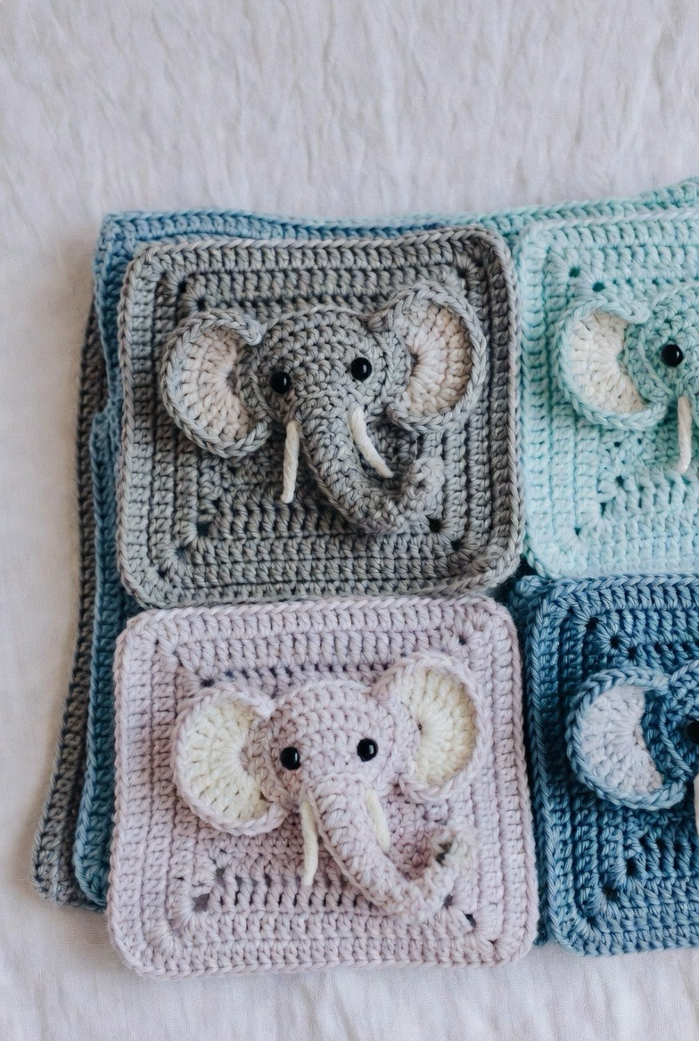 Elephants symbolize strength, care, and protection, perfect meanings for a baby gift. The large ears and curved trunk make this square visually adorable. It works beautifully in soft gray, blue, or pastel shades. The elephant square brings calm and sweetness to the blanket, making it feel nurturing and thoughtful. It’s perfect for both boys’ and girls’ nurseries and blends easily with other animal squares.