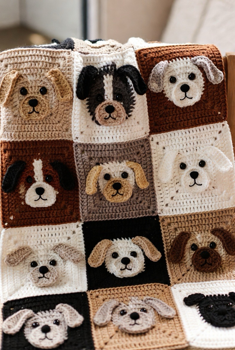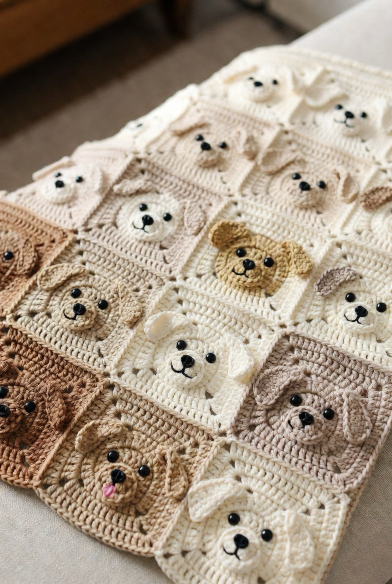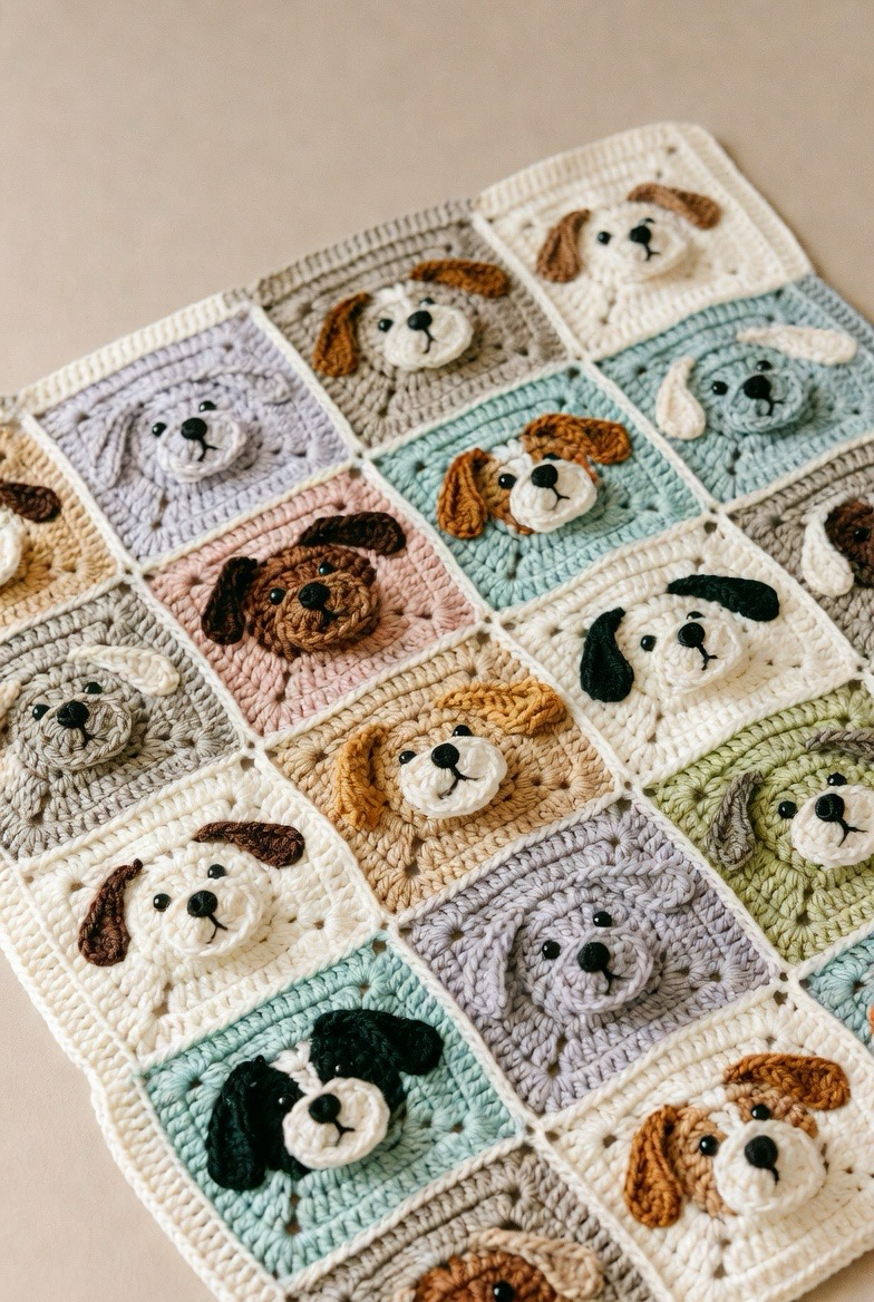 Dog squares feel loyal, loving, and fun. With floppy ears or round puppy faces, they bring joy into the design. This square is perfect for animal-lover families. The soft stitches and friendly expression make it extra charming. It adds warmth and happiness to the blanket and feels like a little best friend stitched into every square.