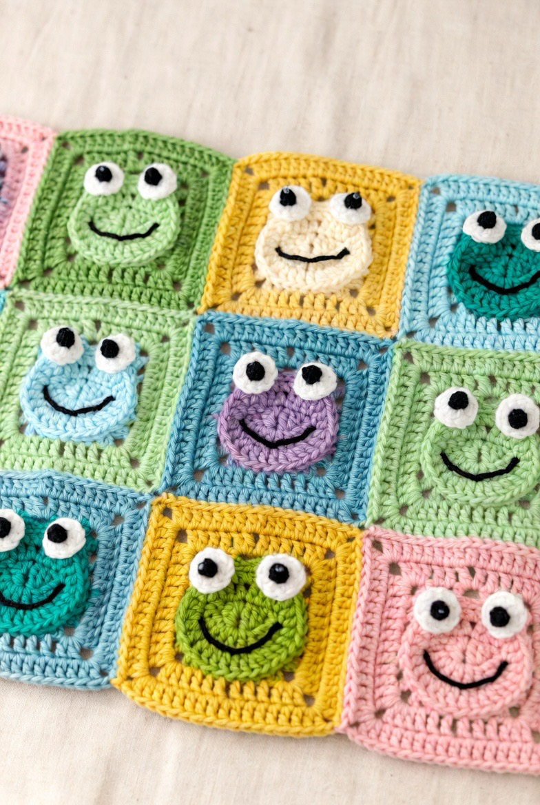 Frog squares are playful and full of energy. The wide eyes and round face make them fun and cheerful. This square adds brightness and personality to a baby blanket. It’s great for colorful designs and nature-themed nurseries. The frog brings a lively touch that makes the blanket feel happy and imaginative.