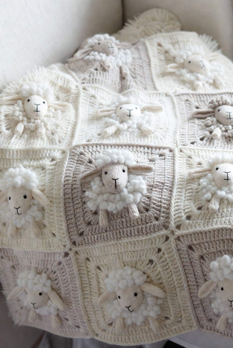 Sheep squares feel cozy, fluffy, and comforting. The textured stitches mimic wool, making the design extra warm-looking. It’s perfect for soft, neutral baby blankets. The sheep brings calm and softness to the design. It’s ideal for bedtime blankets and quiet nursery spaces.