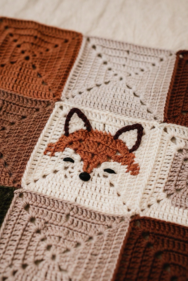 Fox squares are stylish and modern with a woodland twist. The pointed ears and clever little face make the design feel trendy yet sweet. It works beautifully in earthy tones. This square adds elegance and charm to baby blankets while still feeling playful.