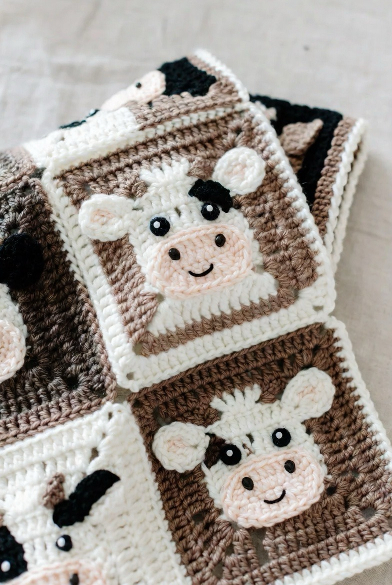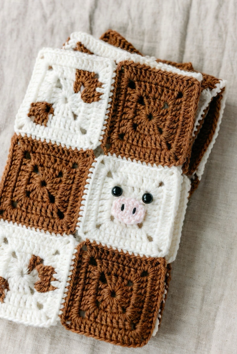 Cow squares bring farmhouse charm and fun. The spots and friendly face make them playful and warm. This square is perfect for rustic or country-themed blankets. It adds personality and uniqueness to the design.