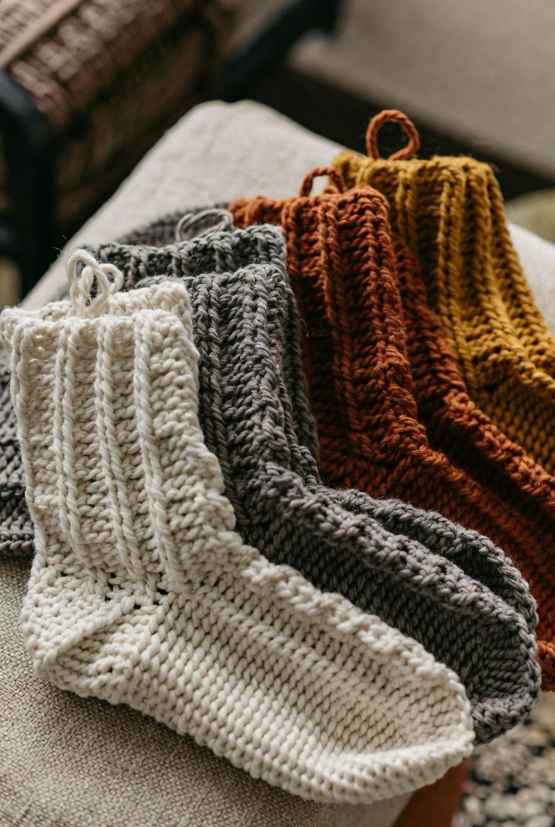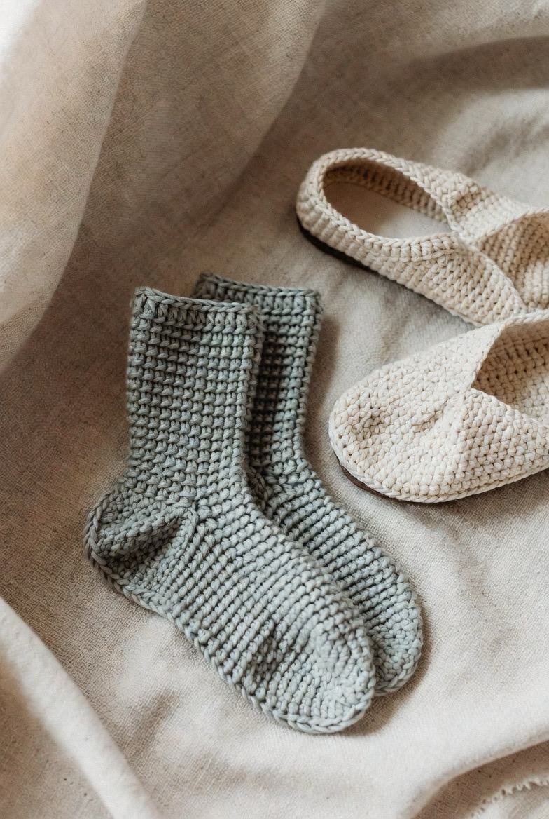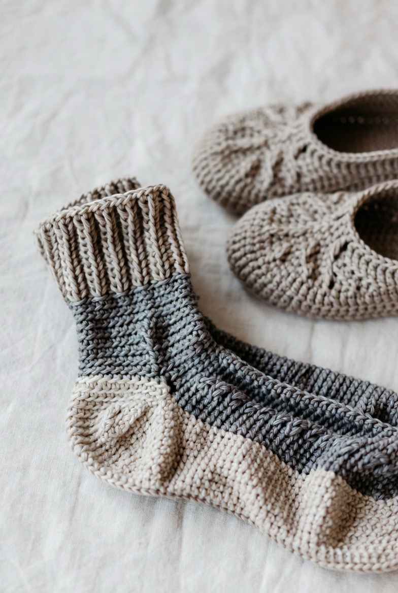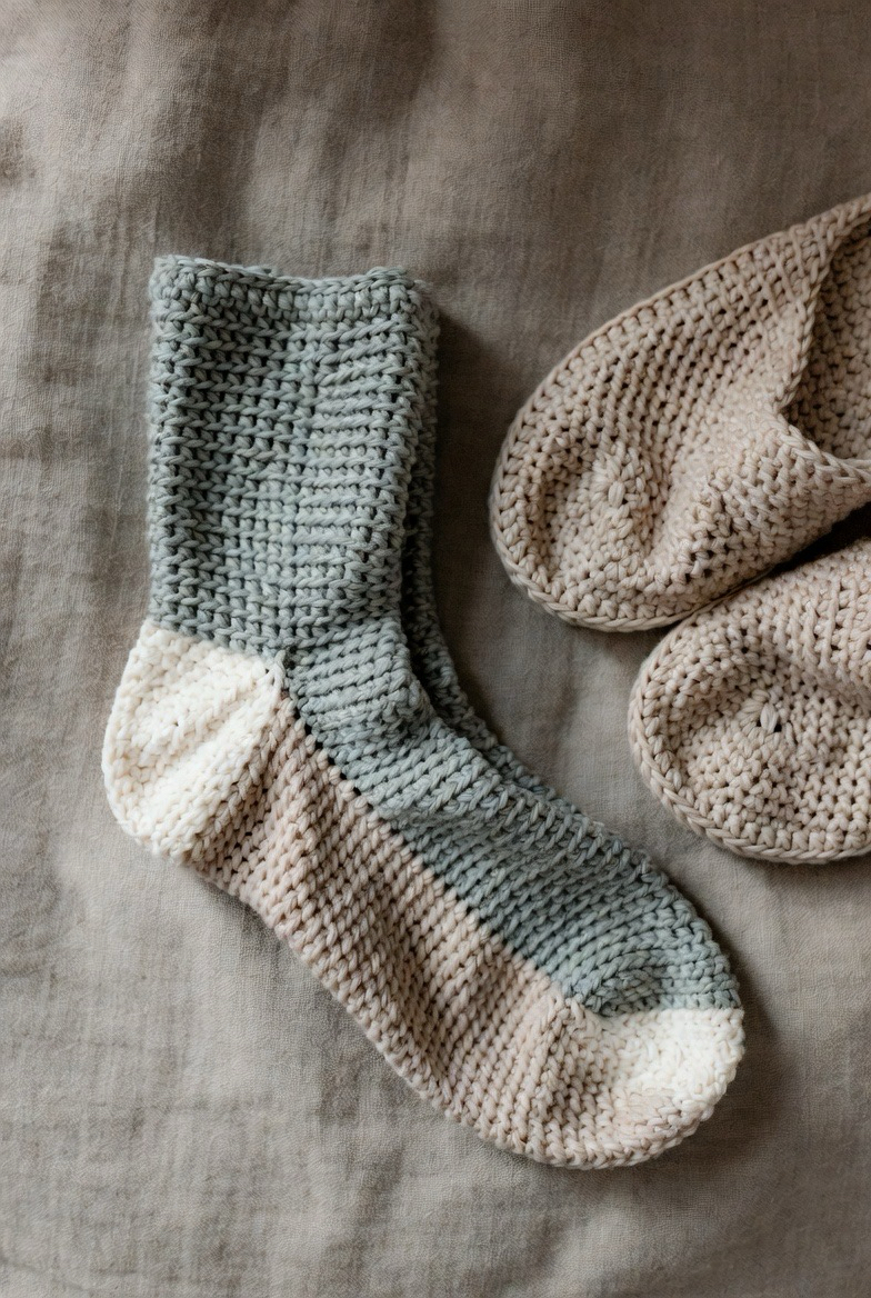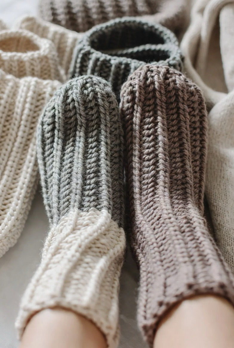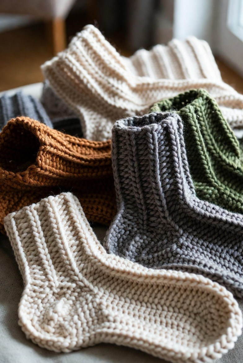 Ribbed crochet socks are a must-have for warmth and comfort. The raised stitches create stretch, allowing the socks to hug your feet without feeling tight. This style works beautifully with thicker yarns that trap heat while still feeling soft. Ribbed socks look great in neutral tones like cream, gray, and taupe, but also shine in cozy fall colors. They are perfect for wearing around the house or inside boots. Handmade ribbed socks feel snug, durable, and stylish all at once.