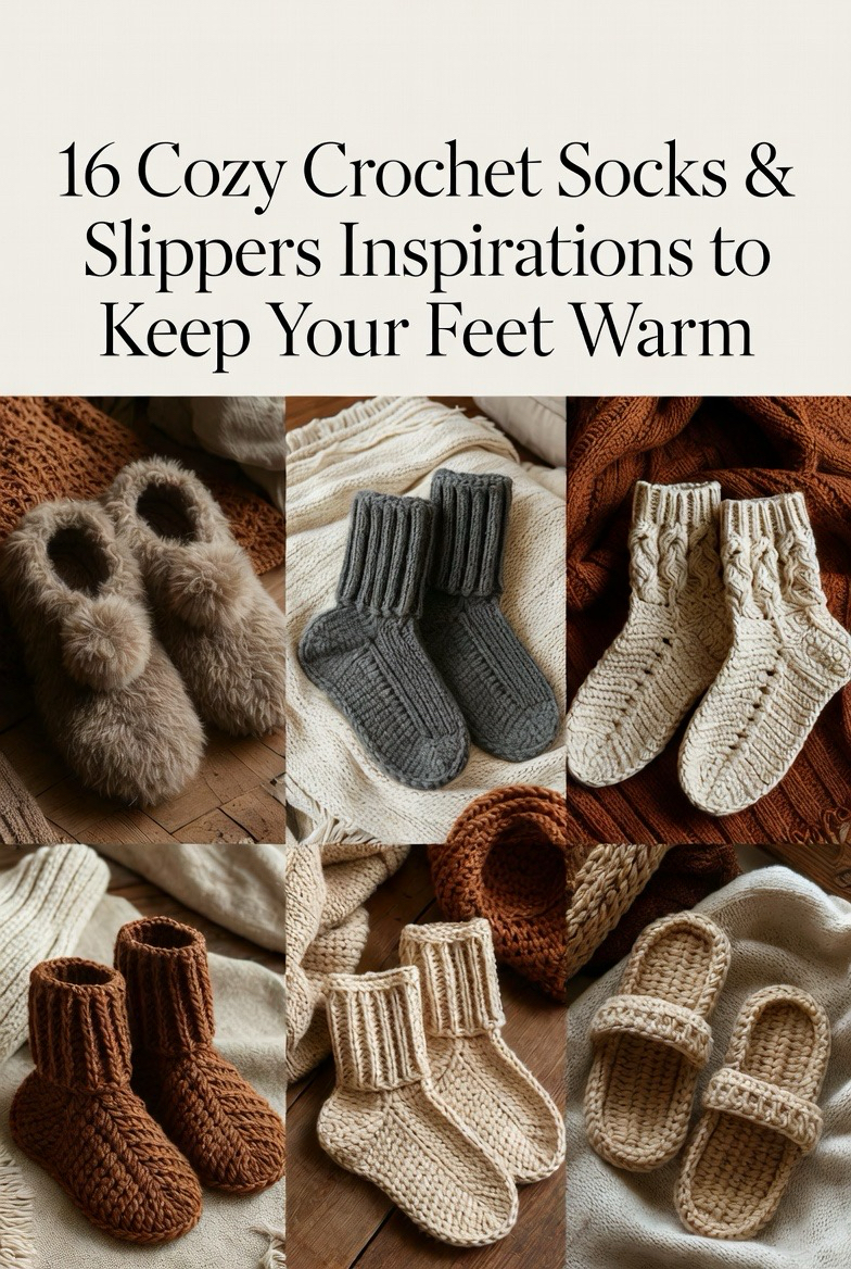Crochet socks and slippers bring warmth, comfort, and handmade charm into your daily life. These 16 inspirations show how many beautiful styles you can create for cozy feet. Whether you love classic, playful, chunky, or simple designs, there is a perfect pair waiting for you. Use these ideas for your next project, gift, or Pinterest pin. Cozy living always starts from the ground up.