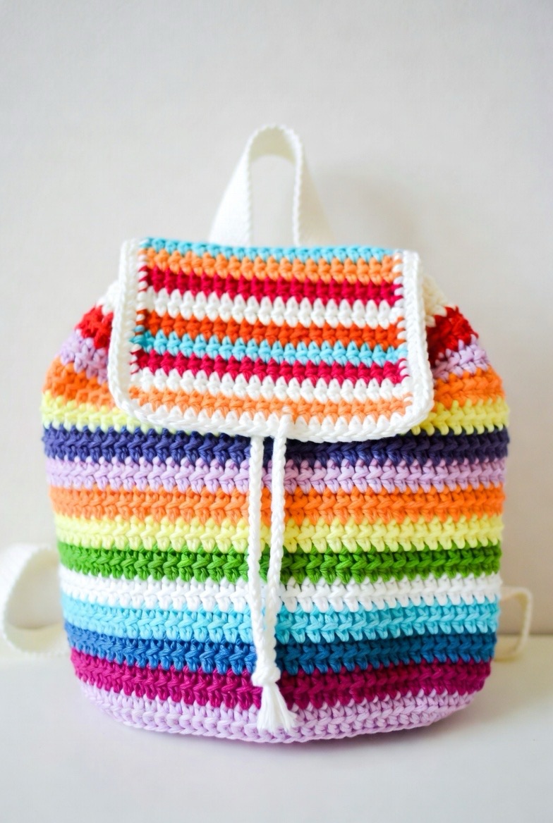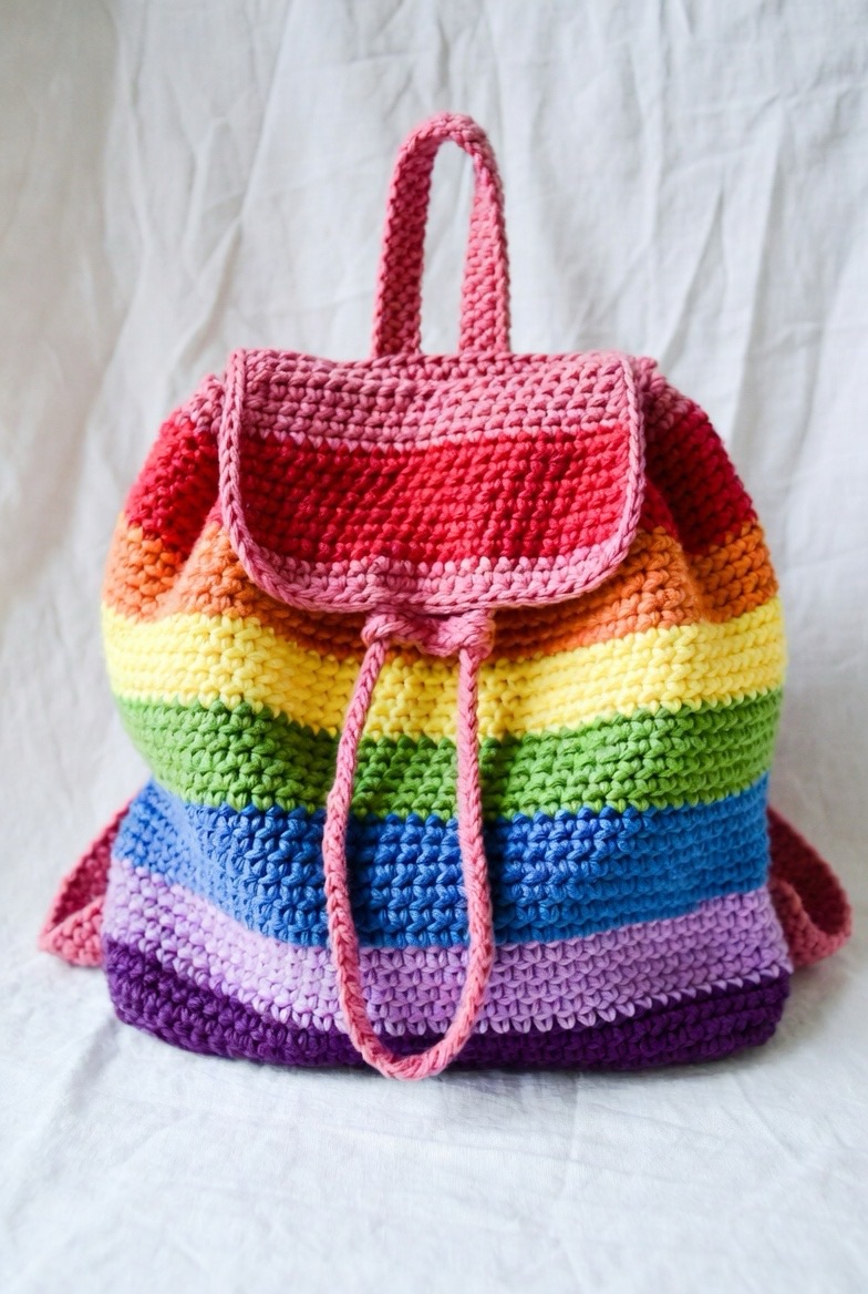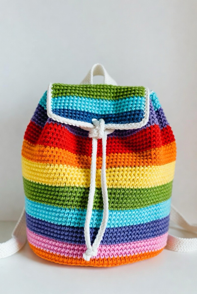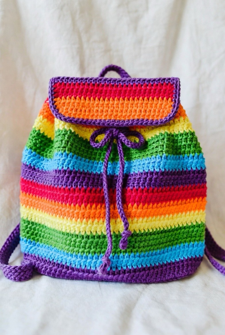 This vibrant, rainbow-striped backpack is sure to brighten any child’s day with its cheerful palette and playful design. The pattern uses basic stitches and color changes to create bold horizontal lines that instantly catch the eye. The drawstring closure and flap add both style and security, ensuring small treasures stay safe inside. It’s an ideal project for using up leftover yarn while creating a colorful, kid-friendly accessory. Perfect for little ones who love bright, joyful designs that stand out.