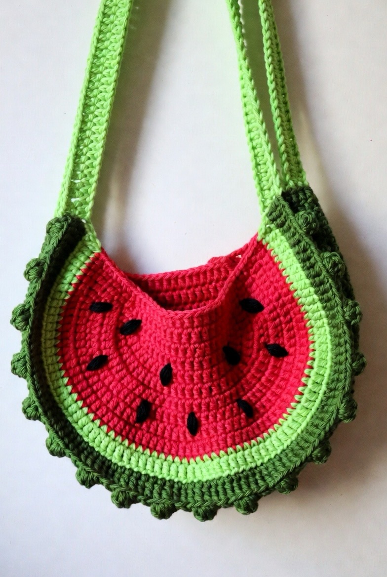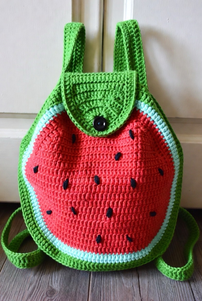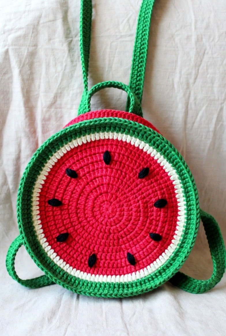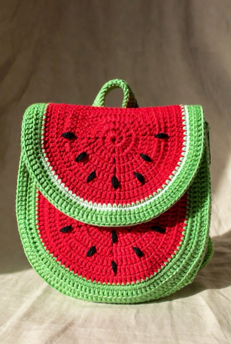 This quirky watermelon-themed backpack is a refreshing, fruity delight that kids love showing off. The semicircle shape, vibrant red center, and embroidered seeds make it instantly recognizable and irresistibly cute. Crocheted with bright summery colors, it’s perfect for beach trips, picnics, or warm-weather adventures. The pattern is surprisingly beginner-friendly with simple color changes and basic shaping. It’s a unique, cheerful design that adds a burst of personality to any outfit year-round.