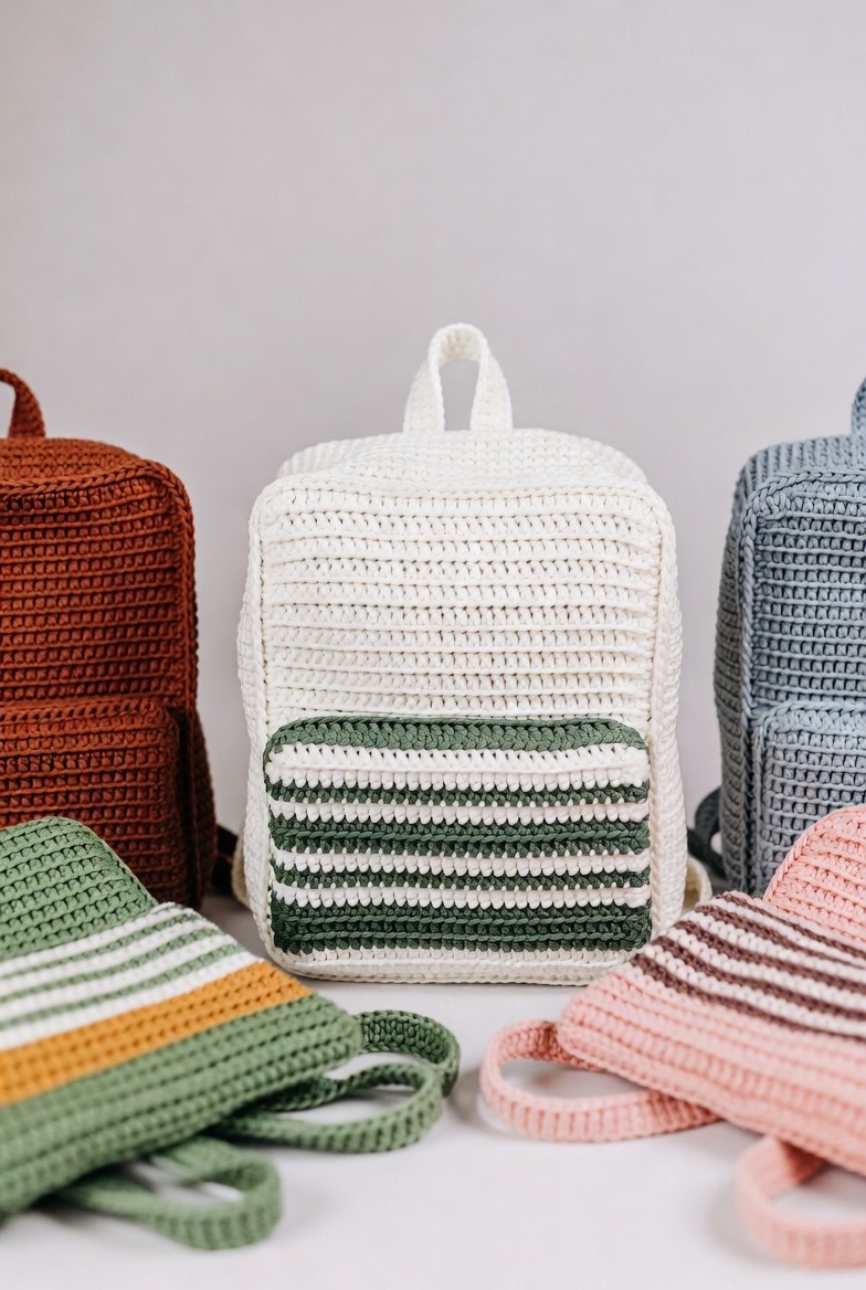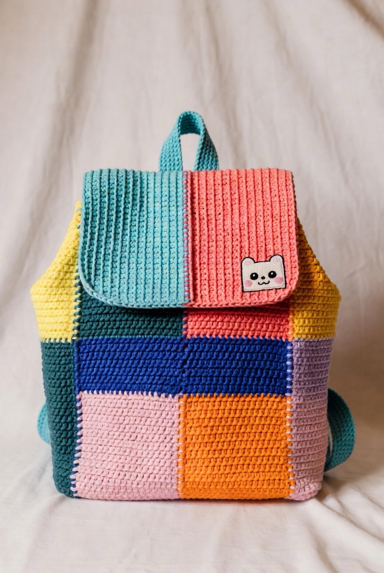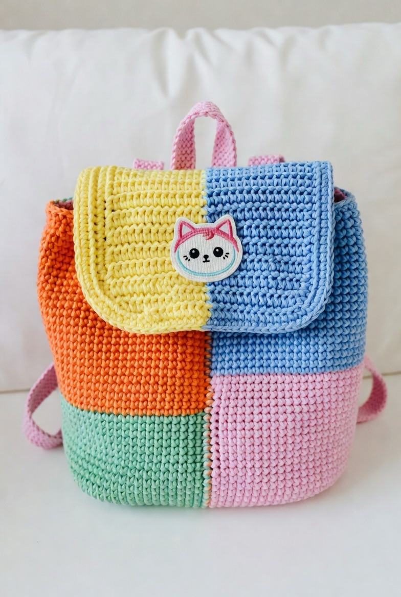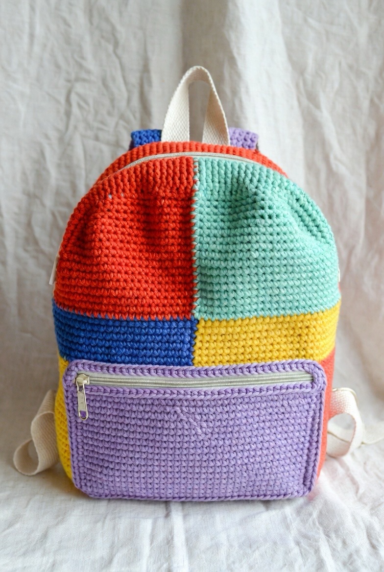 Bold blocks of color make this kids’ backpack modern, stylish, and visually fun. You can mix bright shades or soft pastels to create a combination that matches your child’s personality. The bag’s sturdy construction keeps it practical while still looking playful. With straightforward stitches and simple seams, it’s ideal for crocheters seeking a quick but satisfying project. Add a cute patch or appliqué to give it extra flair. It’s perfect for school, playdates, or weekend outings.