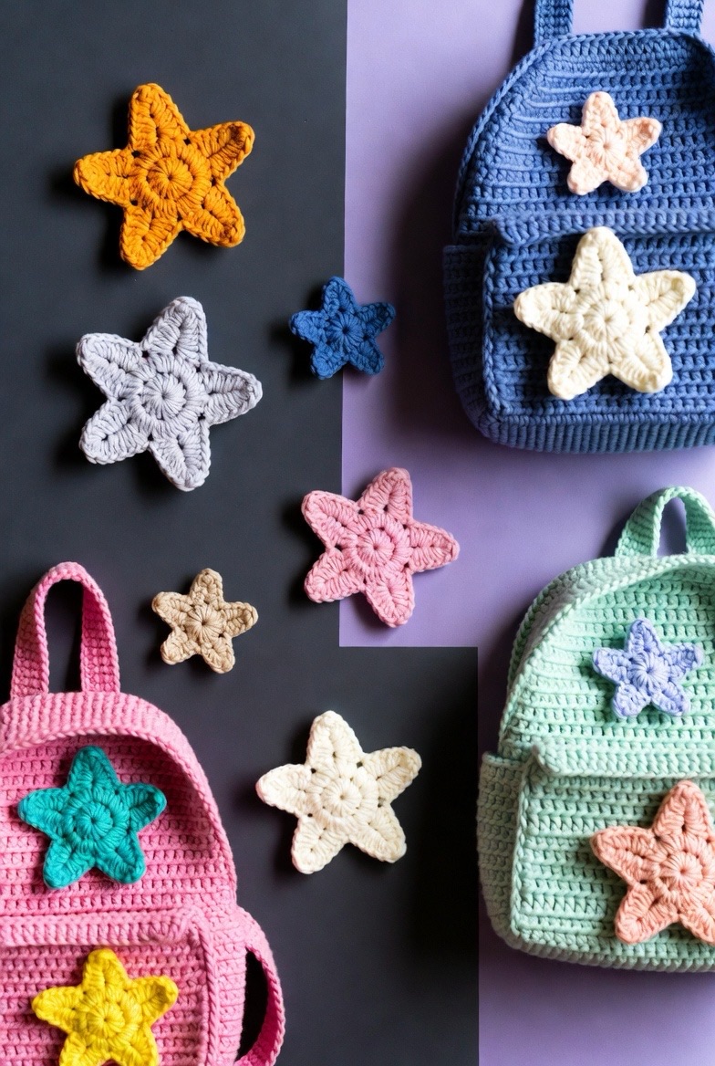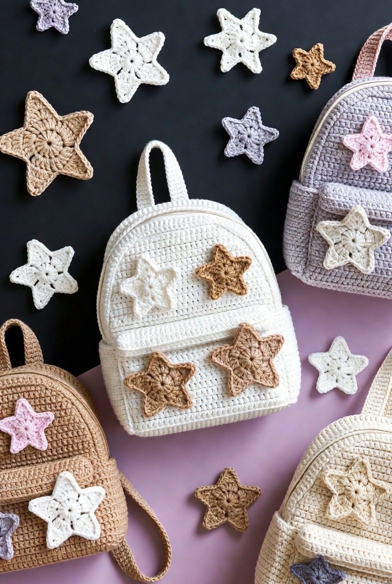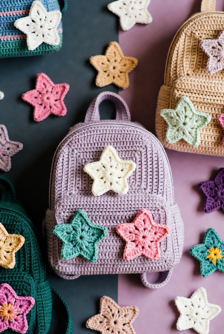 Perfect for young dreamers, this backpack features adorable crochet stars scattered across a dark or pastel background, creating a magical sky-like effect. The pattern uses simple appliqués sewn onto a sturdy base bag. Kids love the celestial theme, and the bag’s practical size makes it great for carrying small essentials. It’s also an excellent stash-busting project for using leftover yarn. This design brings a whimsical touch to everyday outings and inspires creativity and imagination.