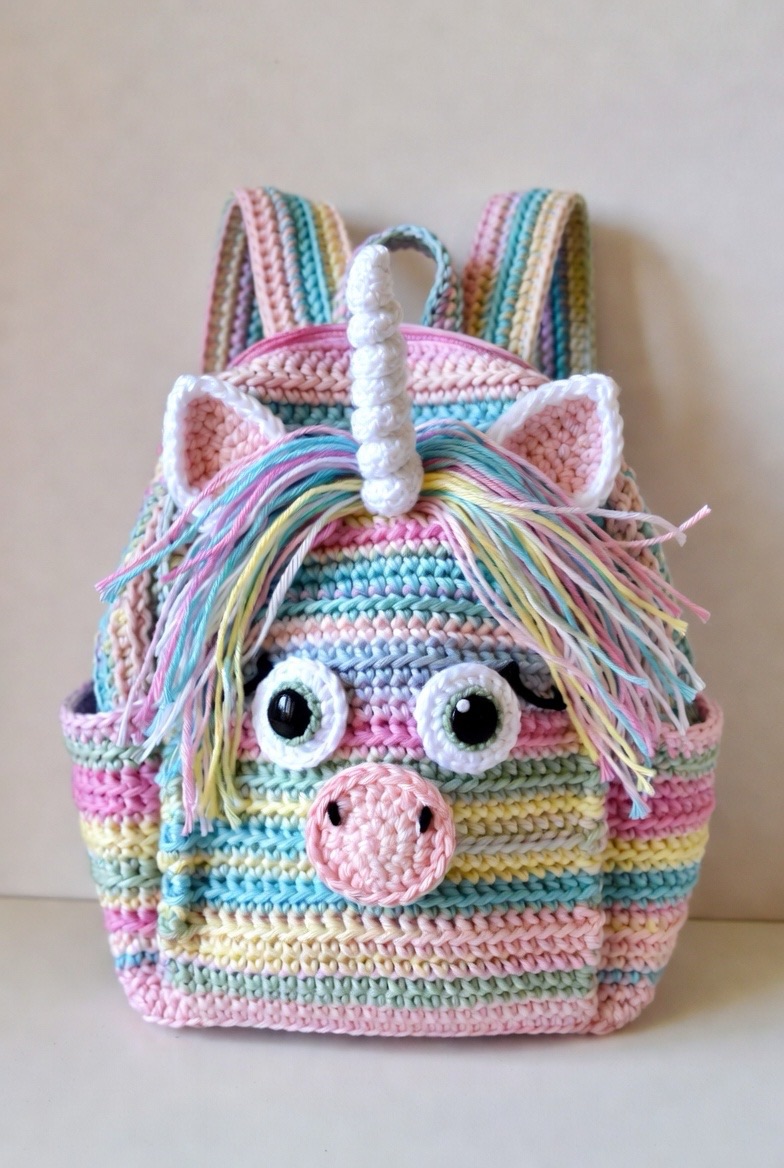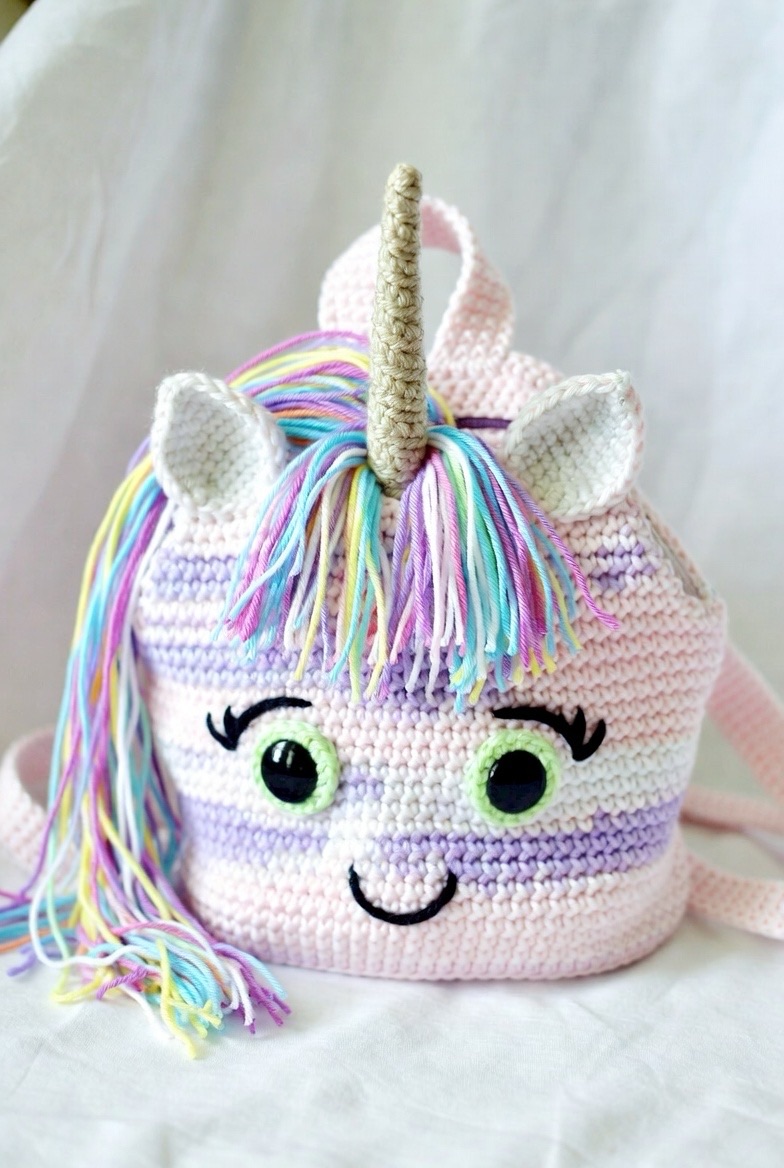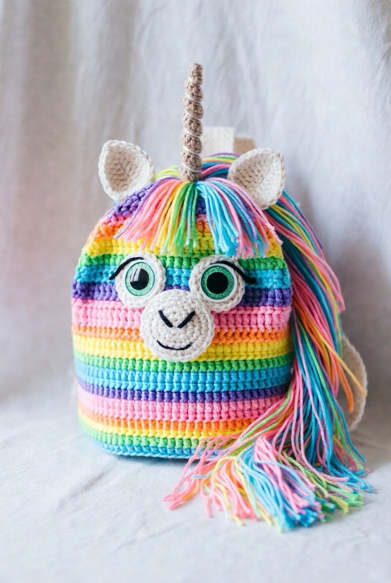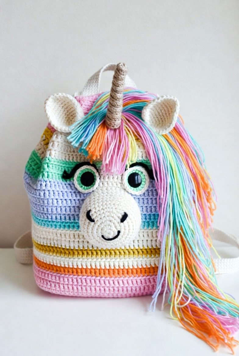 A unicorn backpack brings enchanting fantasy charm straight into a child’s daily routine. This pattern features a cute crocheted face, spiraled horn, and a colorful yarn mane that dances with movement. It’s a favorite among kids who adore magical creatures and bright, playful designs. The construction is surprisingly simple, making it an enjoyable project for confident beginners. Use rainbow pastels or bold shades to personalize the look. It’s a standout accessory that sparks imagination everywhere it goes.