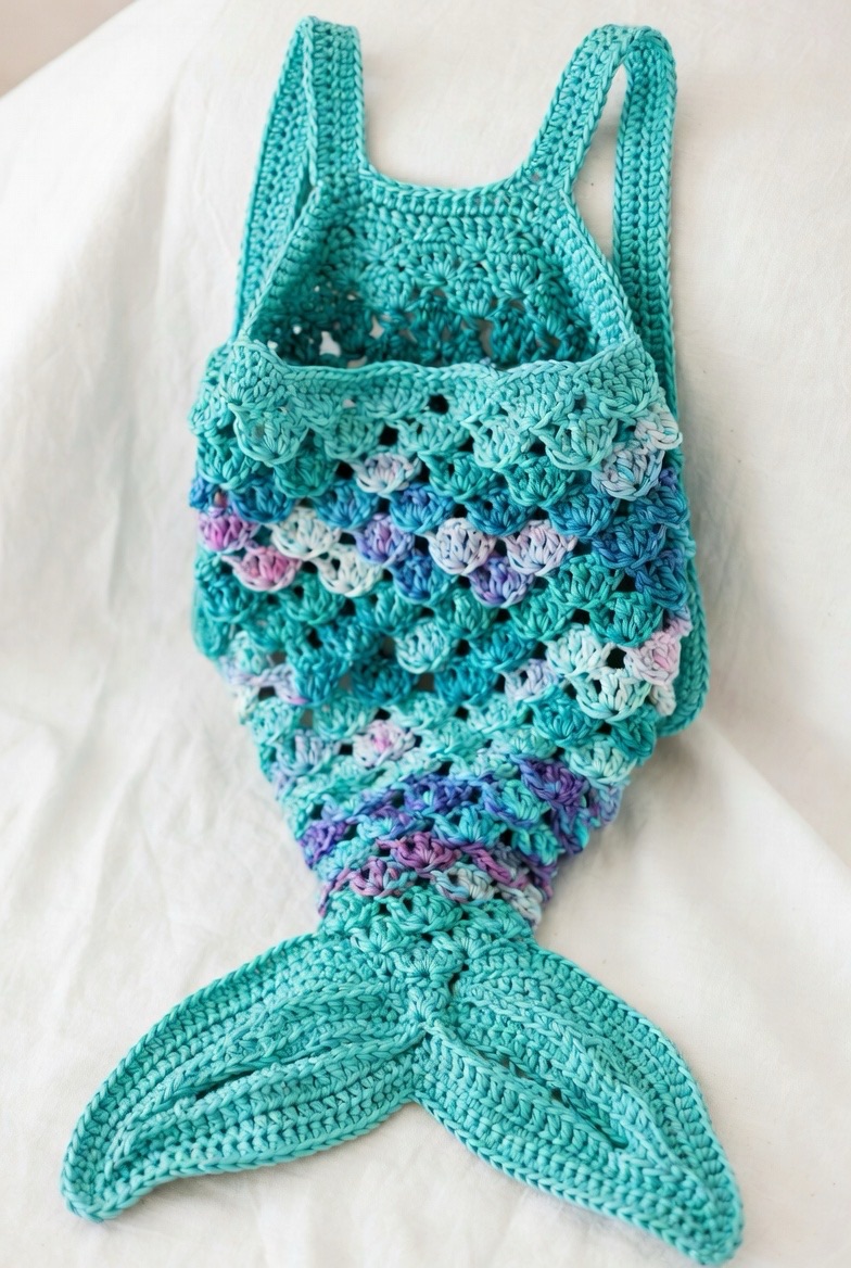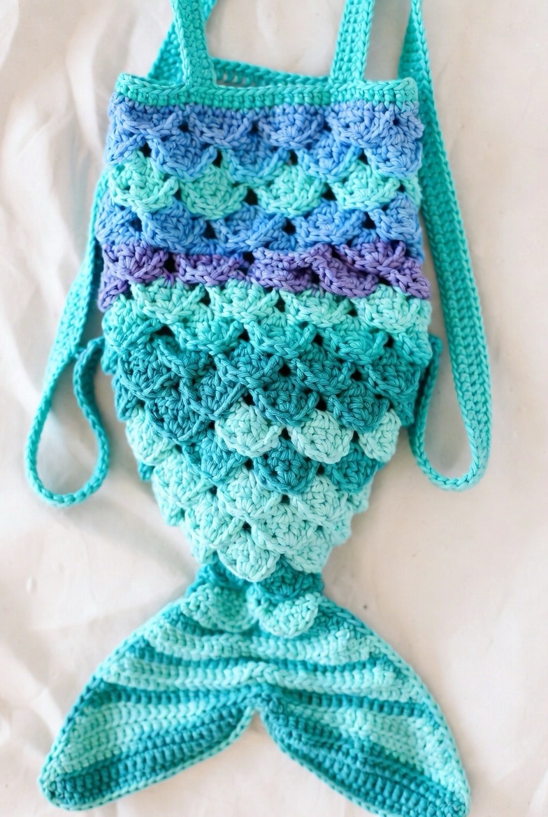 This mermaid-inspired design is perfect for kids who love all things under the sea. Shaped like a mermaid tail, the bag uses shell stitches or textured patterns to mimic scales. The vibrant ocean colors make it visually captivating, while the soft yarn keeps it comfortable to wear. It’s a fun accessory for beach days, pool outings, or pretend-play sessions. Despite its unique shape, the pattern is easy to follow. It’s a magical, memorable handmade gift little mermaid fans adore.