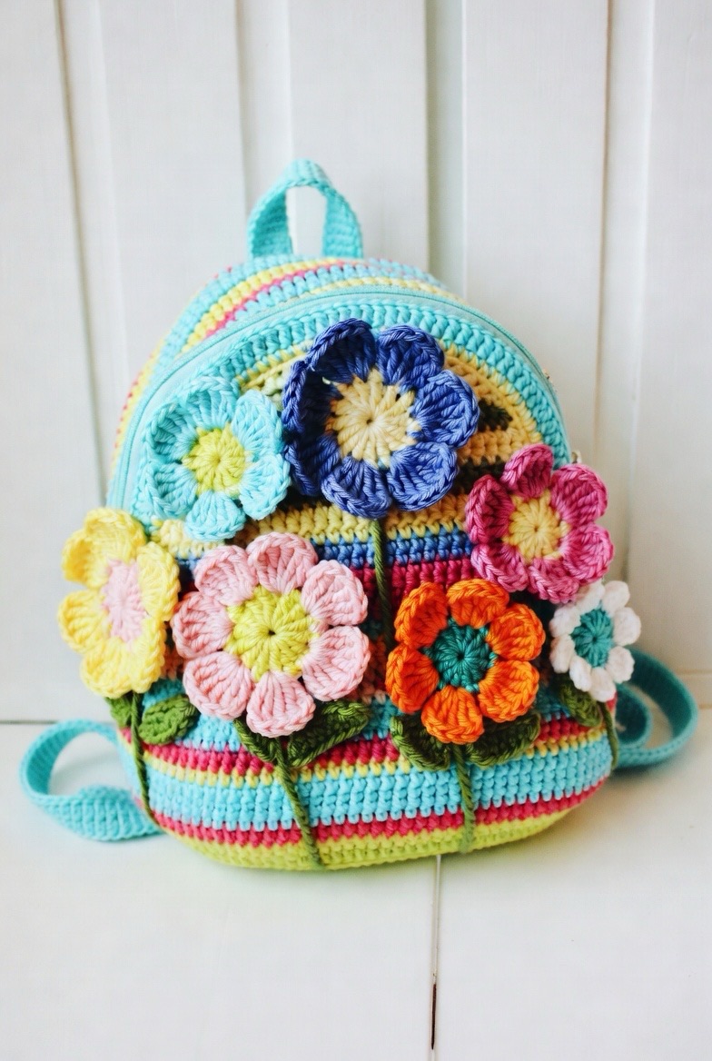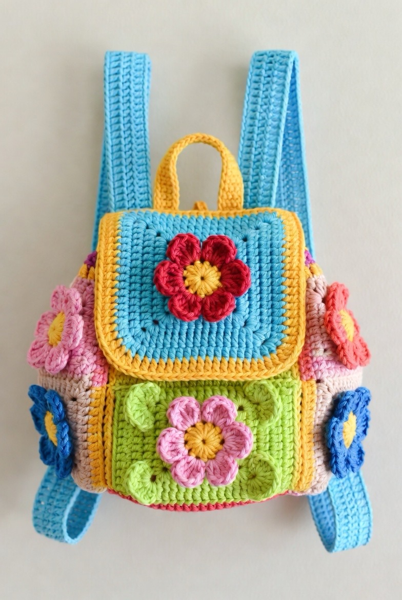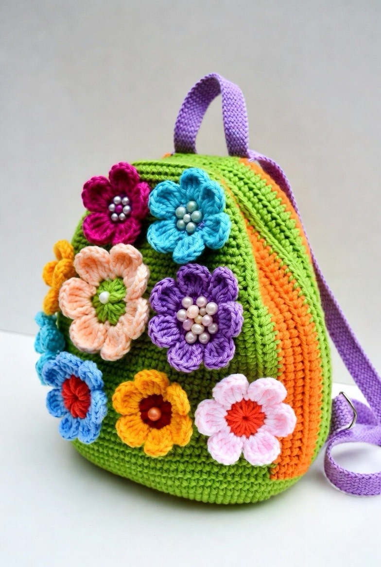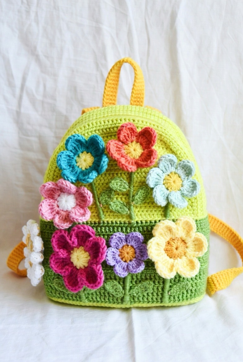This cheerful floral-themed backpack adds a touch of spring to any child’s day. It features crocheted flowers, petals, and leaves attached to a brightly colored base, creating a garden-inspired aesthetic. The bag is both pretty and functional, perfect for carrying small toys or art supplies. The pattern allows for plenty of creativity, letting you mix different flower shapes and colors. It’s an excellent project for intermediate crocheters who want to create something charming and eye-catching.