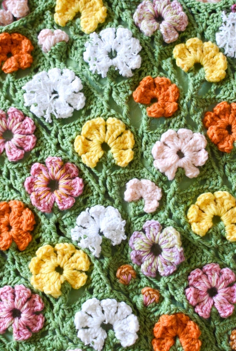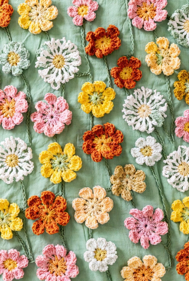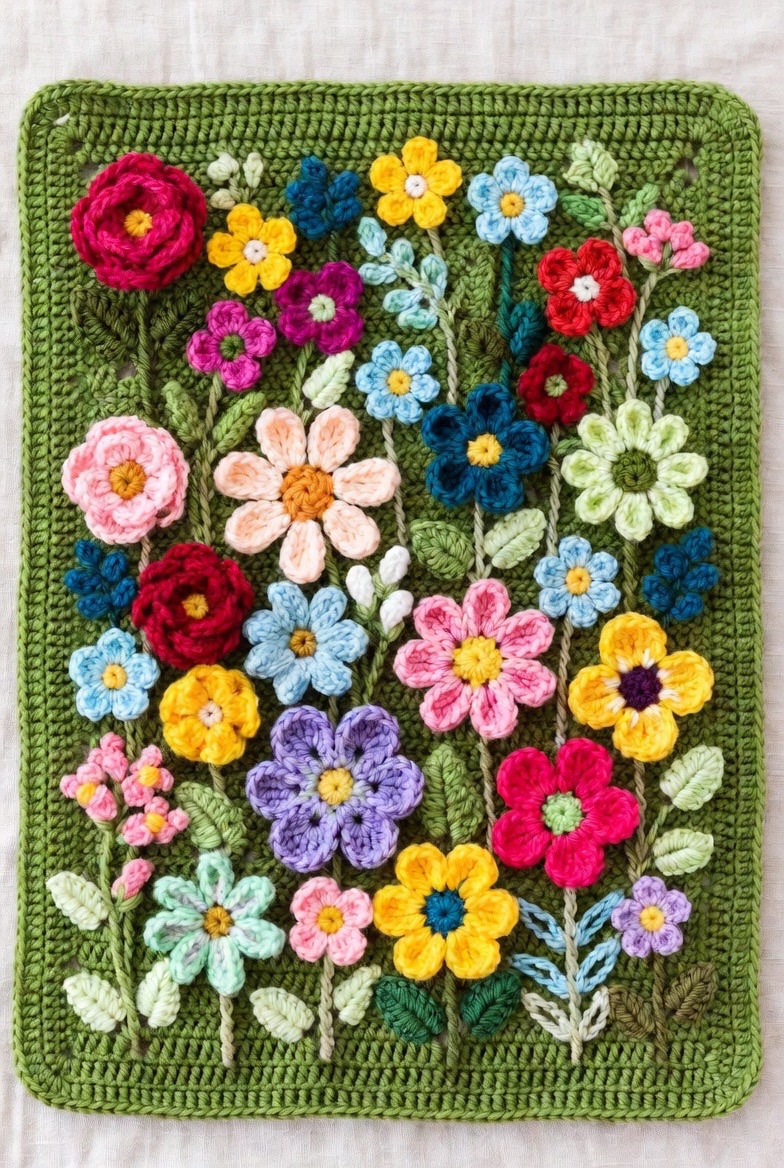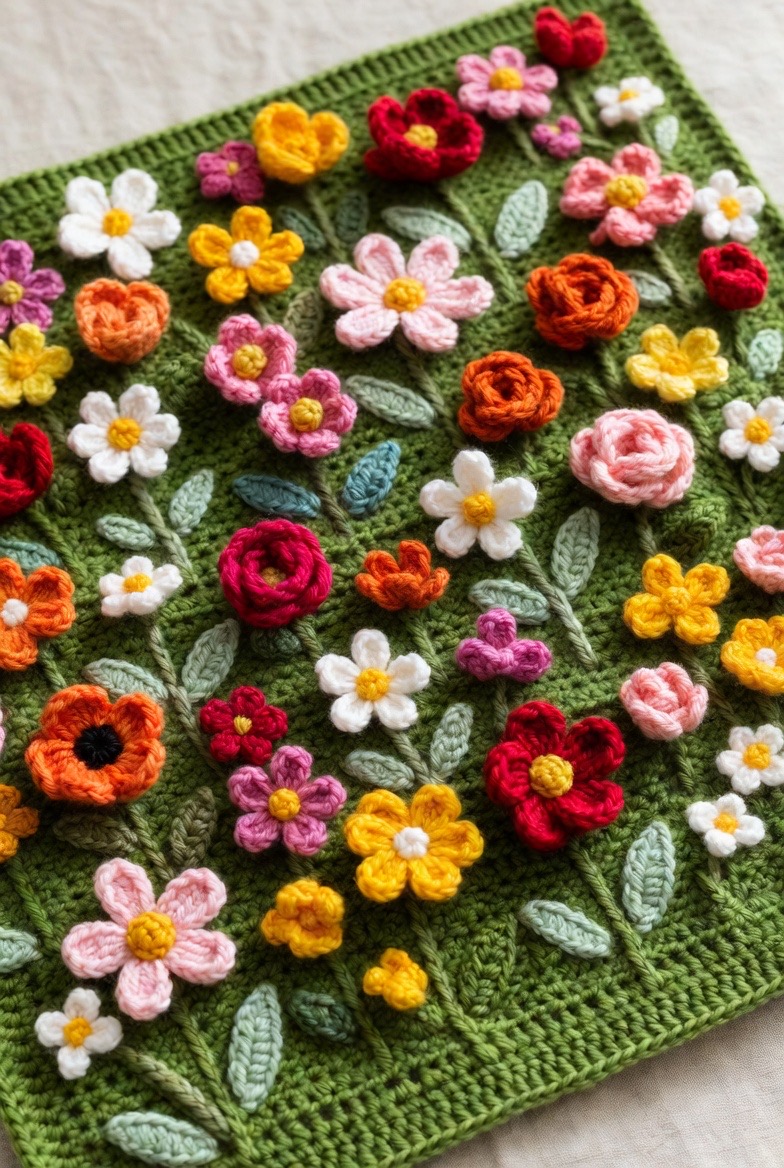 For those who love texture and want a blanket that practically jumps off the couch, the three-dimensional appliqué approach is stunning. The base of the blanket is usually crocheted in a solid, earthy green to represent the grass. Then, you crochet dozens of individual flowers, roses, daisies, and poppies, complete with leaves and stems. These elements are sewn onto the base in scattered clusters. It is a labor of love that requires patience, but the final product is a tactile, heirloom-quality piece that looks like a real garden patch brought indoors.