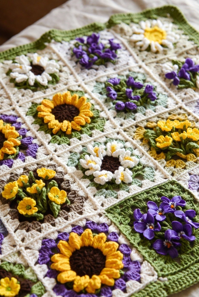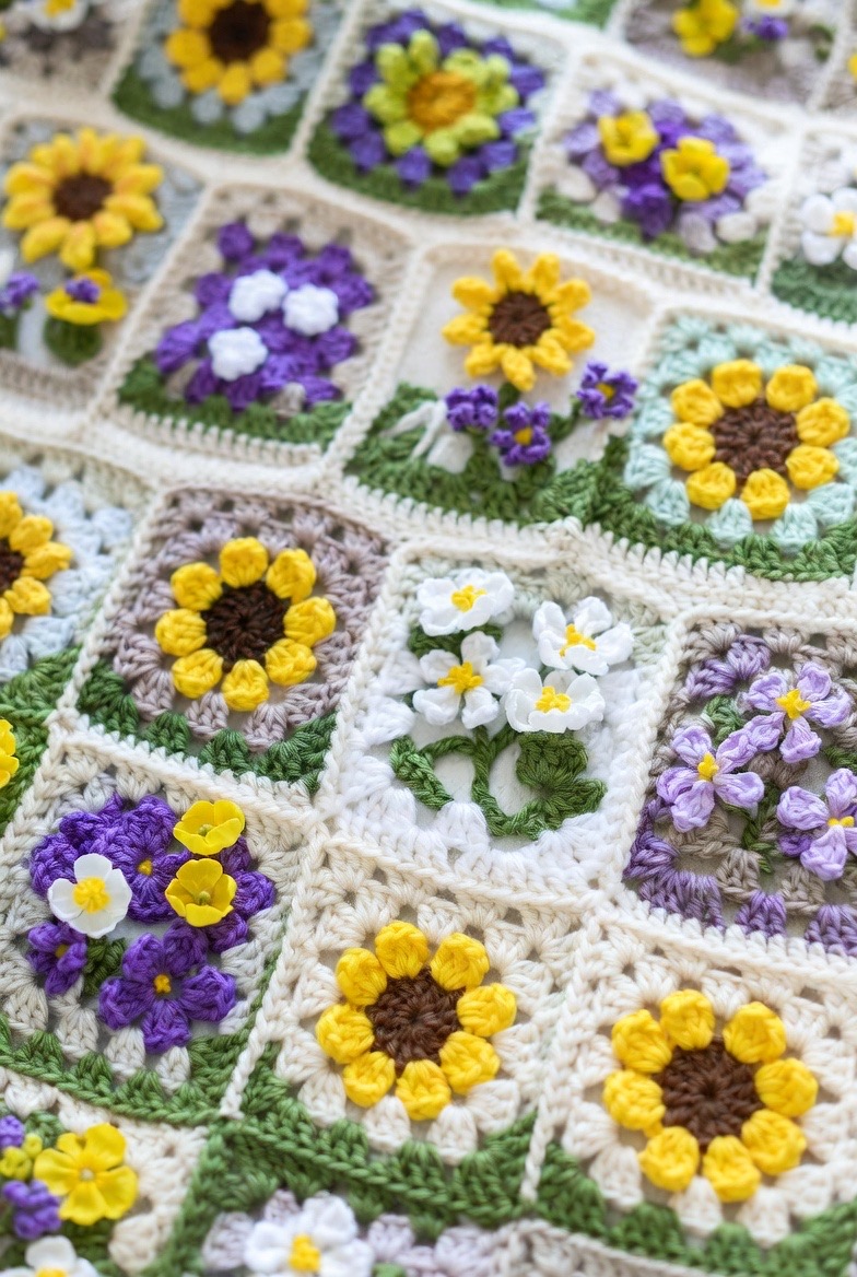The classic granny square gets a botanical makeover in this vibrant style. Instead of traditional color blocks, the center of each square features a distinct flower motif. You might have rows of sunflower squares bordered by squares featuring violets or buttercups. The key to the meadow vibe is to join them using a neutral green or cream yarn, which acts as the garden path connecting the different beds. This is a fantastic portable project because you can work on individual flower squares on the go and assemble them later.