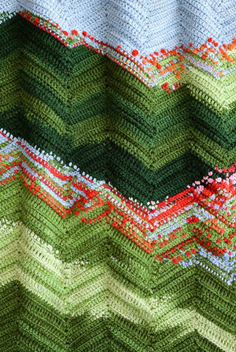 The ripple or chevron stitch is perfect for mimicking the undulating landscape of a hilly meadow. By using a carefully curated palette of greens for the valleys and bursts of floral colors for the peaks, you create a sense of movement and depth. Imagine thick bands of forest green transitioning into lighter grass green, followed by thin, striking rows of poppy red and sky blue. The gentle waves of the stitch pattern make the blanket look like a landscape painting brought to life. It is a rhythmic, relaxing project once you find your flow.