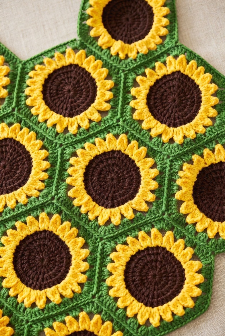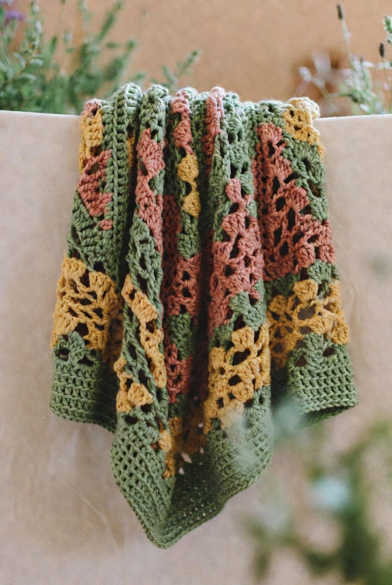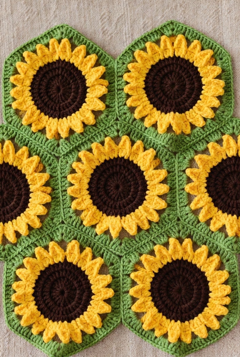 There is nothing quite as cheerful as a field of sunflowers turning their heads toward the sun. This blanket focuses on the bold contrast between deep yellows, chocolate browns, and vibrant greens. You could create giant sunflower hexagons that are joined together, where the flowers themselves make up the bulk of the blanket. The radiant energy of the yellow yarn instantly brightens up a dark room and brings a sense of peak summer heat and happiness into your home all year round.