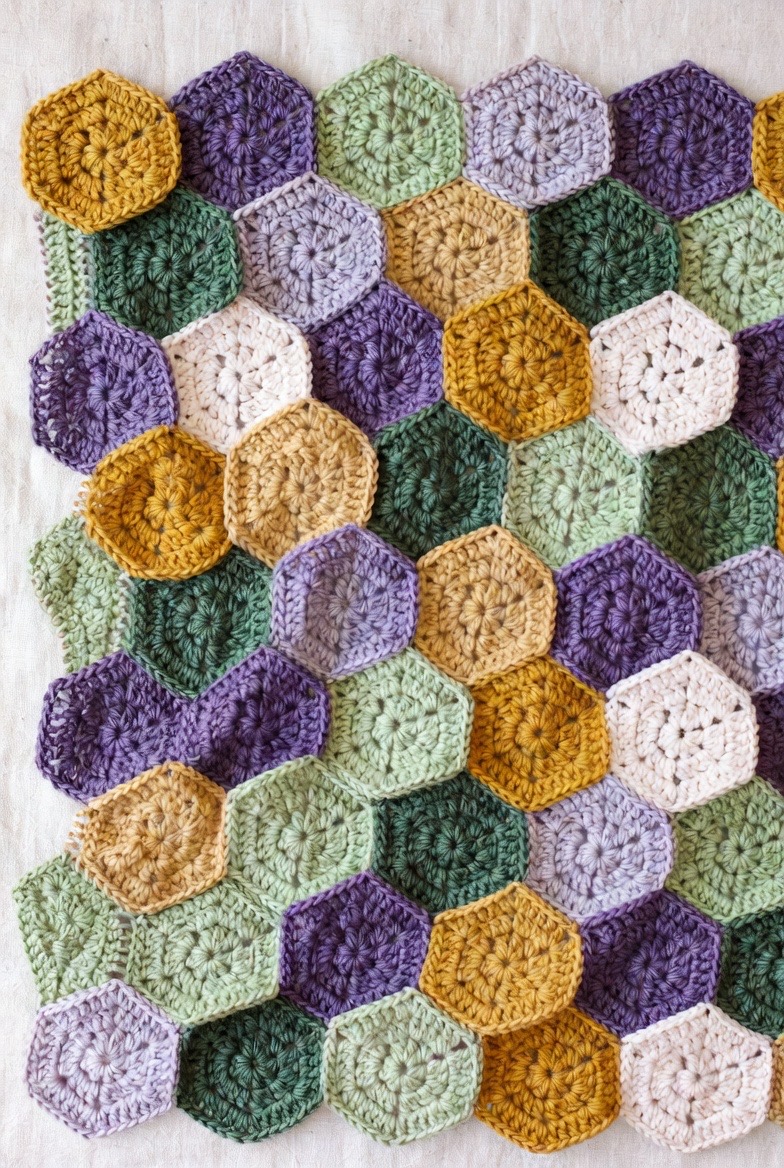 A meadow is not just about flowers; it is also about the busy life within it. Using hexagon motifs is a subtle nod to the honeycomb structures of the bees that pollinate the wildflowers. You can crochet solid-colored hexagons in a wide array of meadow colors, gold, violet, and green, and sew them together in a random arrangement. The geometric shape gives the blanket a modern look, while the scrappy colors keep it feeling organic. It is a great project for using up medium amounts of leftover yarn.