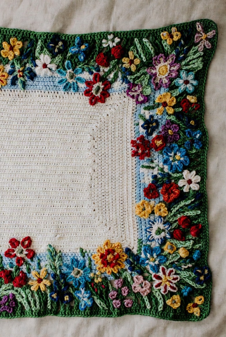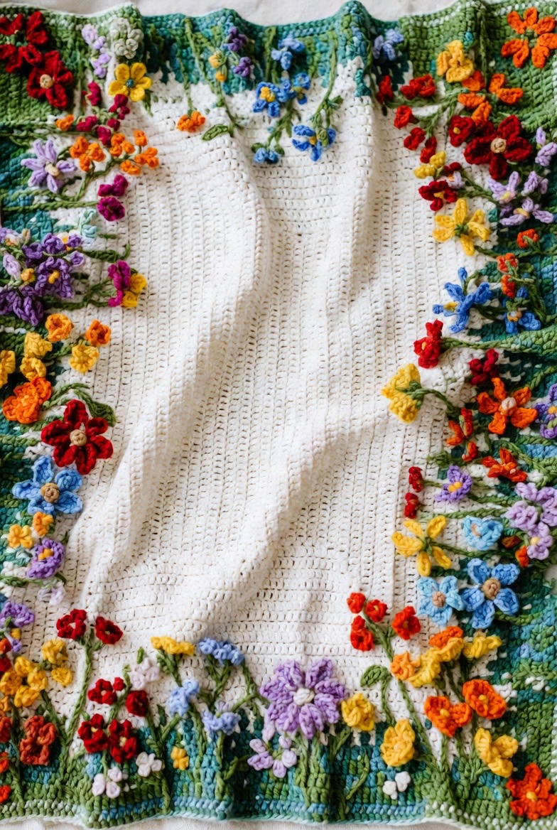 Sometimes less is more. In this style, the main body of the blanket is crocheted in a simple, solid color like creamy white or sky blue, providing a calm center. The meadow element comes in on the border. You create a wide, elaborate border filled with floral stitches or a colorful riot of edging that looks like a hedgerow in full bloom surrounding a calm field. This design allows the intricate work to frame the piece without making the entire blanket feel too busy. It is an elegant way to incorporate the theme.