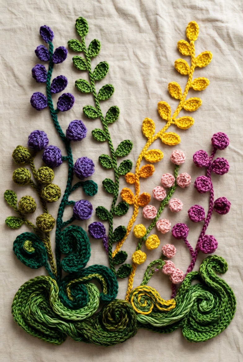 This style draws inspiration from the way a painter might capture a field at sunset, where colors blur together to create the suggestion of flowers rather than distinct shapes. By holding two or three strands of different lightweight yarns together, think mossy greens, pale yellows, and soft lavenders, you create a marled, painterly effect. The colors shift organically as you work simple rows of stitches. It is less about counting and more about letting the colors interact naturally. The result is a soft-focus masterpiece that feels like looking at a meadow through half-closed eyes on a sunny afternoon.