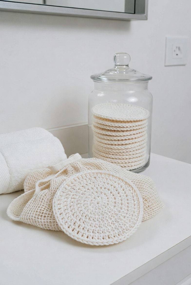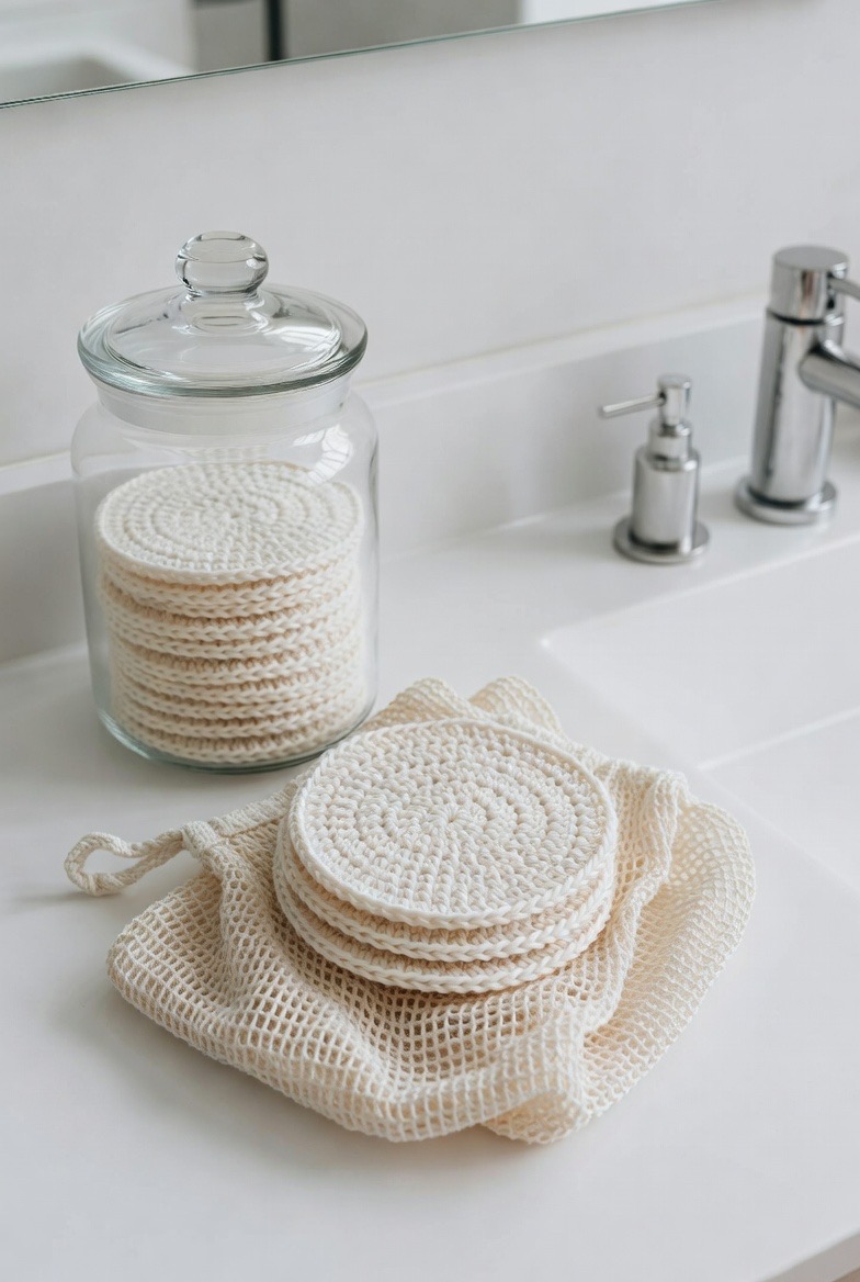 The journey to a sustainable bathroom usually begins with the humble cotton round. In 2026, these are reimagined using 100% organic unbleached cotton yarn. These pads are worked in simple, tight rounds of single crochet to create a flat, durable surface that mirrors the feel of a disposable pad but with far more “grit” for removing stubborn makeup. They are easy to toss into a mesh bag and wash with your towels, ensuring you never run out of supply. The minimalist, off-white aesthetic makes them look incredibly chic when stacked in a glass apothecary jar on your vanity.