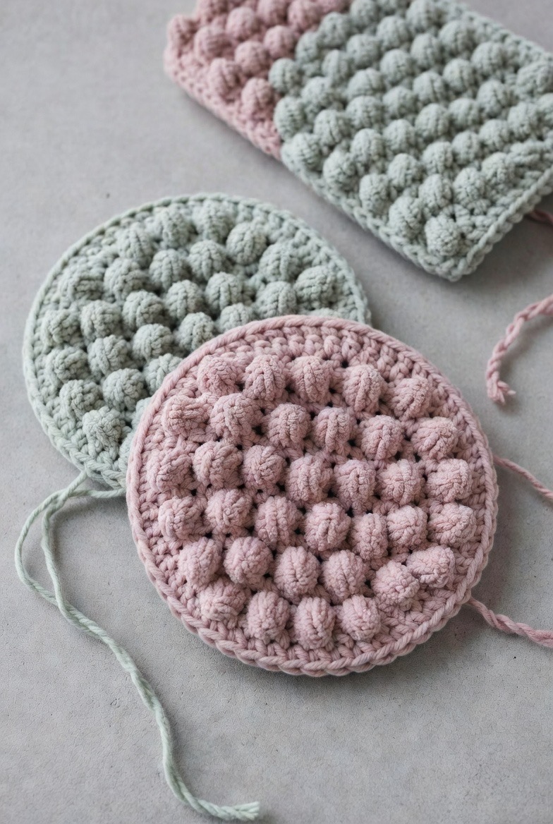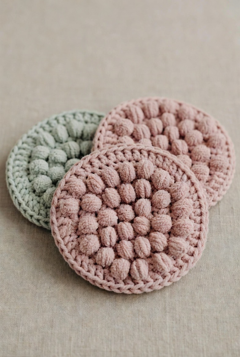If you’re looking for a face pad that provides a bit of a massage while you cleanse, the puff stitch is a game-changer. By pulling up multiple loops of yarn in one stitch, you create a raised, “bubbly” texture that is exceptionally soft yet effective at dislodging impurities. These pads are thicker and more absorbent than standard rounds, making them ideal for applying toners or essences. When worked in a soft sage or dusty rose, they add a spa-like tactile experience to your nightly double-cleanse that makes the routine feel like a treat rather than a chore.
