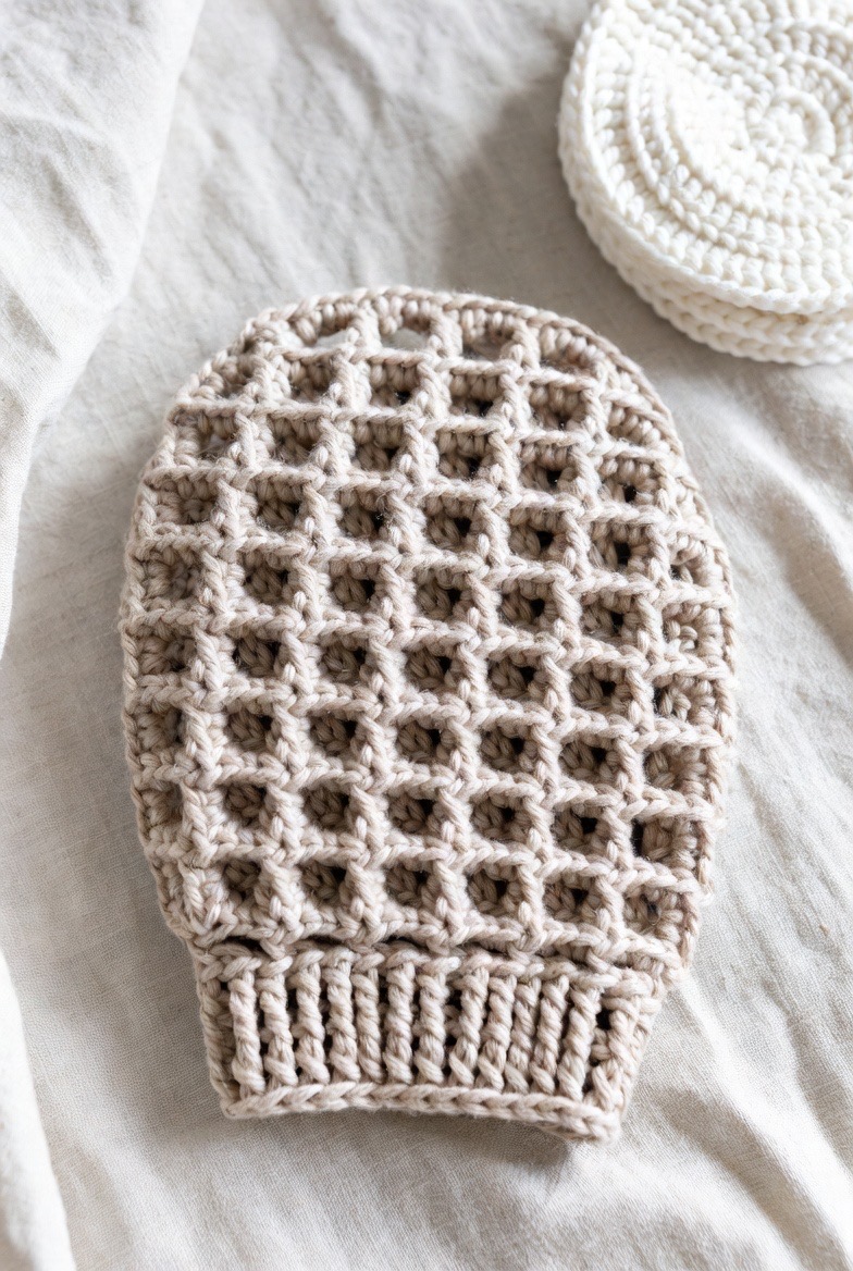 Traditional plastic loofahs are a breeding ground for bacteria and end up in landfills for centuries. A crochet “loopy” mitt uses a specific “loop stitch” to mimic the high-surface-area texture of a synthetic loofah using natural cotton or linen yarn. These loops create a massive amount of suds and provide a soft, springy sensation against the skin. Unlike plastic versions, you can simply toss this mitt into a hot wash cycle once a week to keep it completely hygienic. It’s the perfect way to transition to a plastic-free shower without giving up that “bubbly” feeling you love.