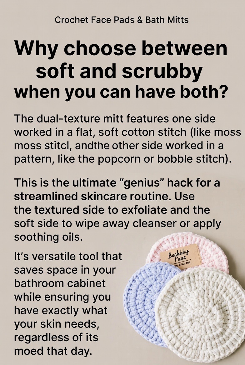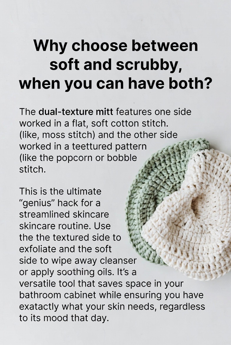 Why choose between soft and scrubby when you can have both? The dual-texture mitt features one side worked in a flat, soft cotton stitch (like the moss stitch) and the other side worked in a textured pattern (like the popcorn or bobble stitch). This is the ultimate “genius” hack for a streamlined skincare routine. Use the textured side to exfoliate and the soft side to wipe away cleanser or apply soothing oils. It’s a versatile tool that saves space in your bathroom cabinet while ensuring you have exactly what your skin needs, regardless of its mood that day.