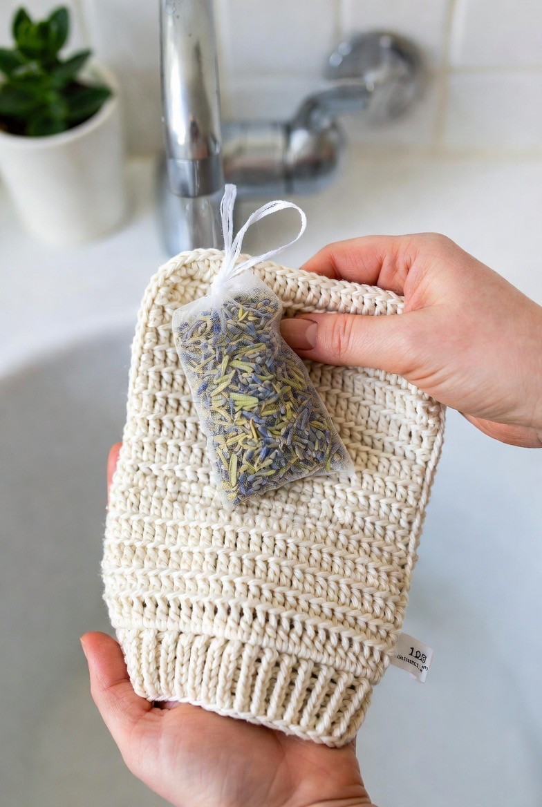In 2026, we are seeing a rise in “sensory-integrated” crochet. This bath mitt features a small, hidden pocket on the inside where you can tuck a sachet of dried lavender or eucalyptus. As the warm water hits the mitt, the natural oils from the herbs are released, creating a DIY aromatherapy session in your shower. The steam carries the scent, helping to clear your sinuses and calm your mind while you wash. It’s a simple addition that transforms a standard hygiene task into a full-sensory wellness experience that targets both the body and the brain.