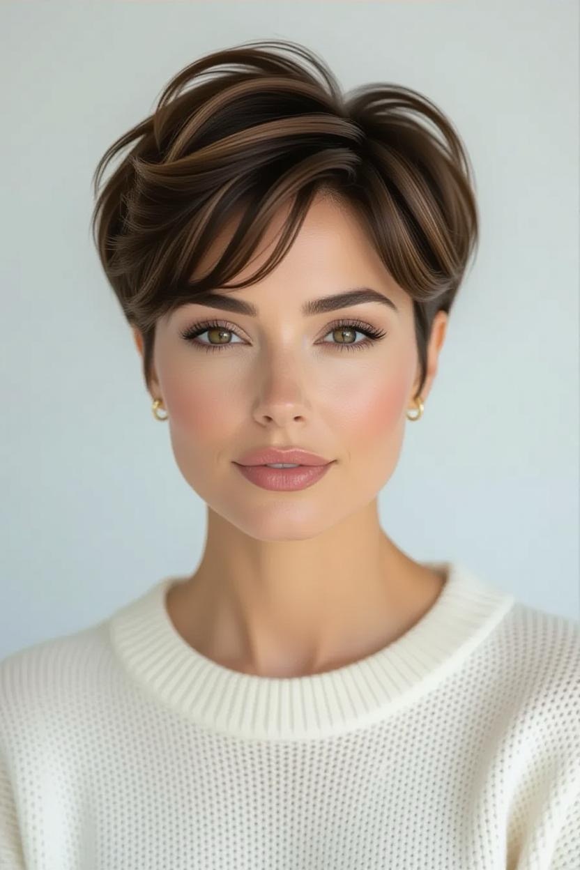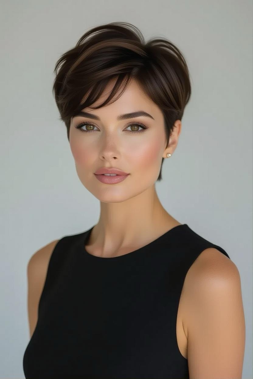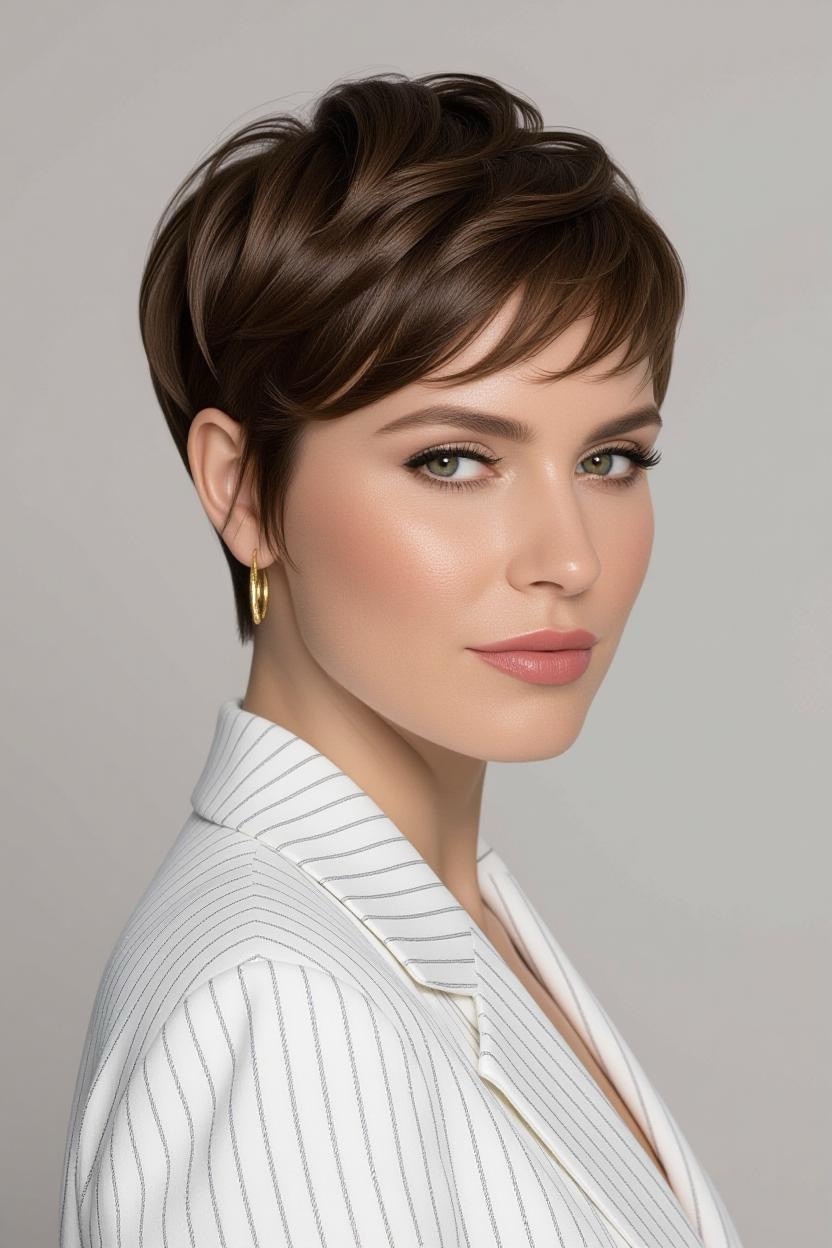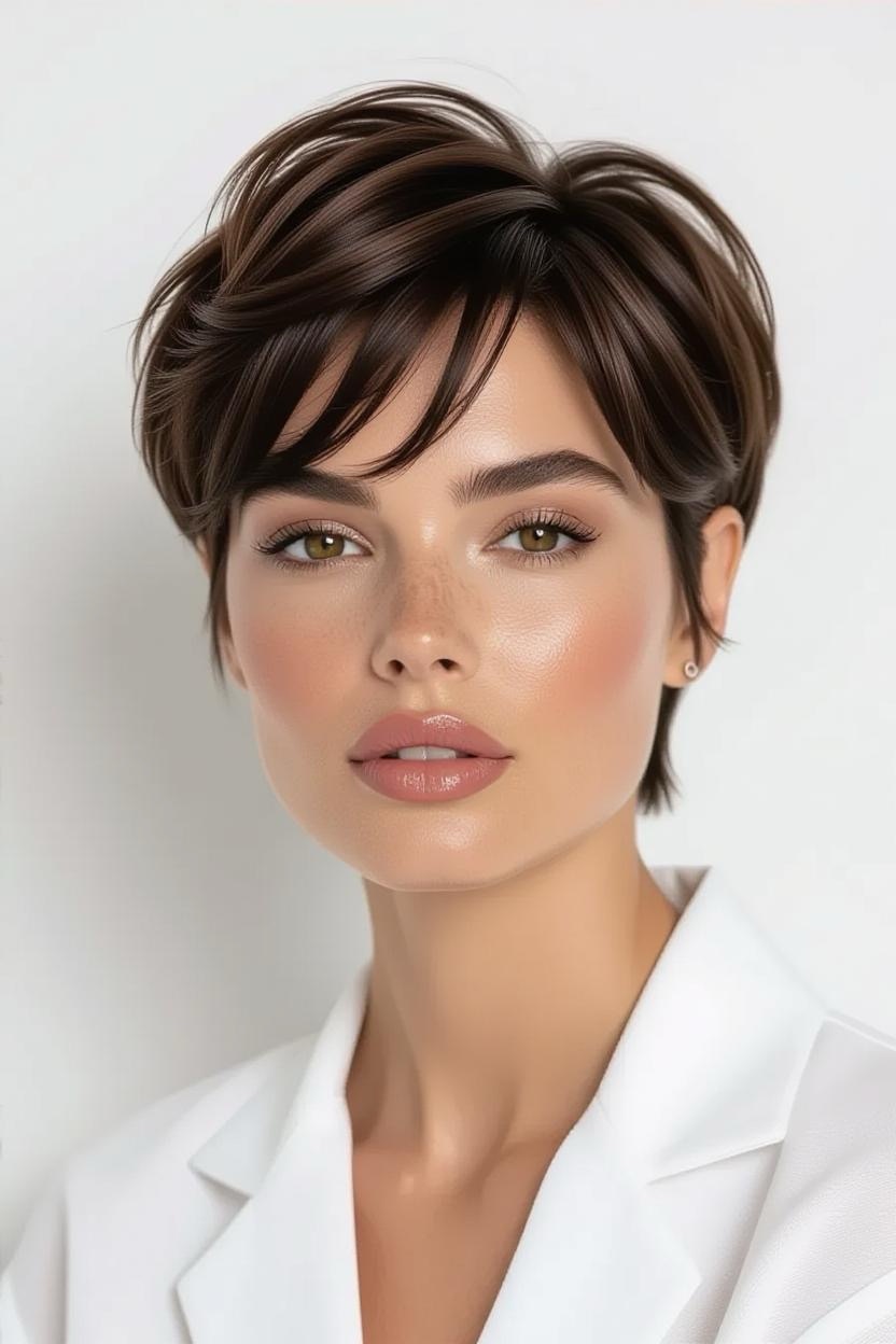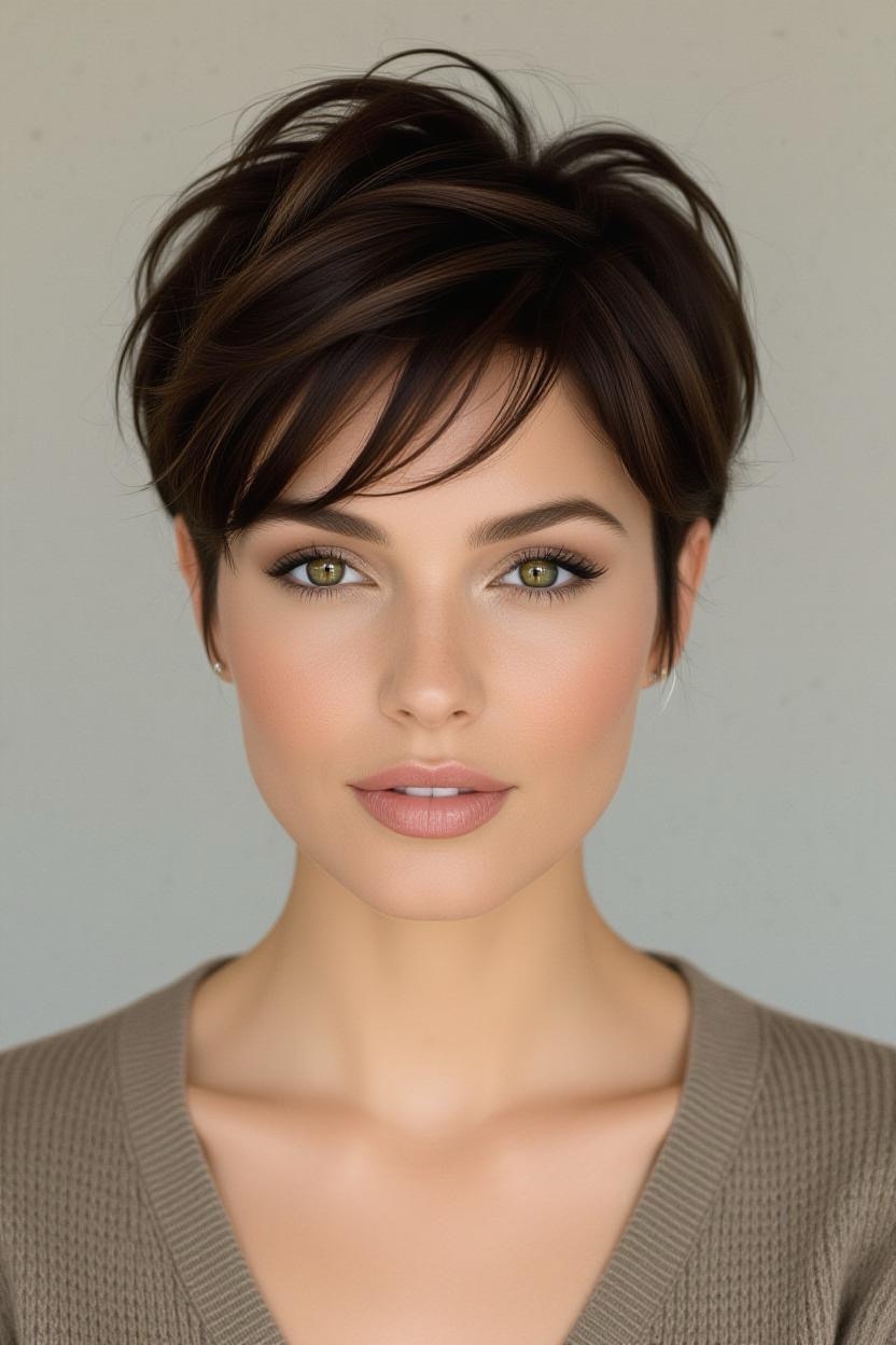 Side bangs paired with a short pixie add softness and femininity. They frame your face beautifully while keeping the back and sides short, making it an excellent style for thick hair.