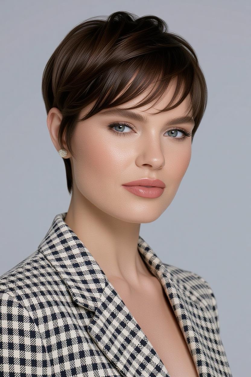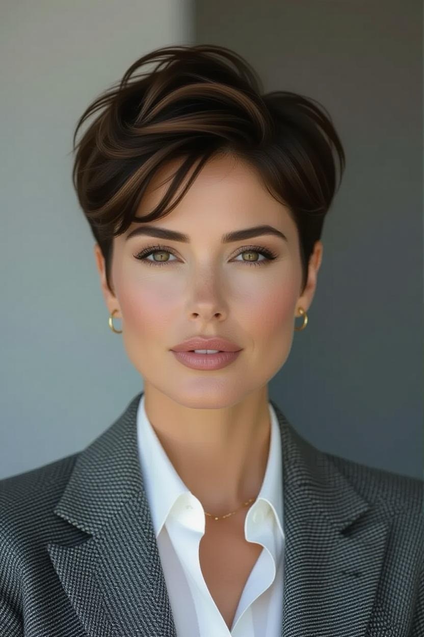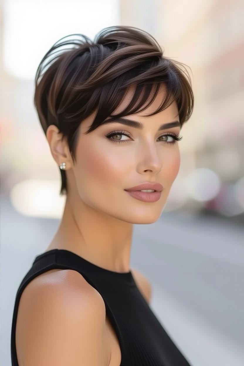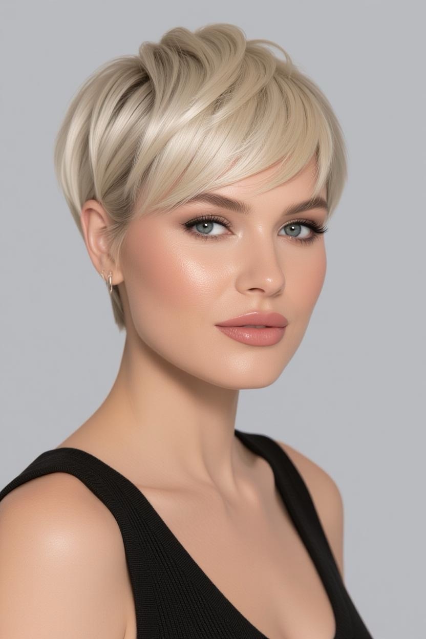 Side bangs paired with a short pixie add softness and femininity. They frame your face beautifully while keeping the back and sides short, making it an excellent style for thick hair.