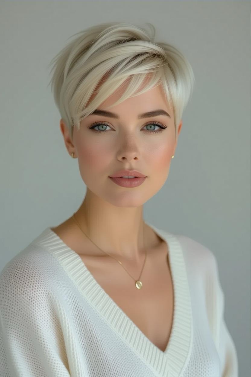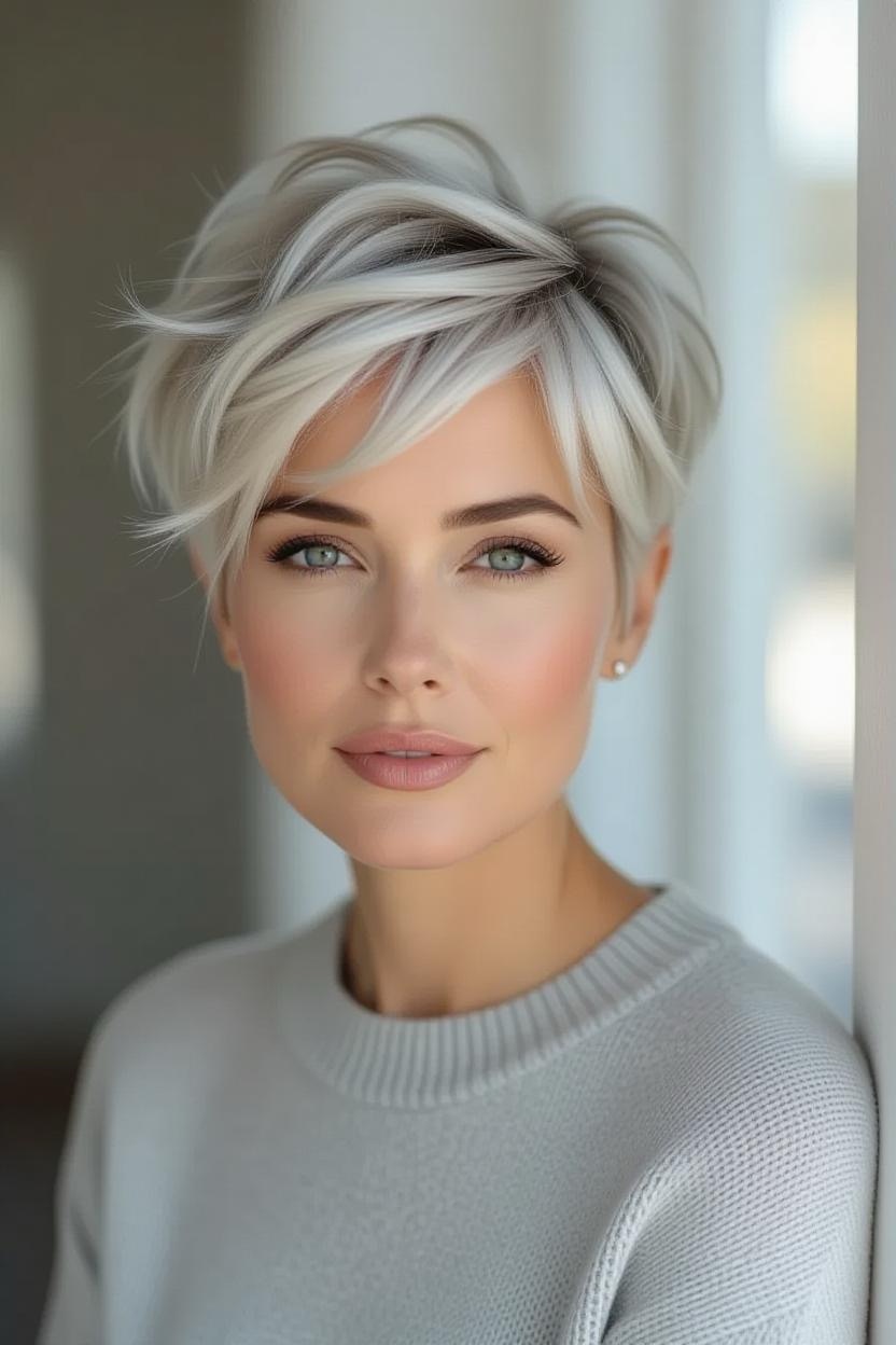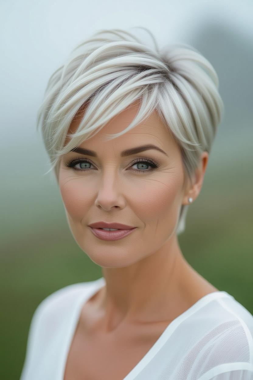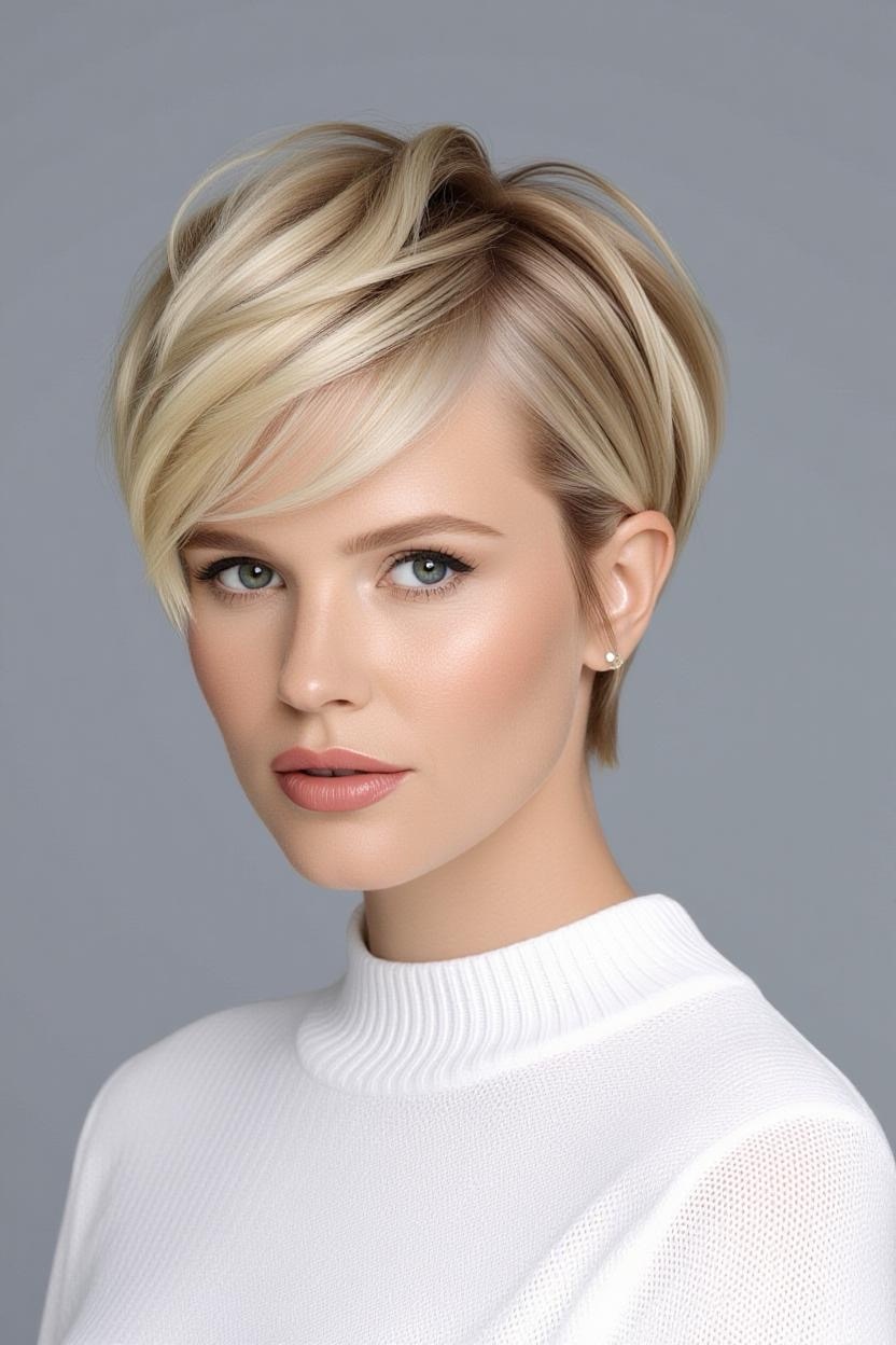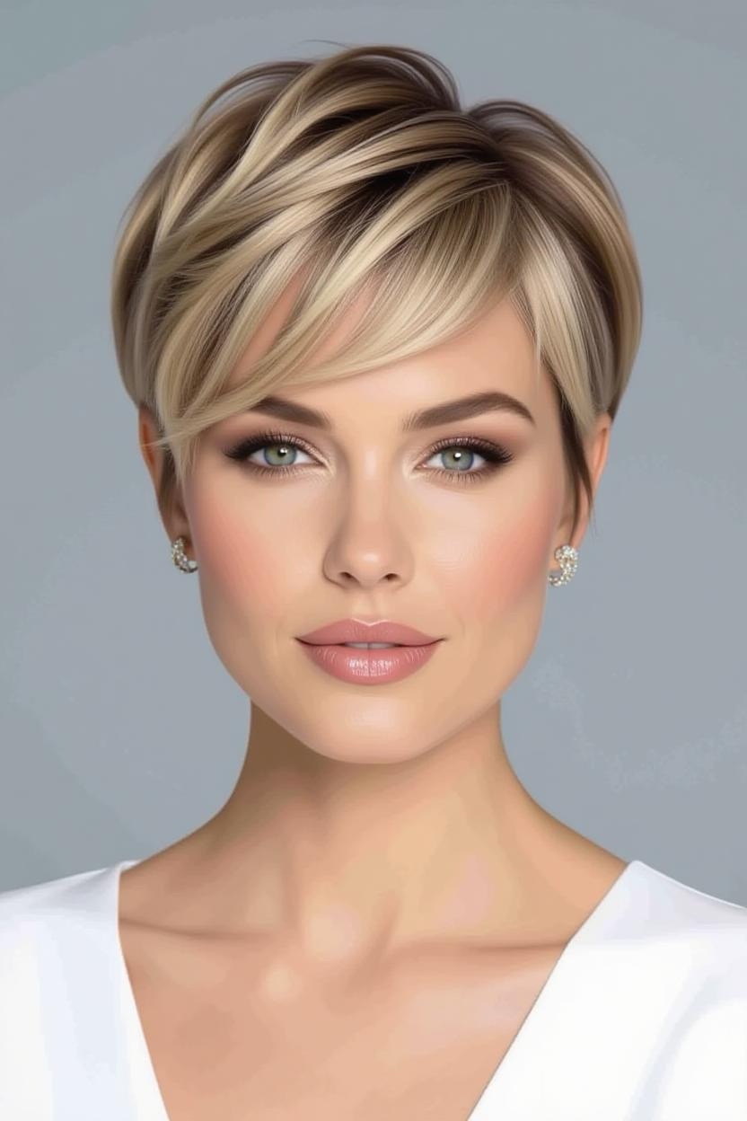 Side bangs paired with a short pixie add softness and femininity. They frame your face beautifully while keeping the back and sides short, making it an excellent style for thick hair.