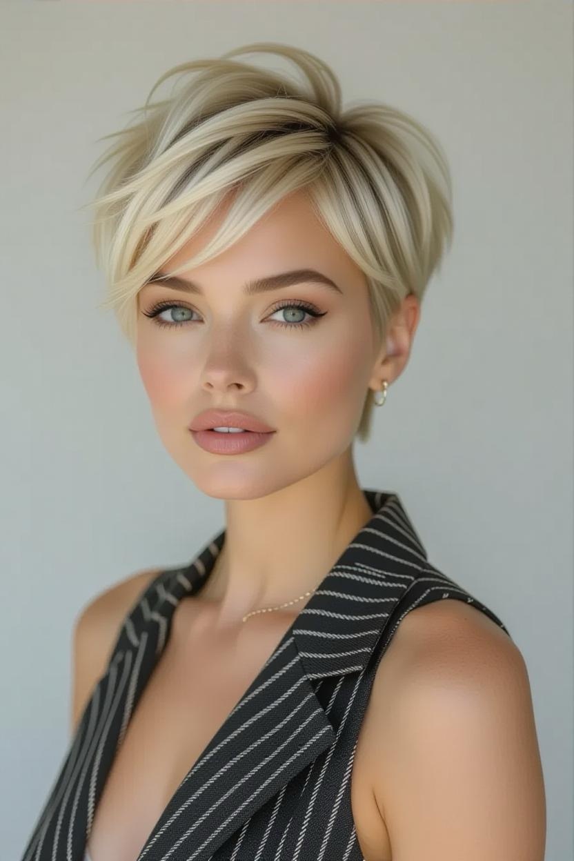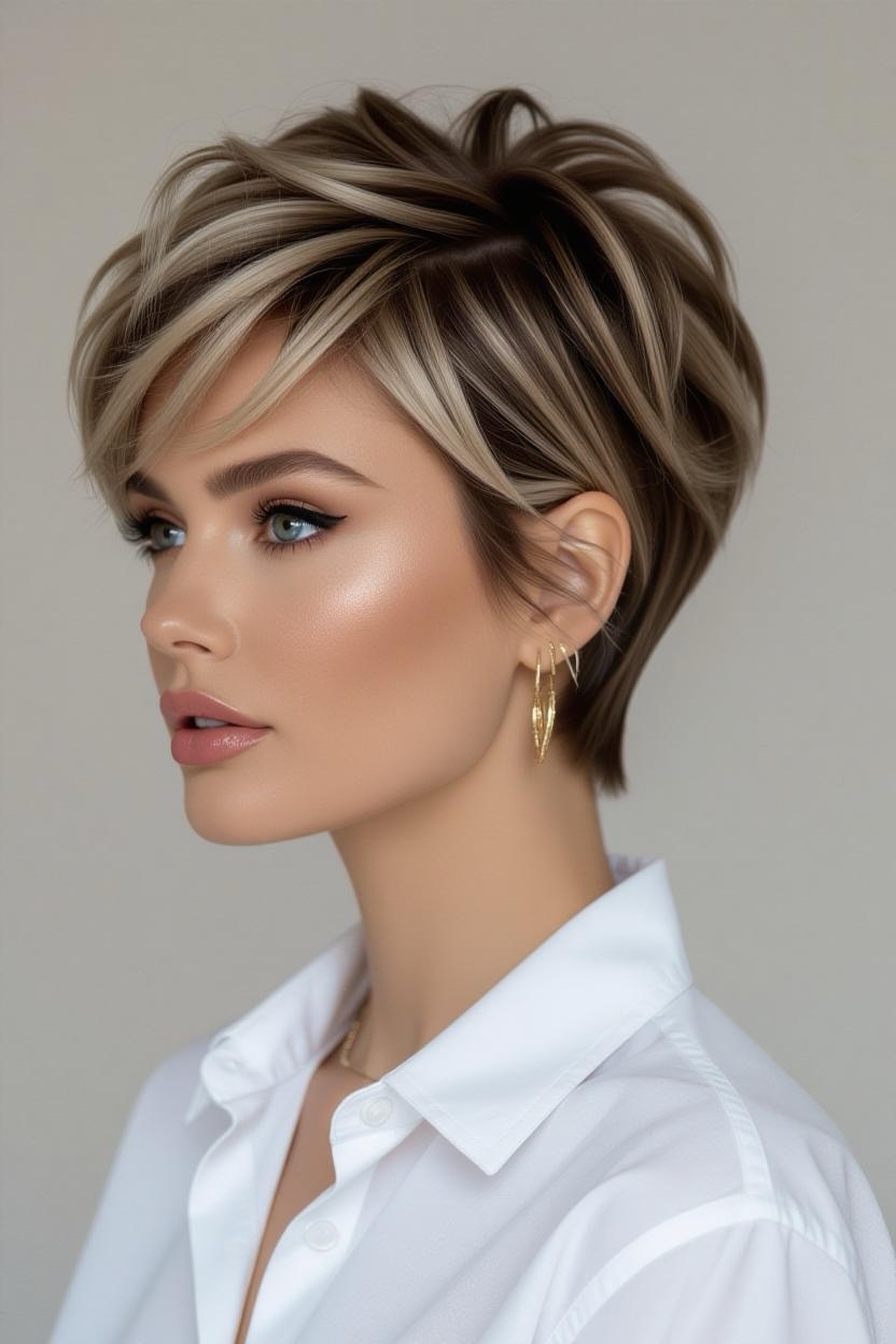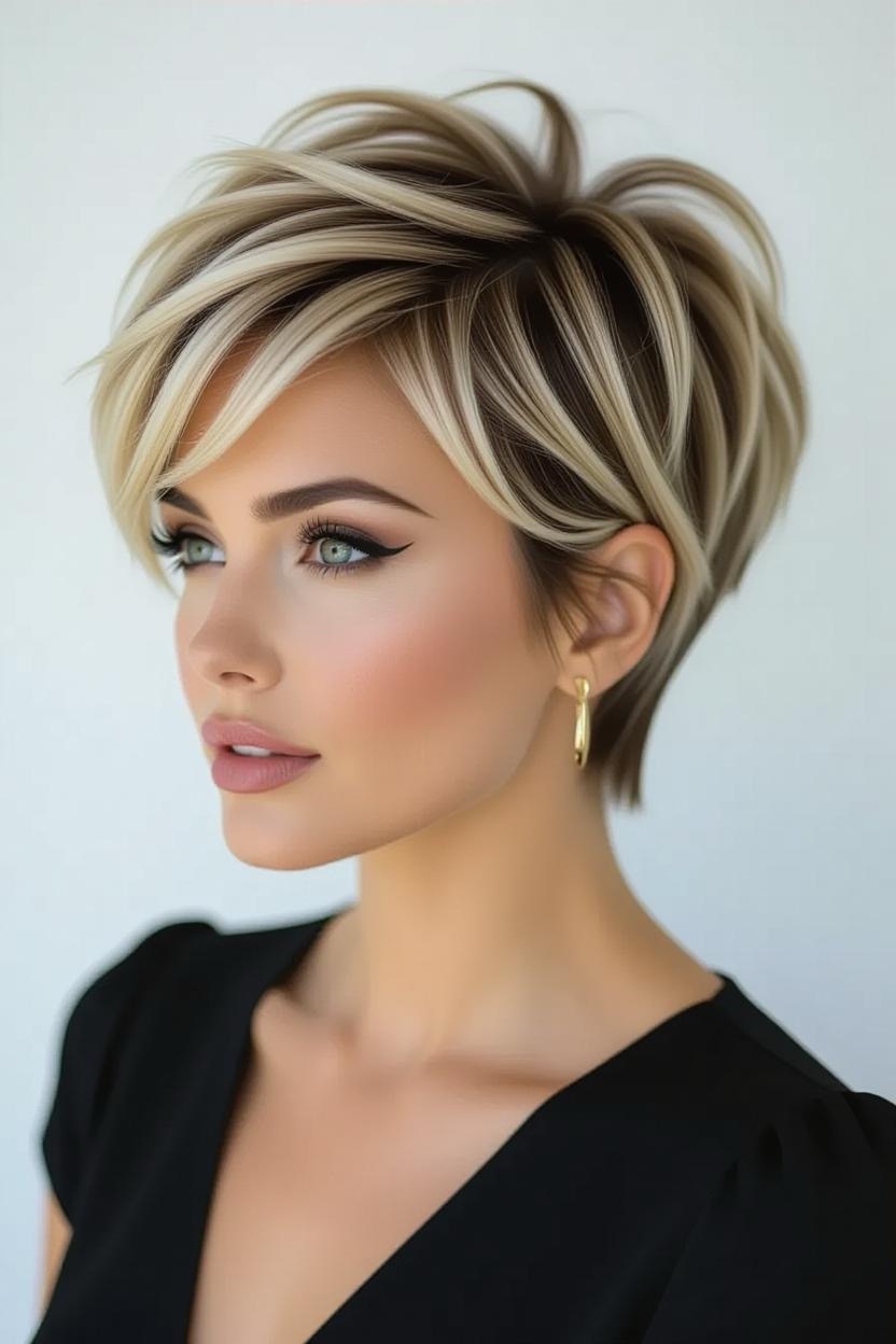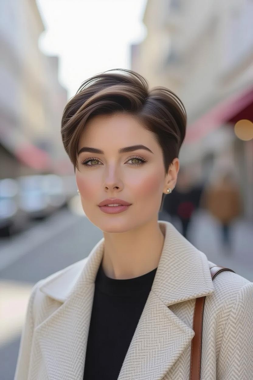 Bold and fierce, shaved sides give your pixie an instant rocker vibe. The thick top contrasts beautifully with sleek sides, creating a dramatic yet stylish look.