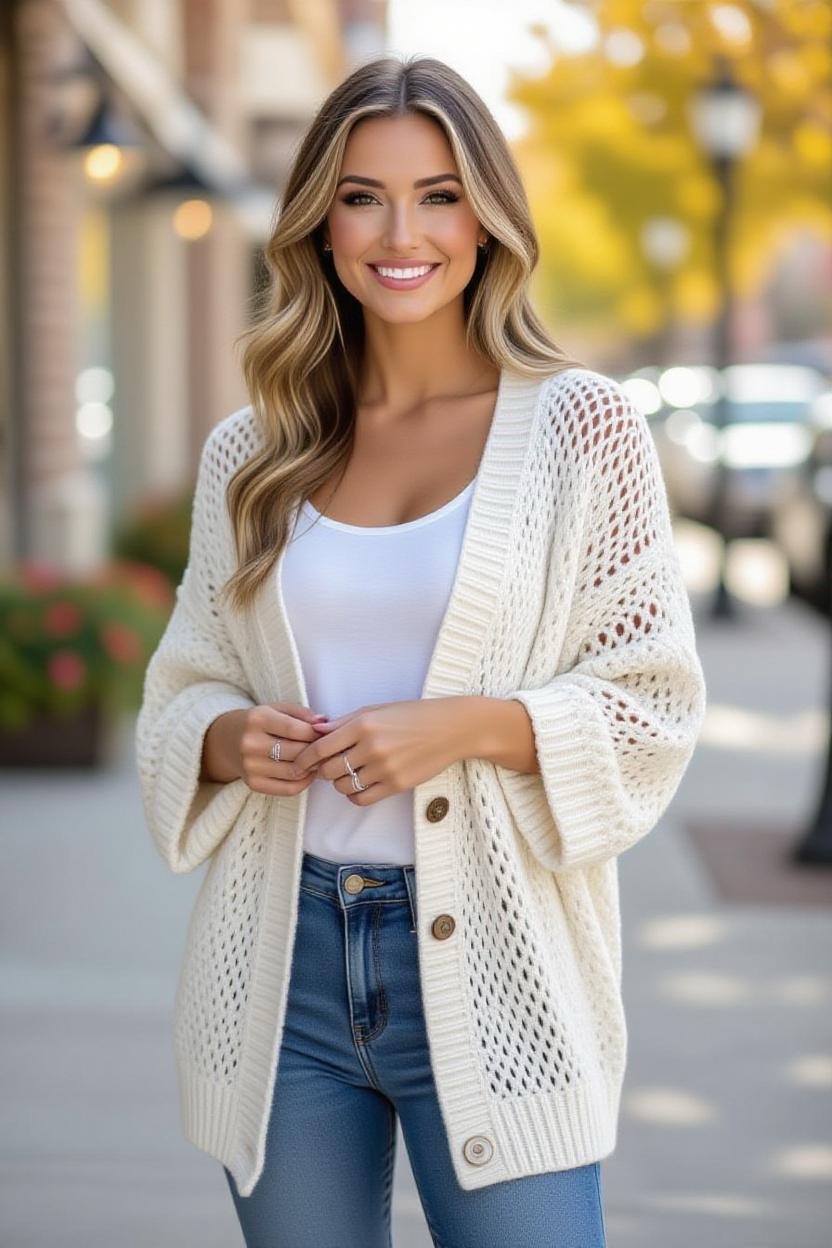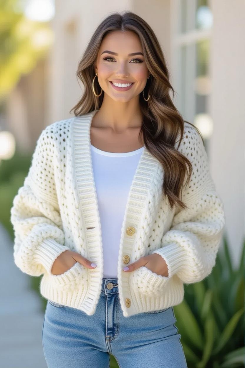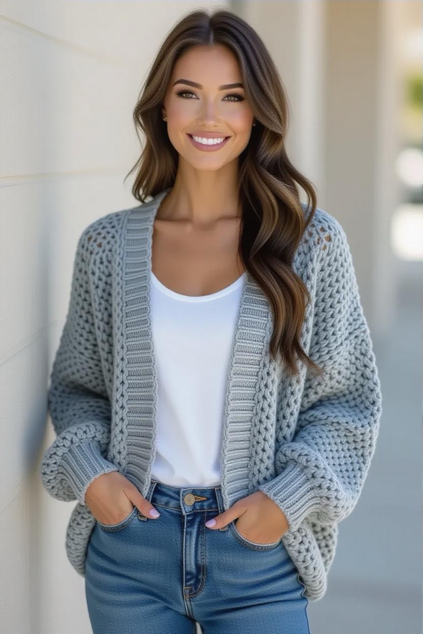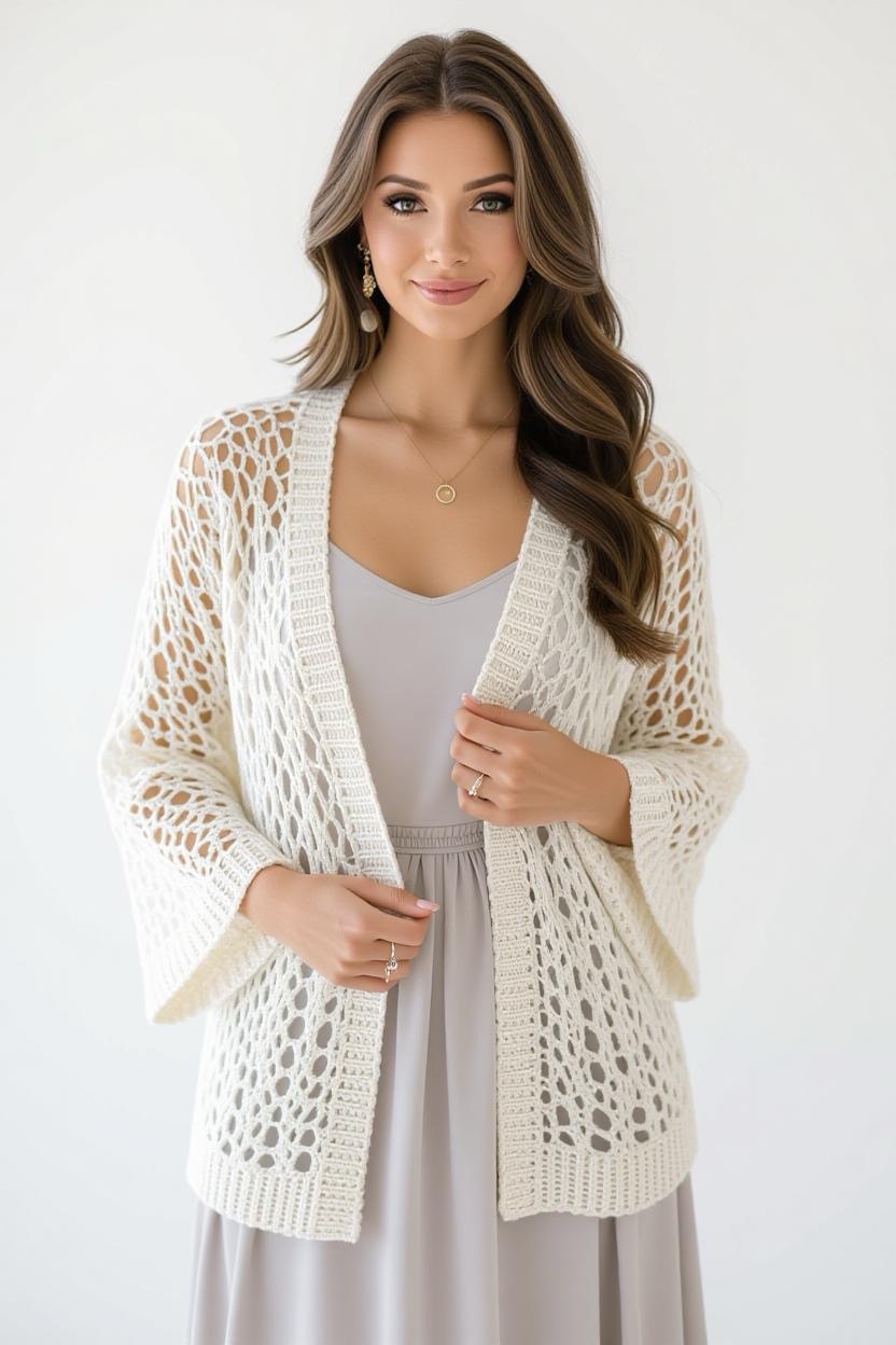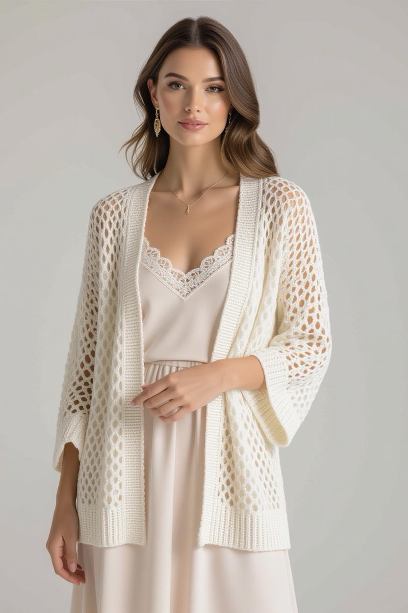Delicate stitches and airy patterns make lacy crochet cardigans elegant layering pieces. They’re perfect for date nights, weddings, or anytime you want a softer, more romantic look. Pair them with flowy dresses or skirts for a dreamy outfit.
