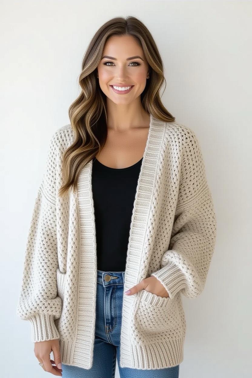 Designed for comfort and ease, this cardigan has a relaxed, open front with no buttons or closures. It’s perfect for layering and feels like wrapping yourself in a warm hug. Great for everyday use, it works in both neutral and bold yarn colors.
