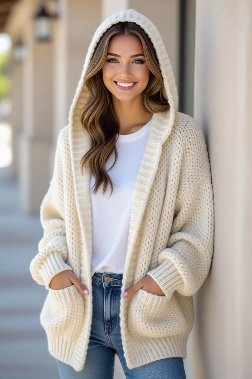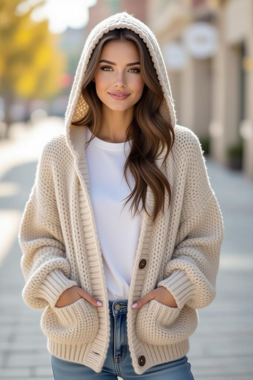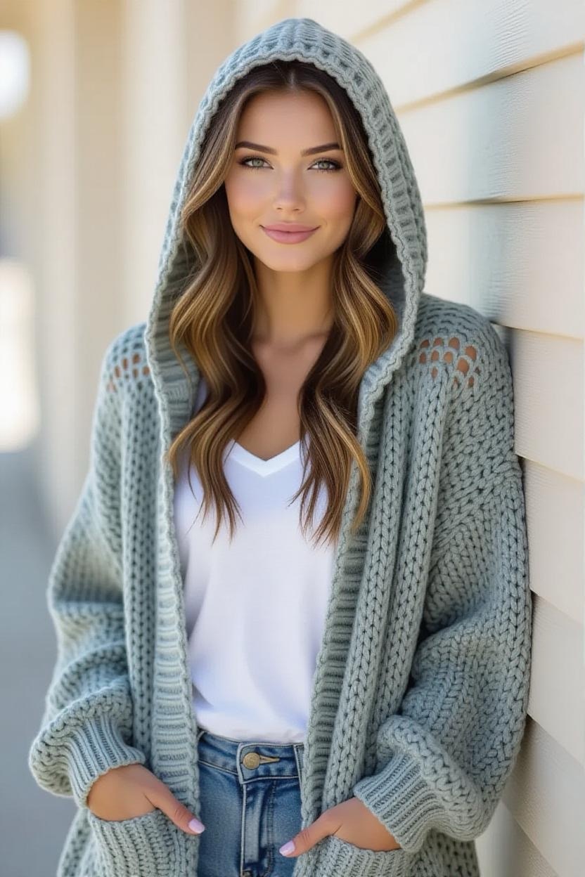 Add a casual, youthful vibe to your outfit with a crochet hooded cardigan. Not only does the hood add extra warmth, but it also gives the piece a fun, laid-back style. This design works great with soft yarn blends for a cozy, comfortable feel.