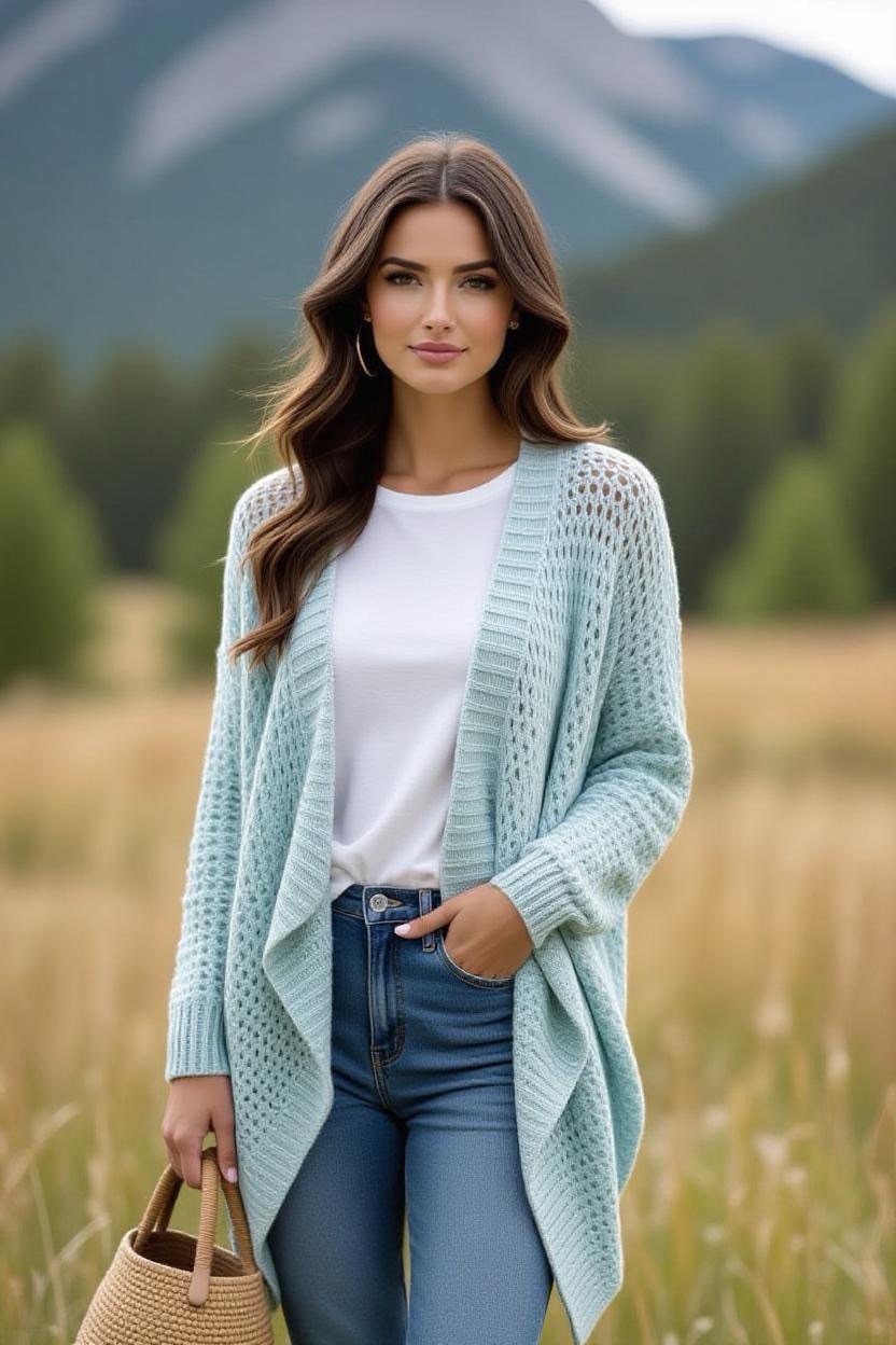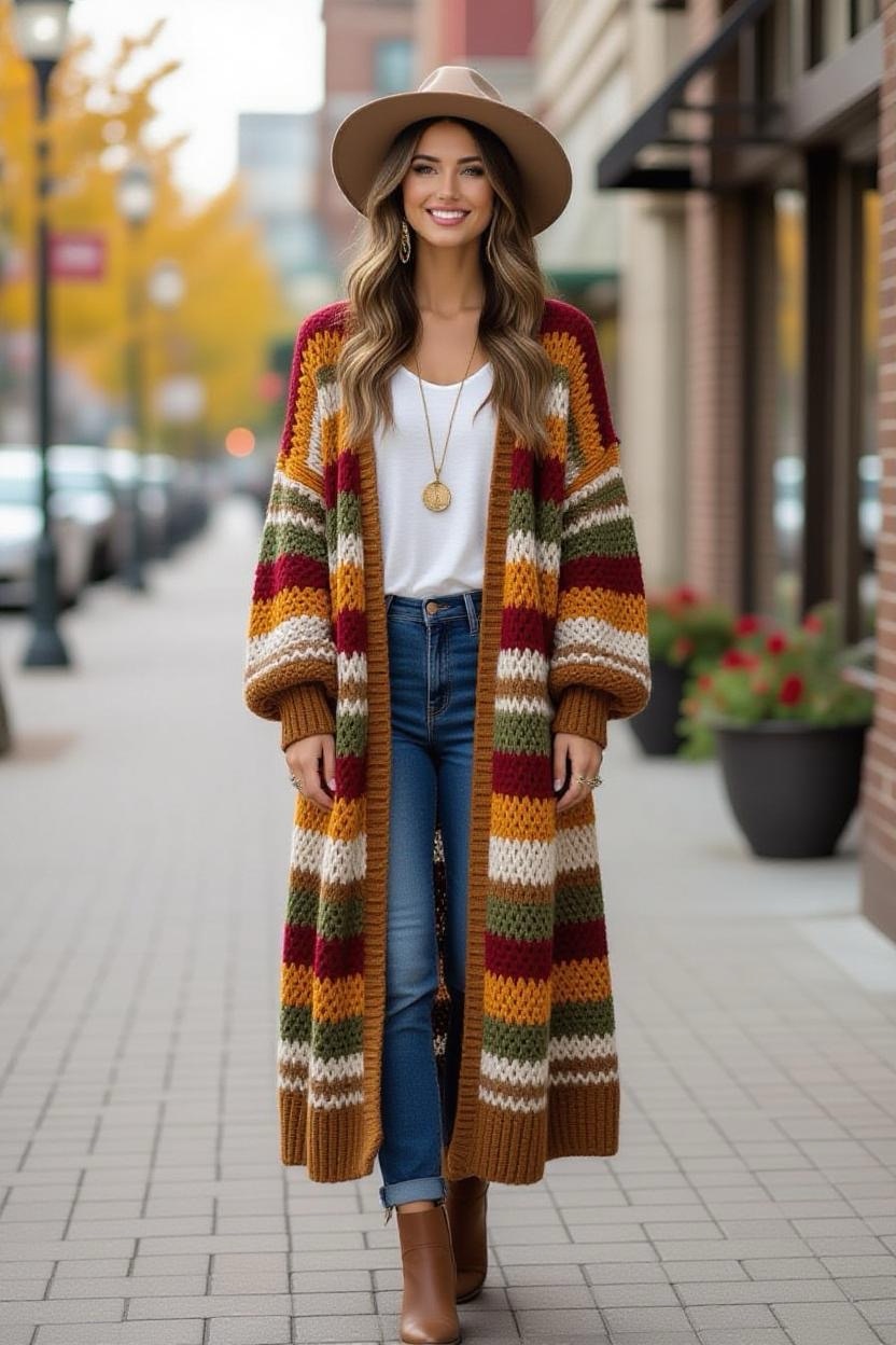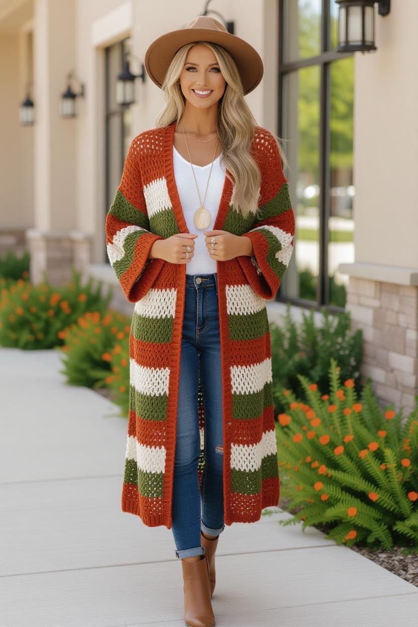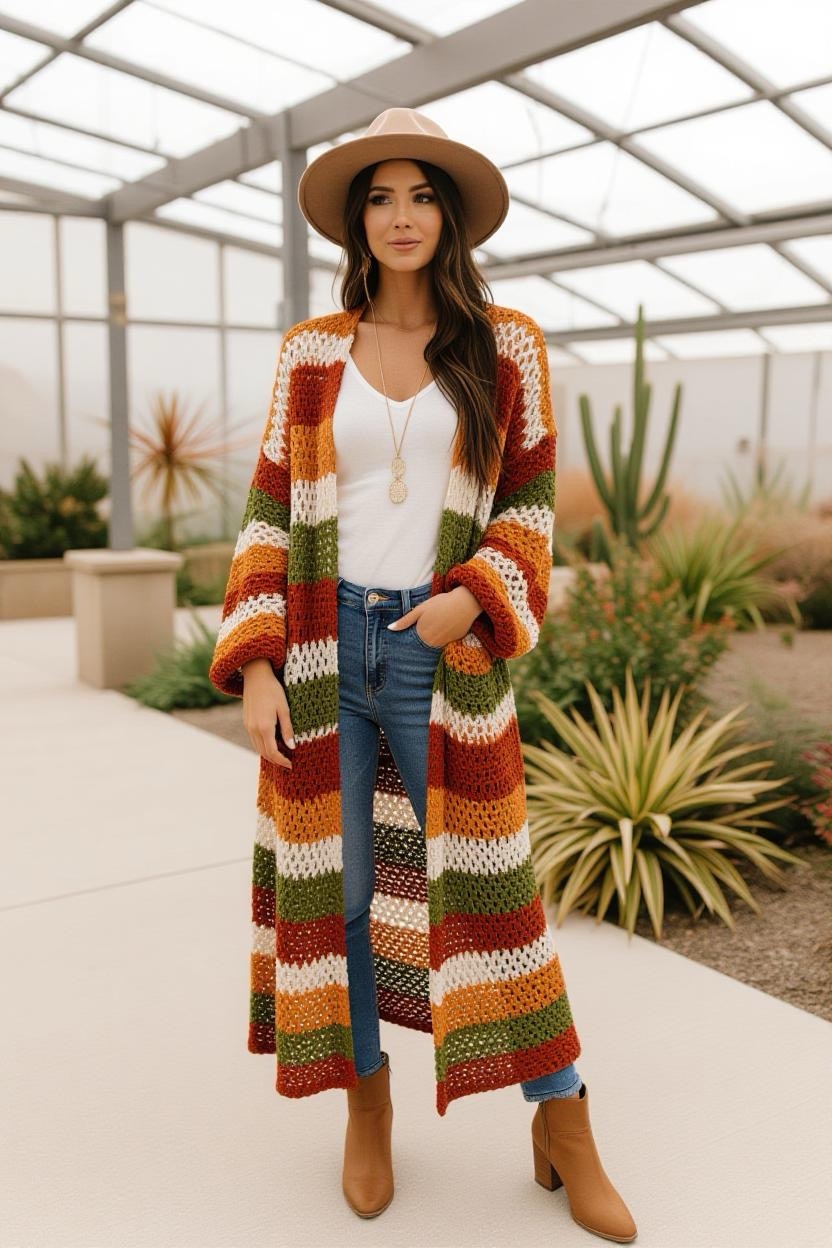 For a dramatic yet practical layer, a longline crochet duster cardigan is a stylish choice. Falling mid-calf or even floor-length, it elongates your silhouette while keeping you warm. Try it in solid earthy shades for everyday wear, or go bold with stripes for a statement piece.
