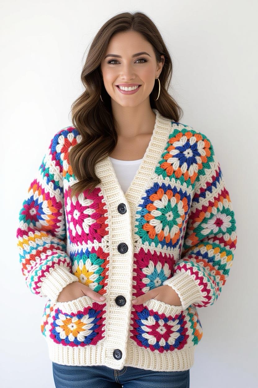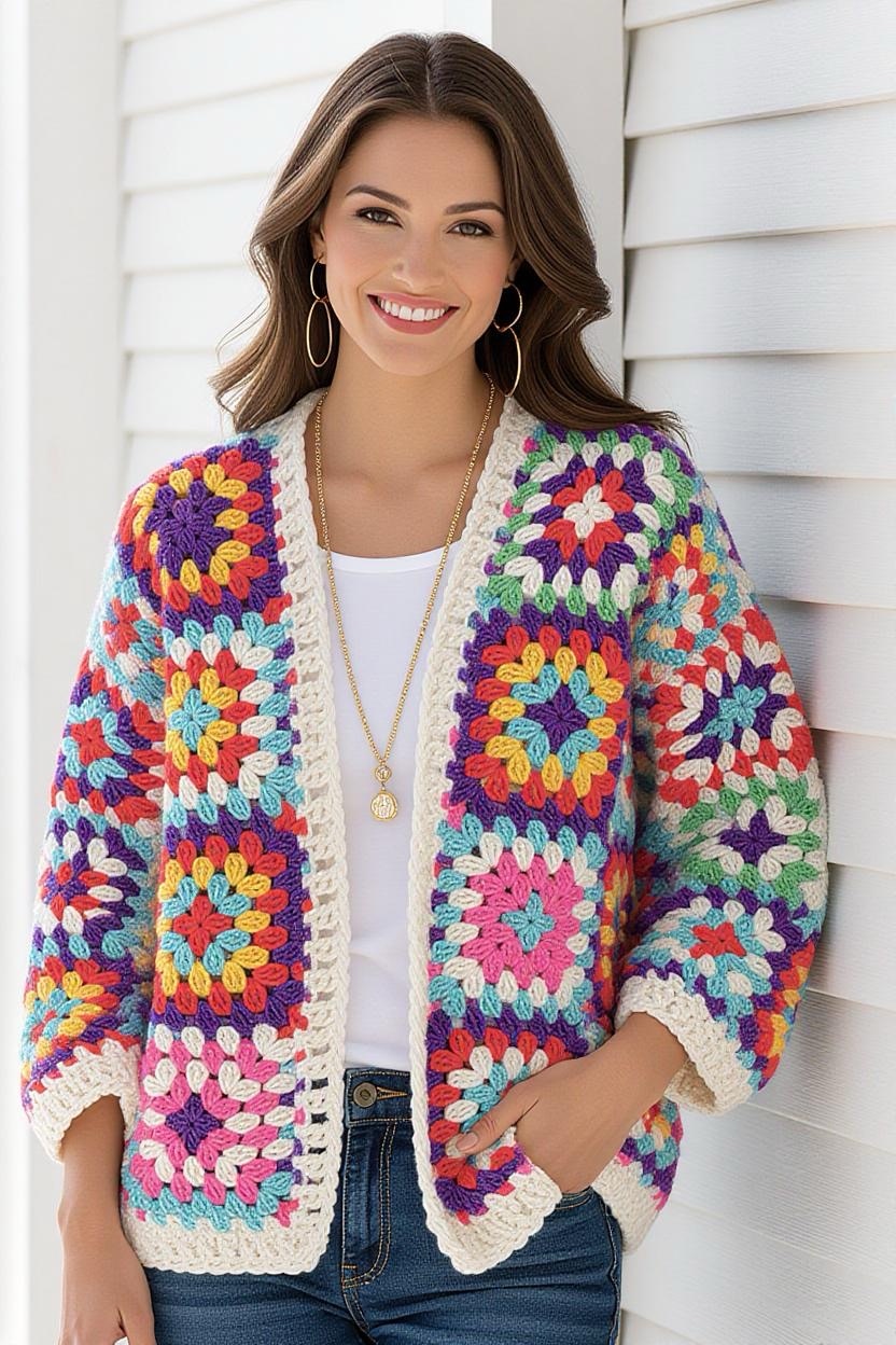 The granny square cardigan is a crochet classic that never goes out of style. This design allows you to mix and match colors, making every cardigan one-of-a-kind. You can keep it vibrant with bright squares or opt for a minimalist vibe with neutral tones.