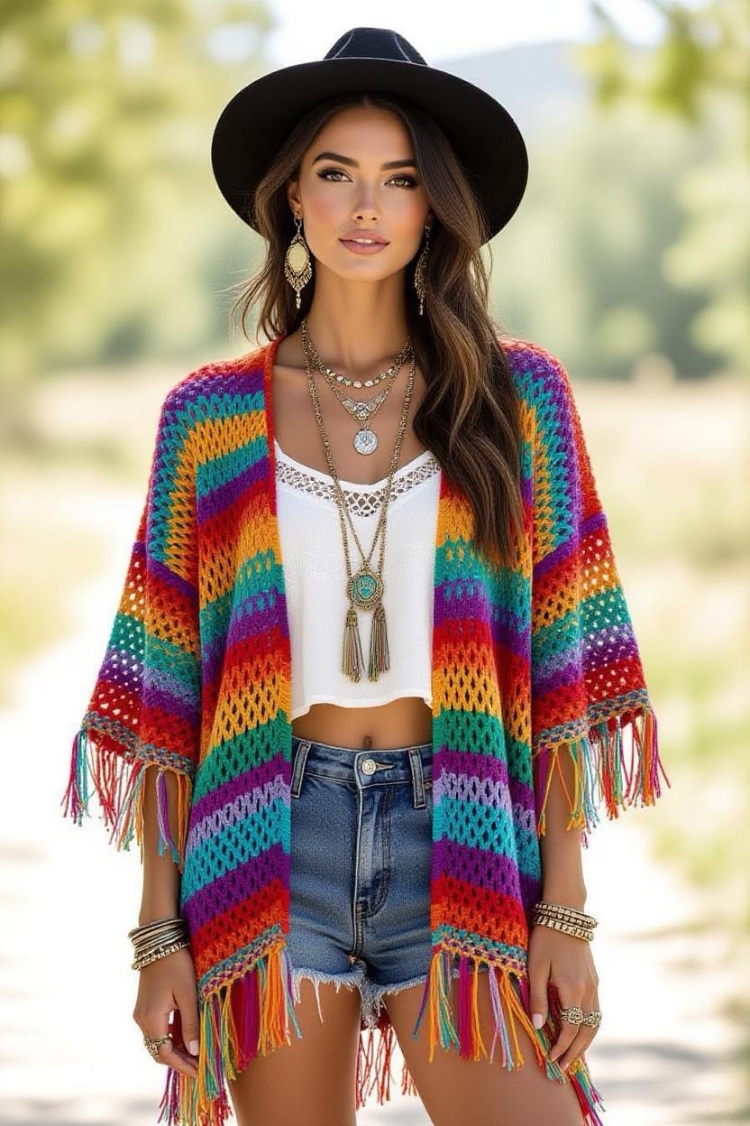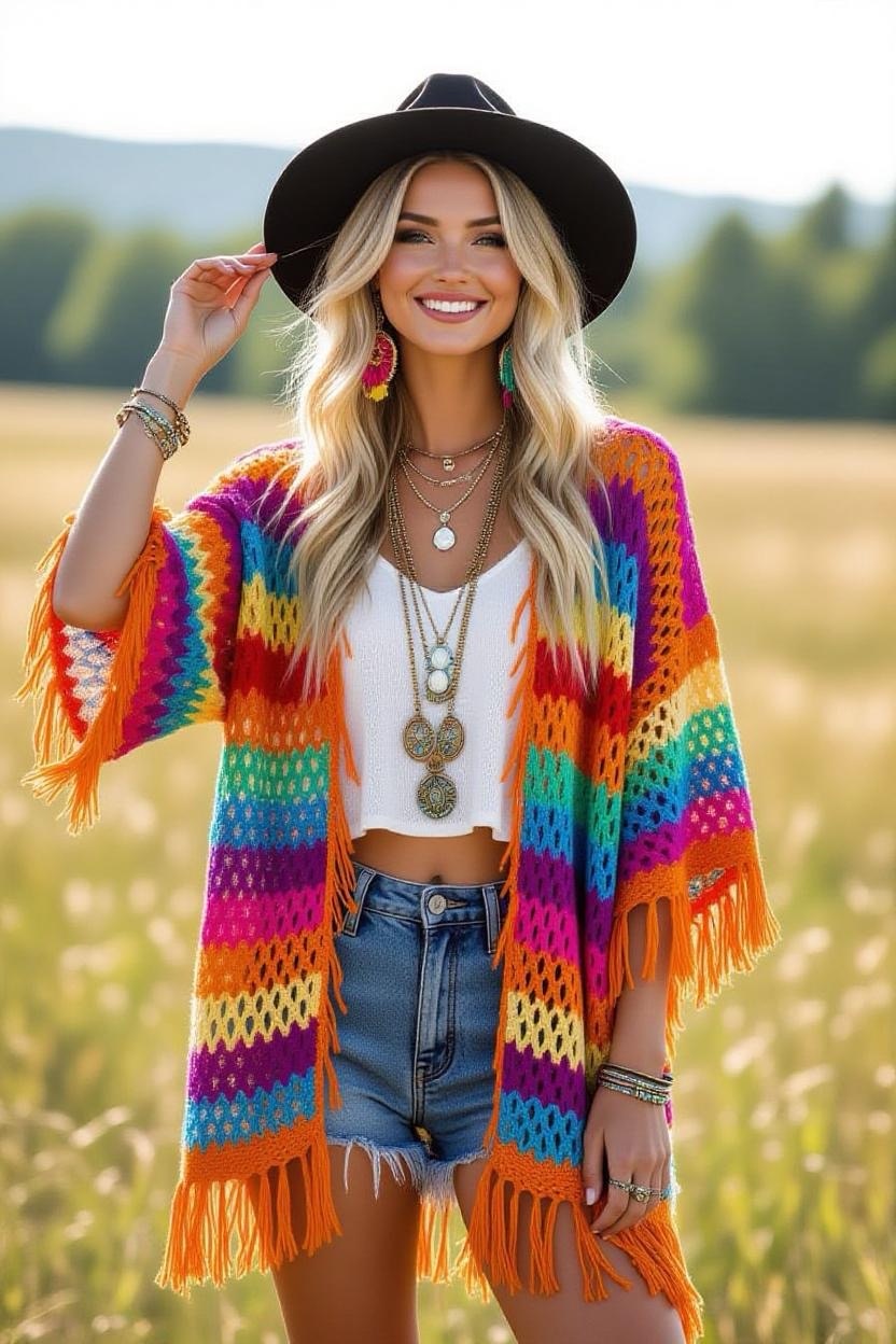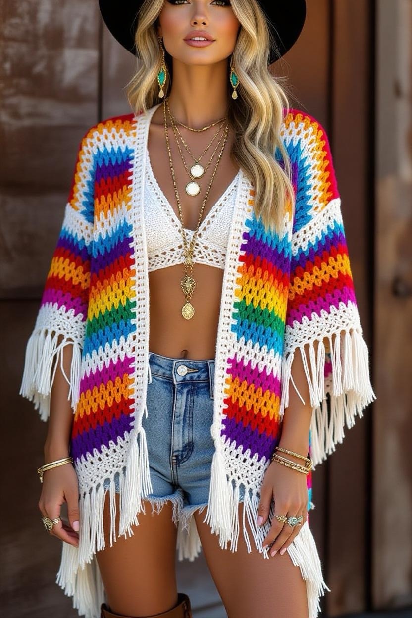 Designed with bold colors, fringe, and open lacework, this cardigan is ideal for festival fashion. It’s playful, free-spirited, and perfect for outdoor events. Pair it with denim shorts, boots, and layered jewelry for a true boho festival look.