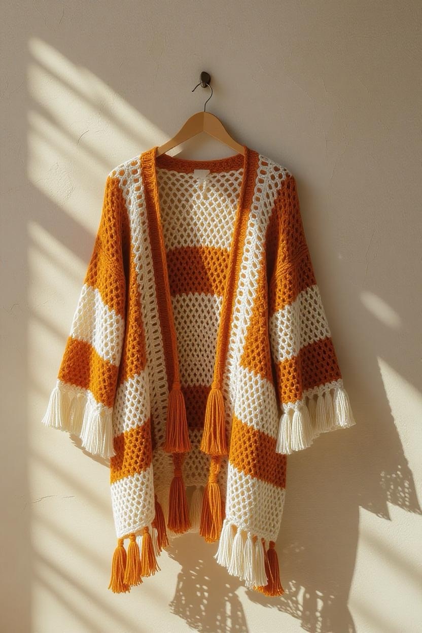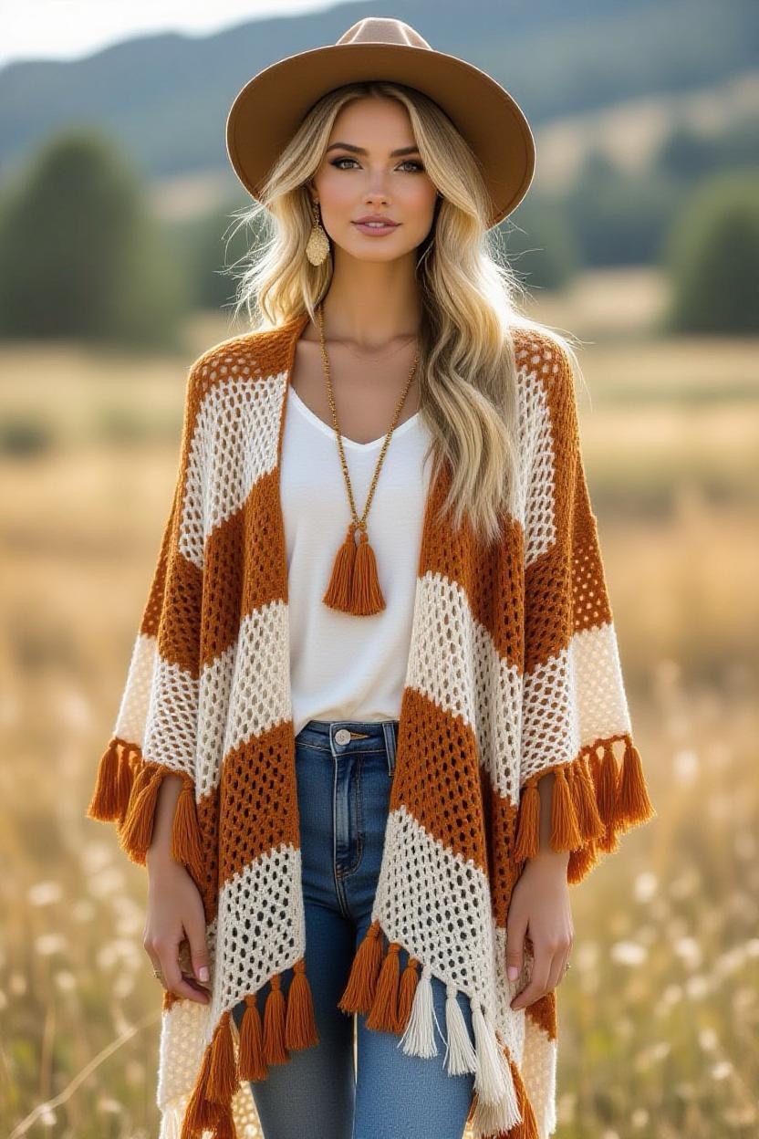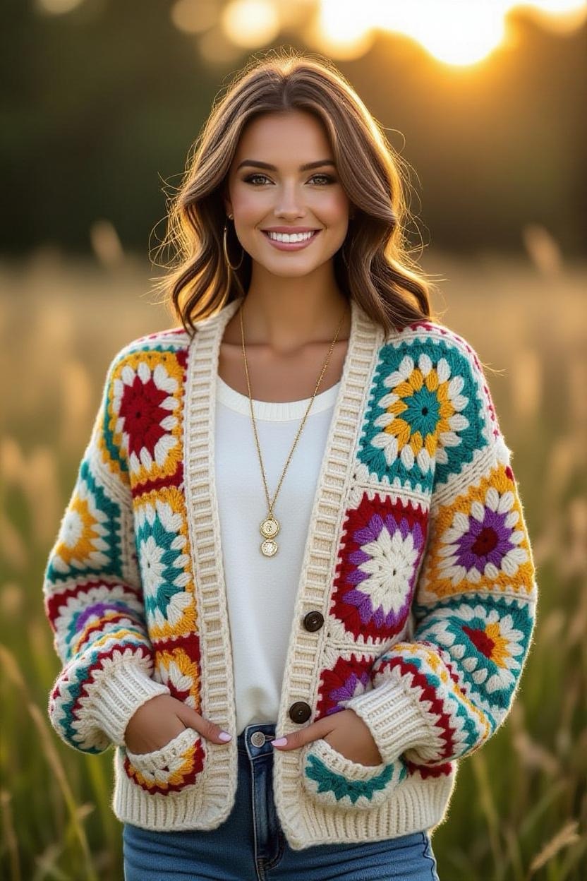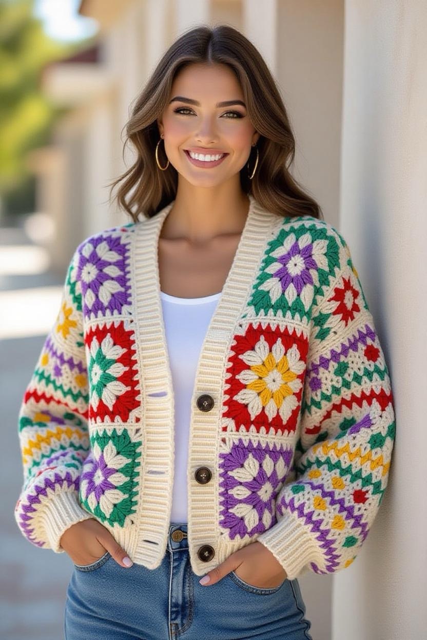 Designed with bold colors, fringe, and open lacework, this cardigan is ideal for festival fashion. It’s playful, free-spirited, and perfect for outdoor events. Pair it with denim shorts, boots, and layered jewelry for a true boho festival look.