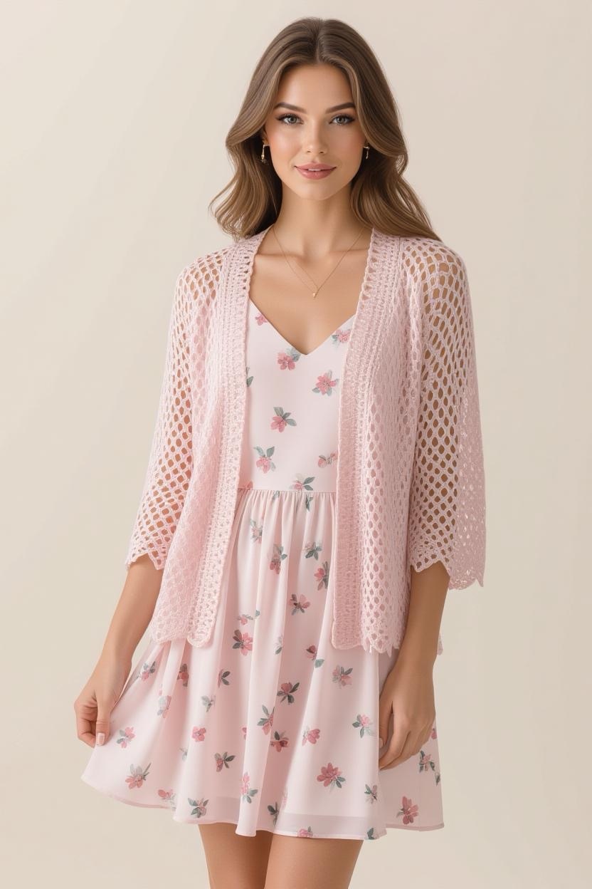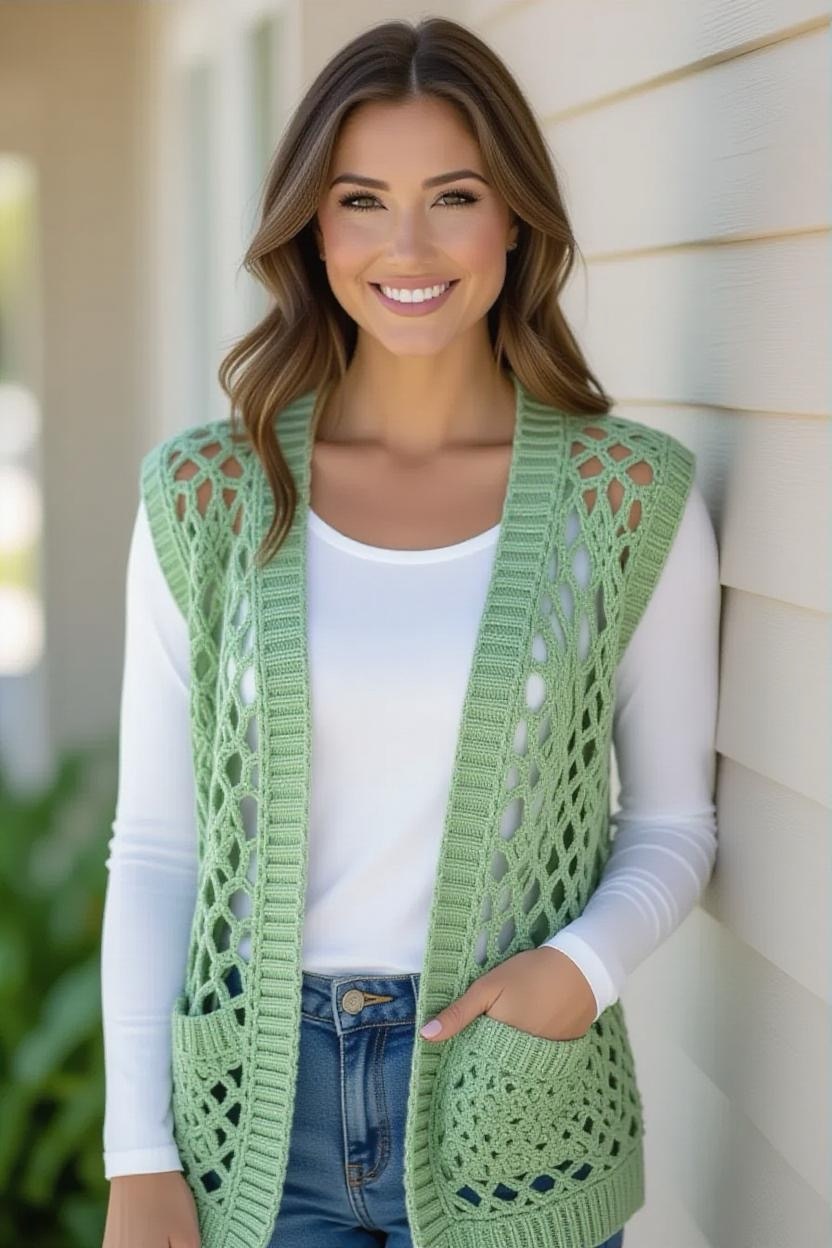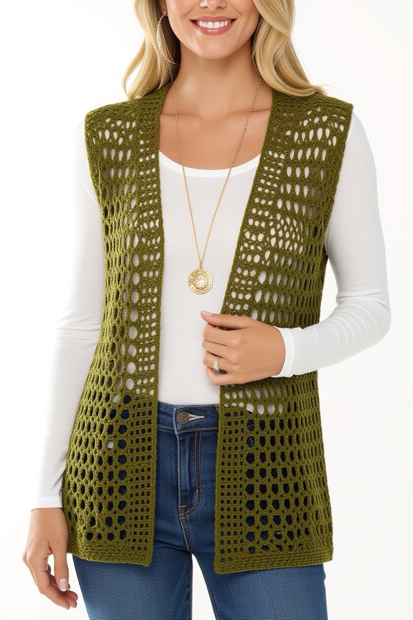 For transitional weather, a sleeveless crochet cardigan is the perfect layering piece. It keeps you stylish without adding too much warmth. Pair it with long-sleeve tops in fall or tank tops in summer for year-round wearability.